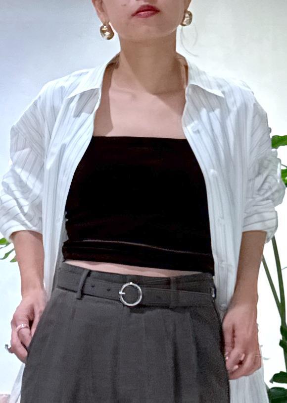 キレイめなパンツと合わせるとカッチリしすぎちゃうので、短丈のベロアキャミソールをでヘルシーに合わせました!