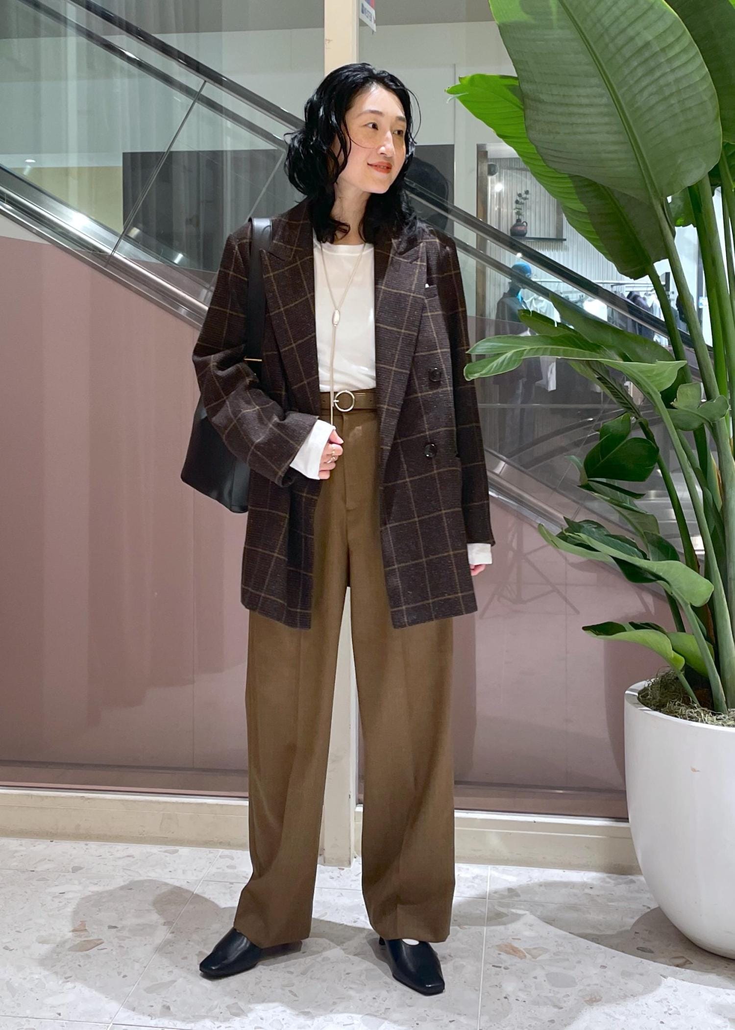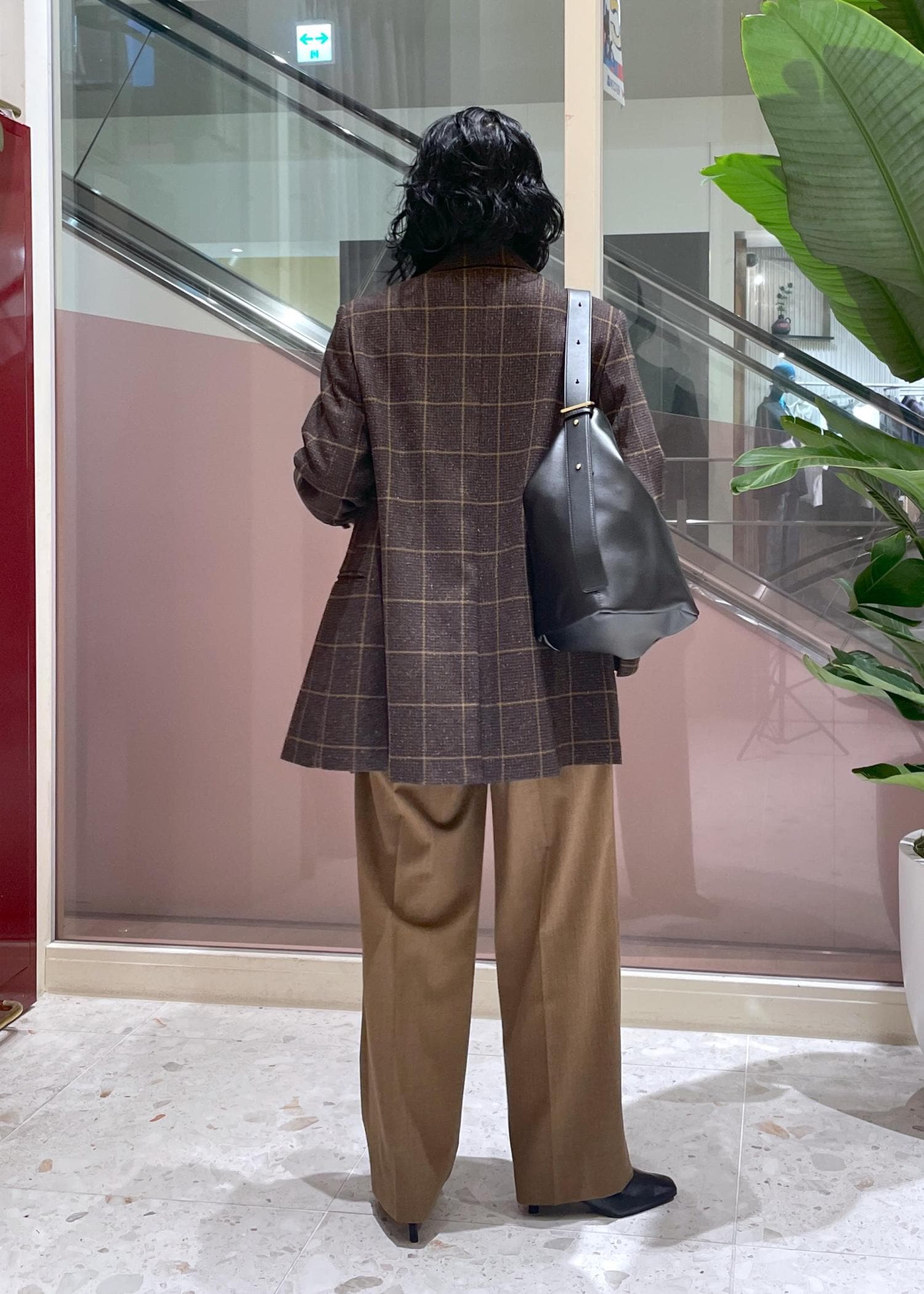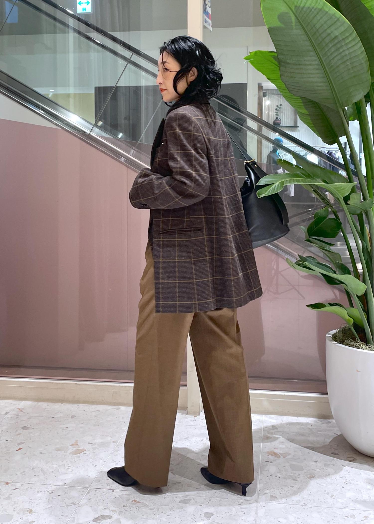 リアバイしたお気に入りのツィードジャケットですが、チェックのブラウンの方をメインに、オフィス使いするなら?とイメージしてスタイリングしてみました。