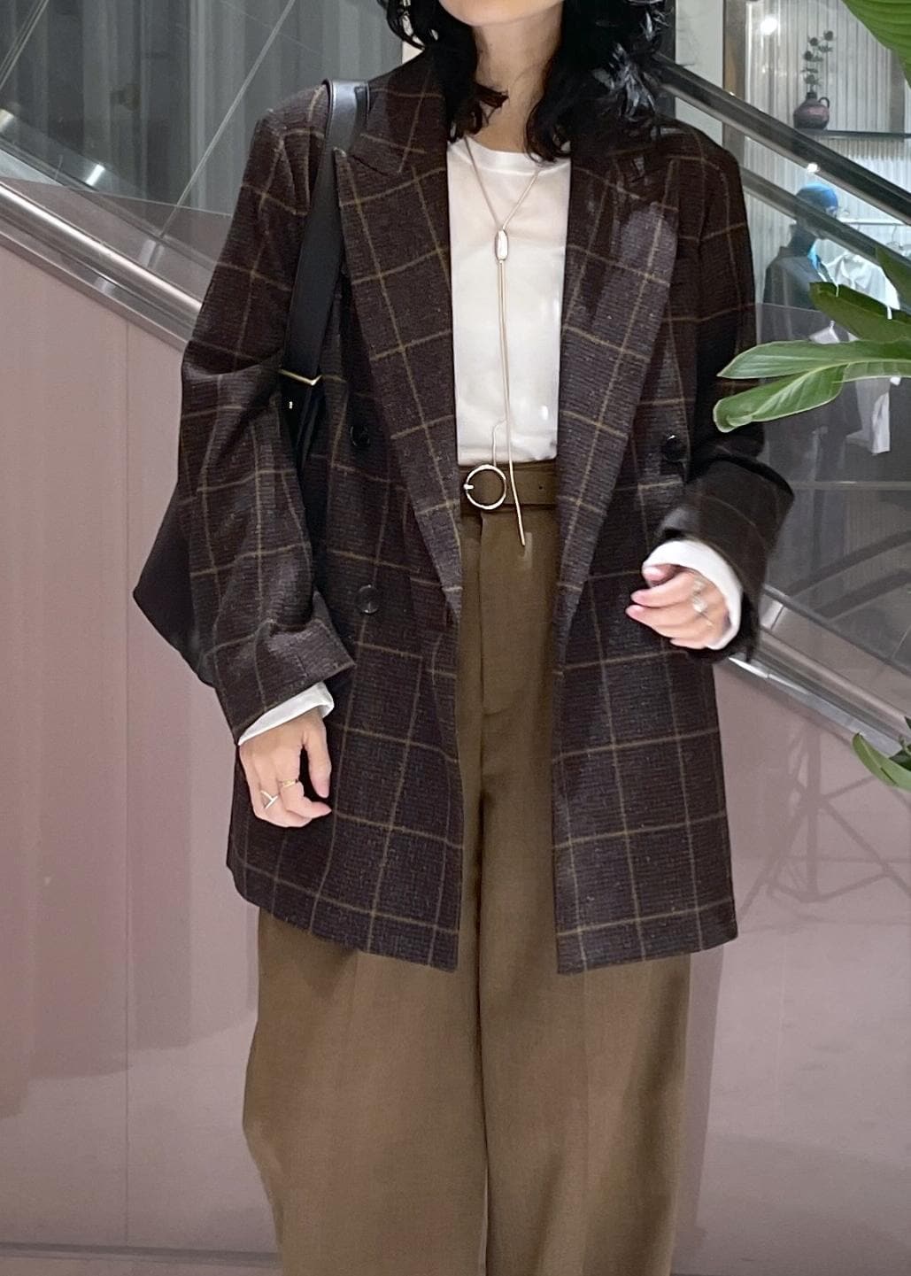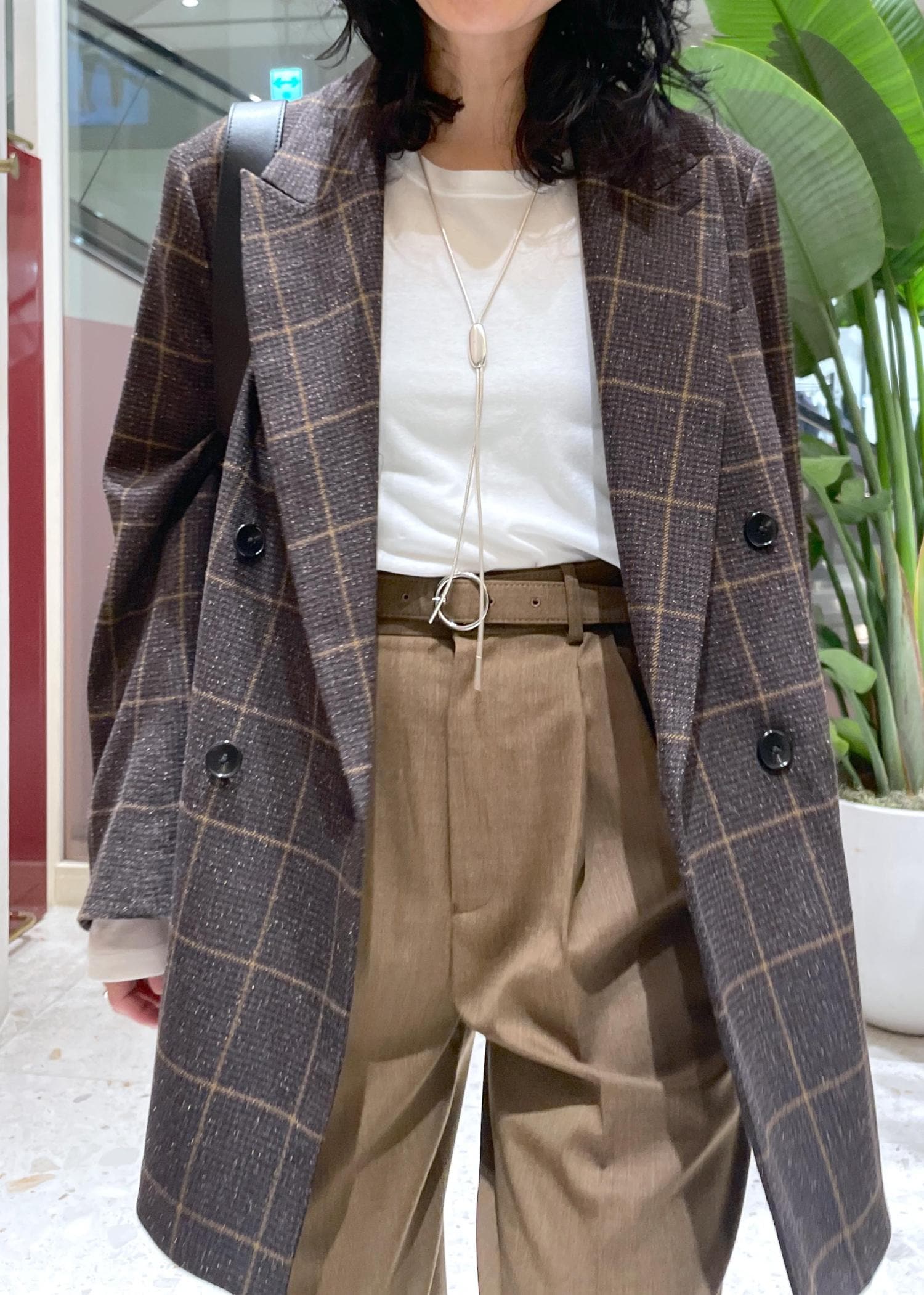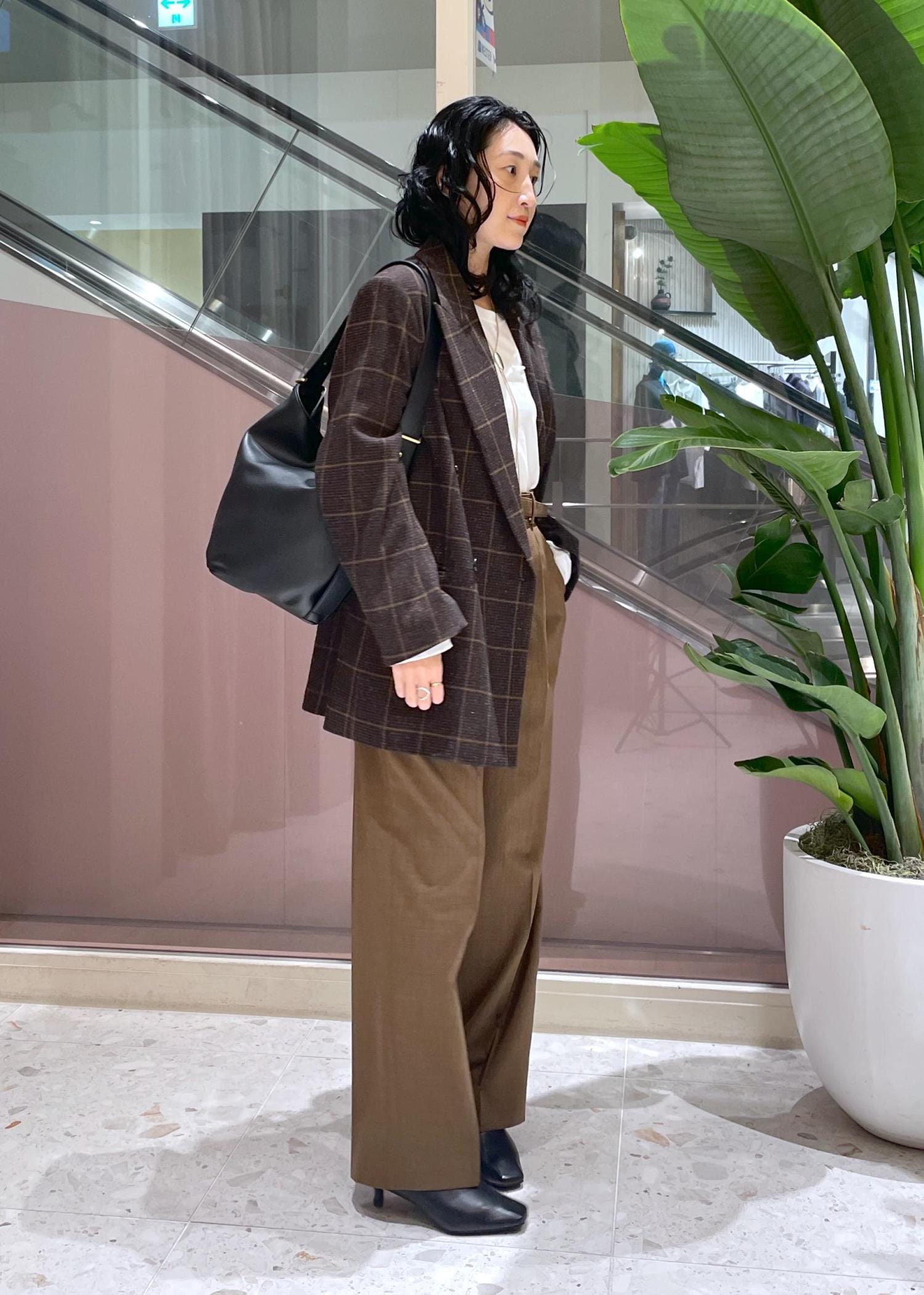 リアバイしたお気に入りのツィードジャケットですが、チェックのブラウンの方をメインに、オフィス使いするなら?とイメージしてスタイリングしてみました。