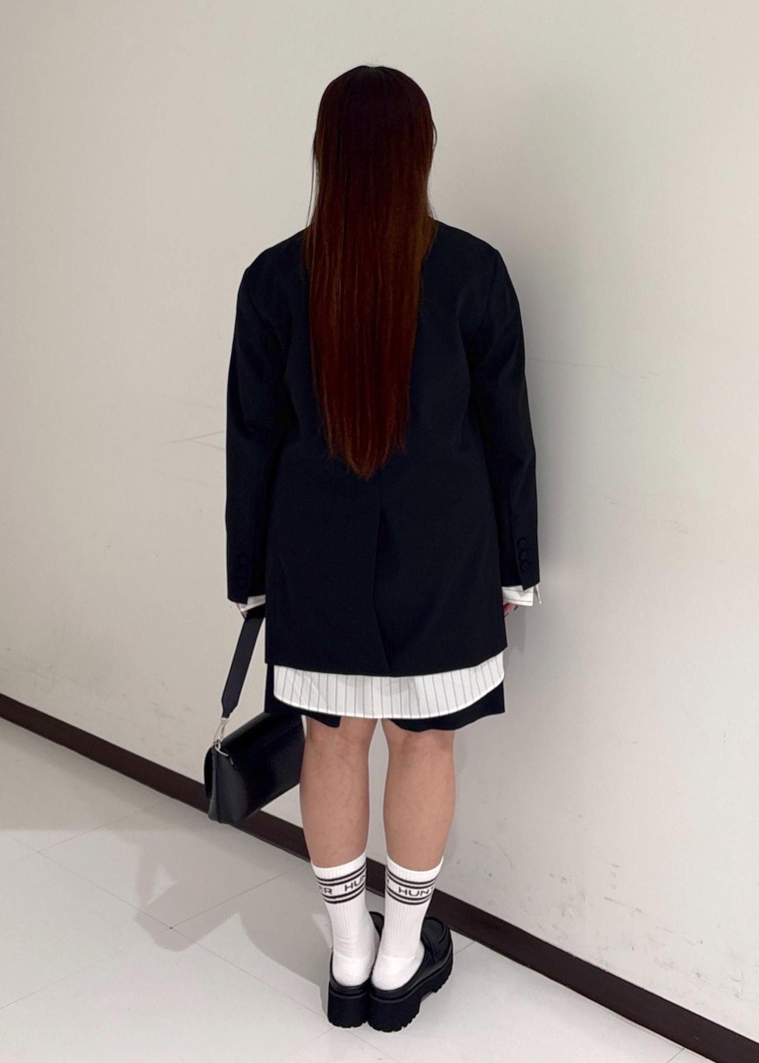 オーバーサイズですが、サイドが短いためダボっと感がなく、ハリのある生地感がコーデを着飾ってくれます◎