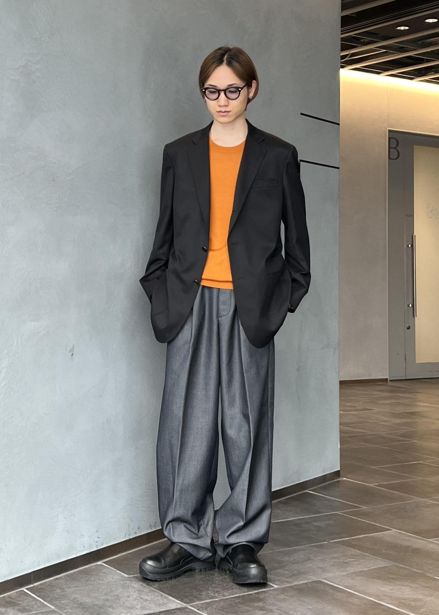 さらにモノグラムの裏地やブロックのクロームボタンのディテールを追加し、"トラッド"ではなく"モード"な印象に仕上げた1着です。