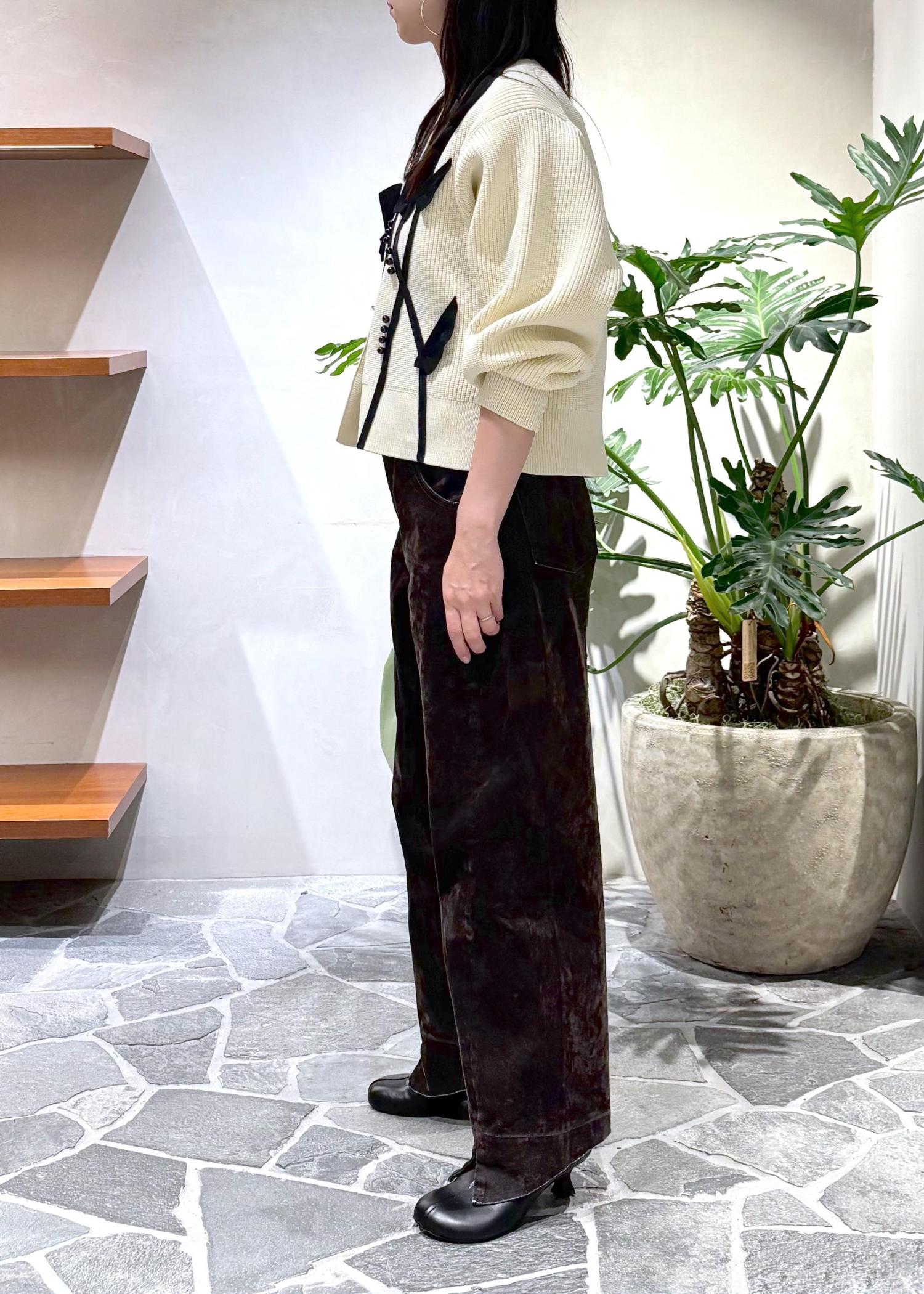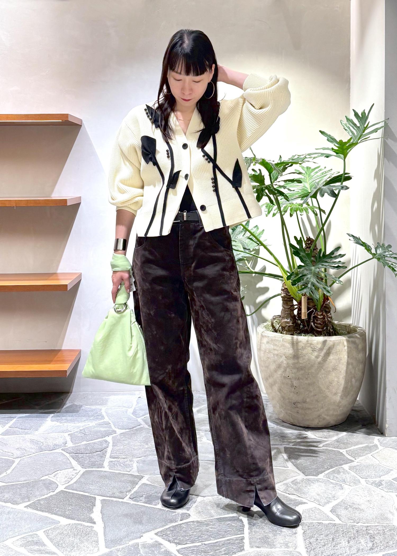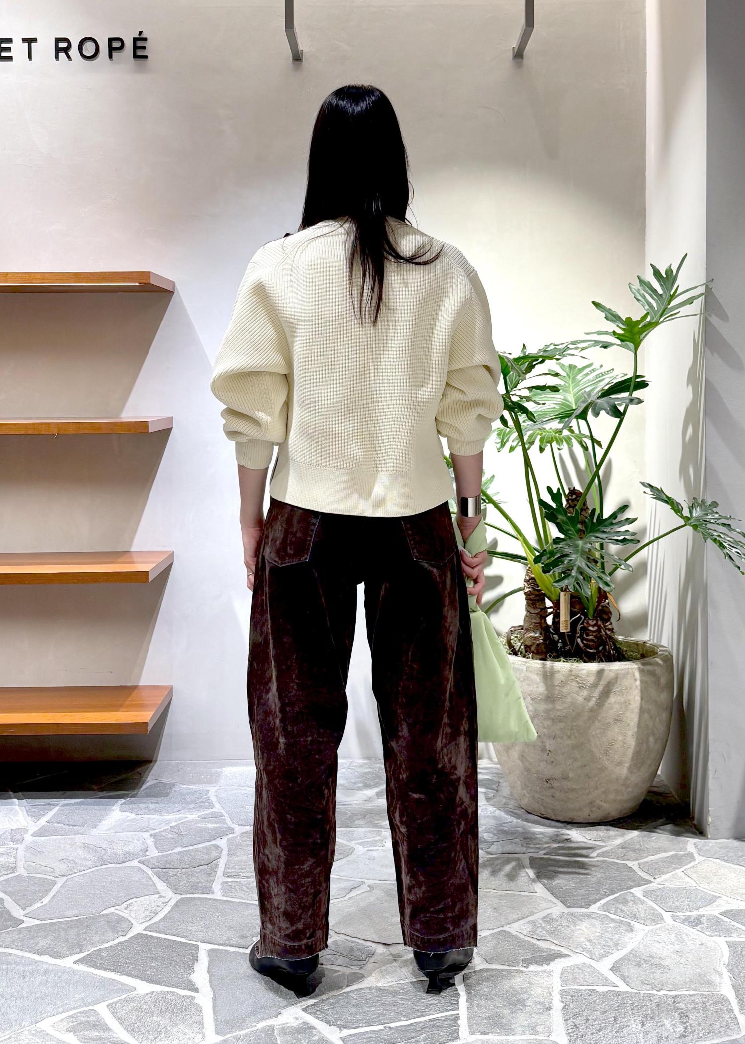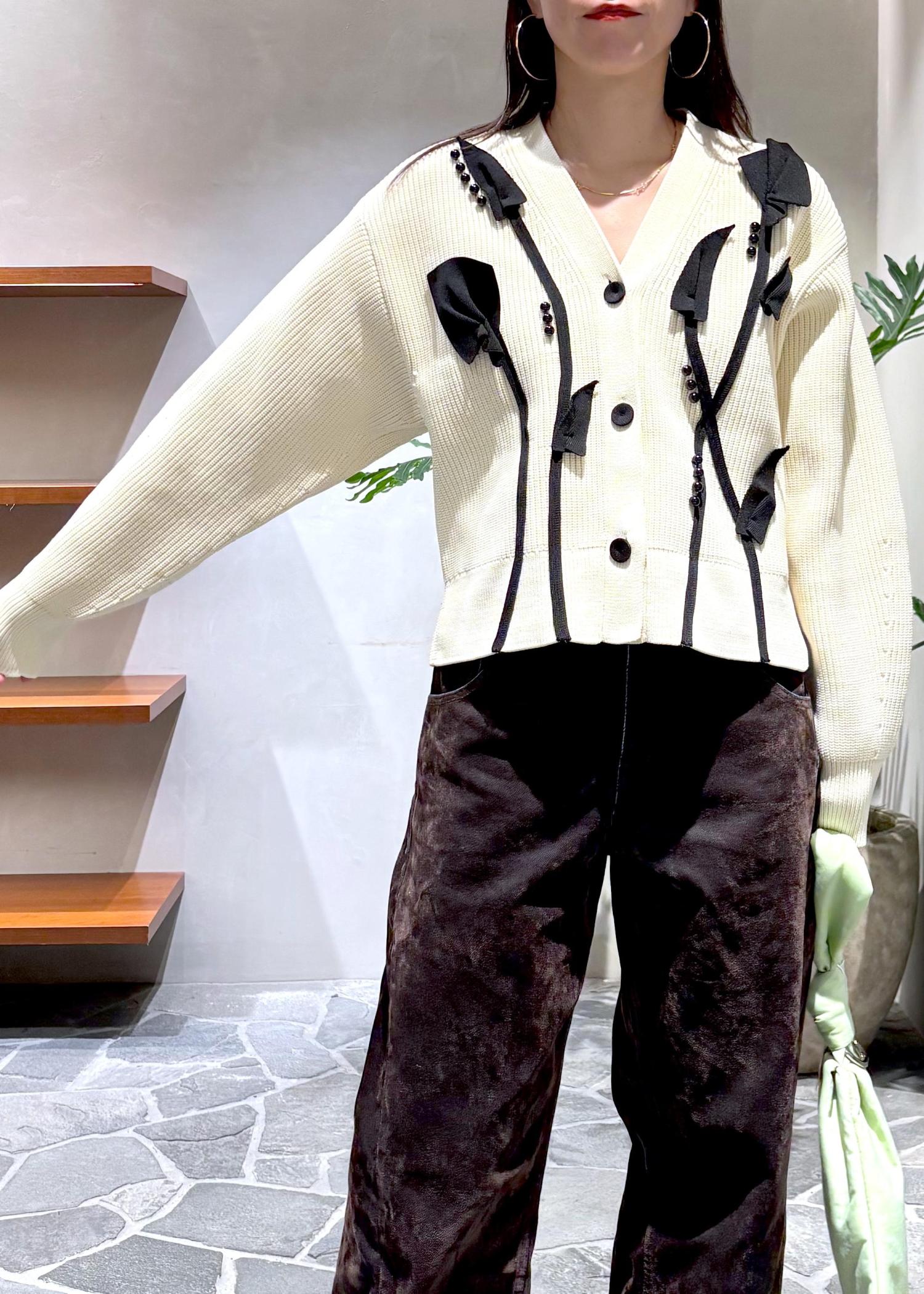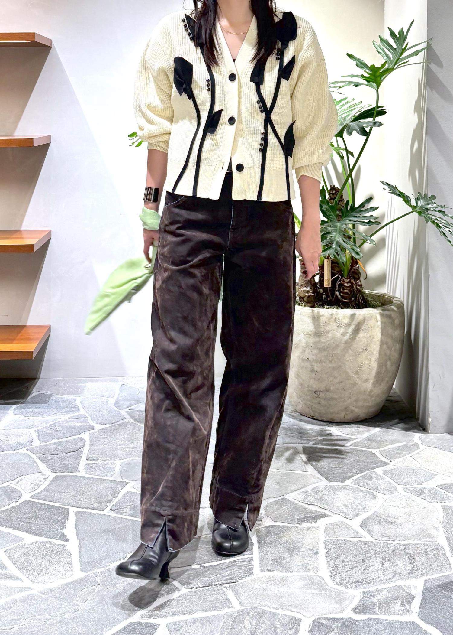 今回は晩夏でも重見えしない白のカーディガンを選んだので、ボトムスはフロッキーを全面プリントしてコーデュロイのようなベロアのような生地にしているブラウンデニムを合わせ、秋をイメージしました。