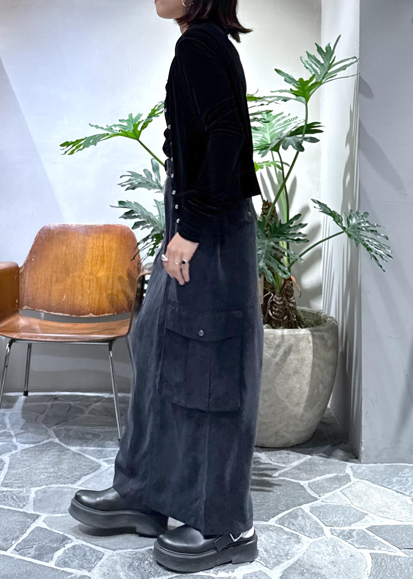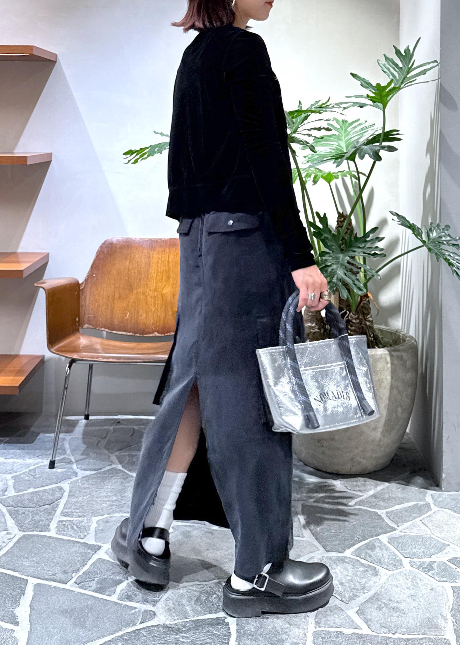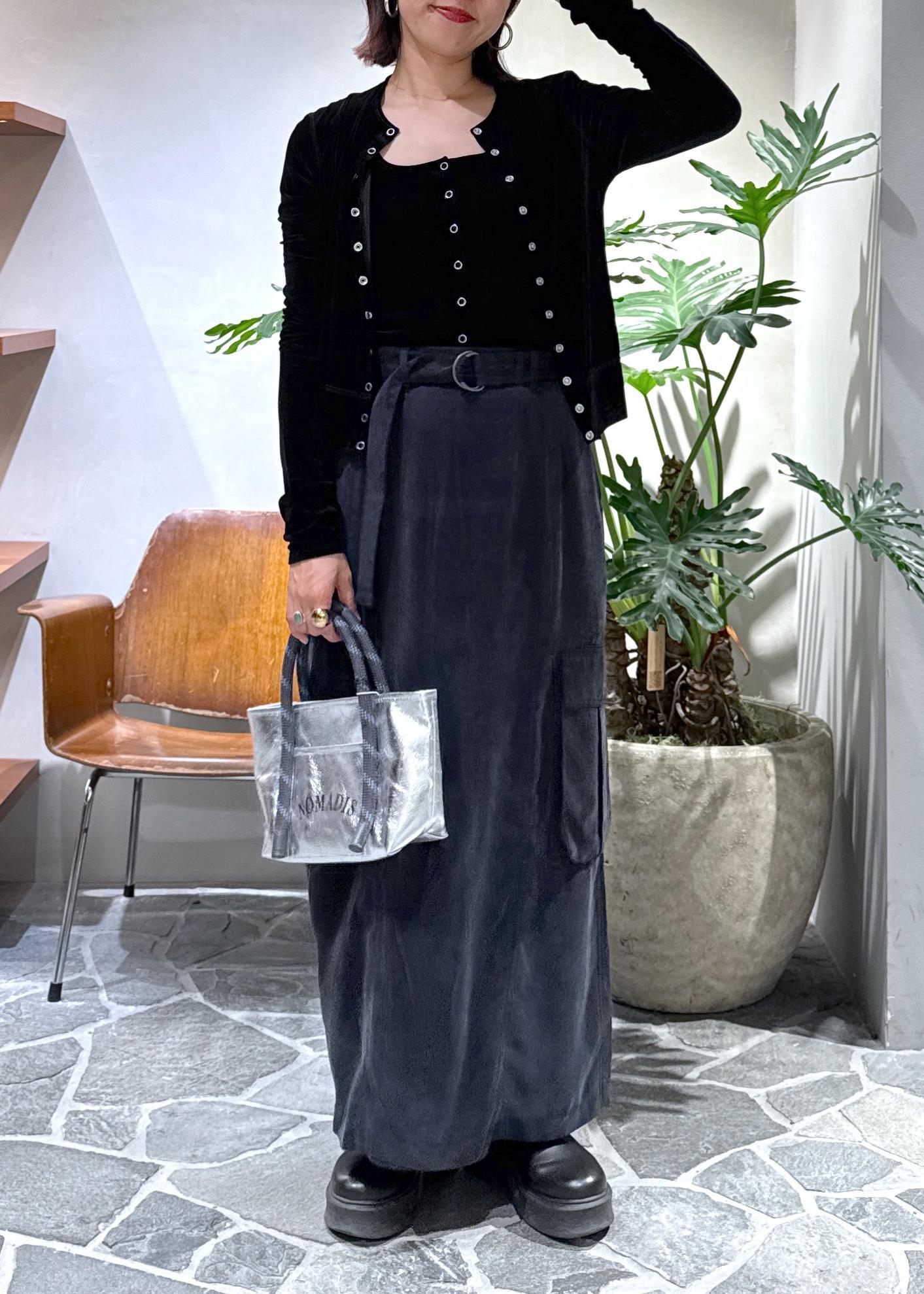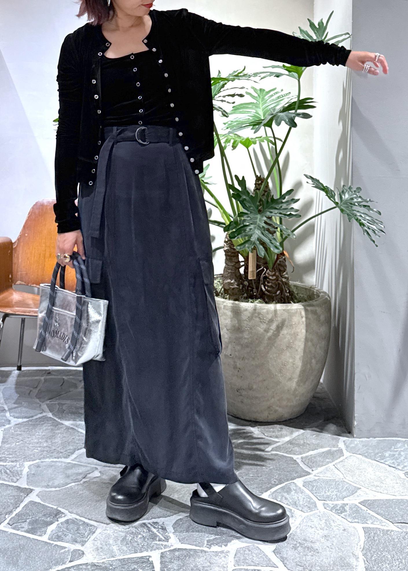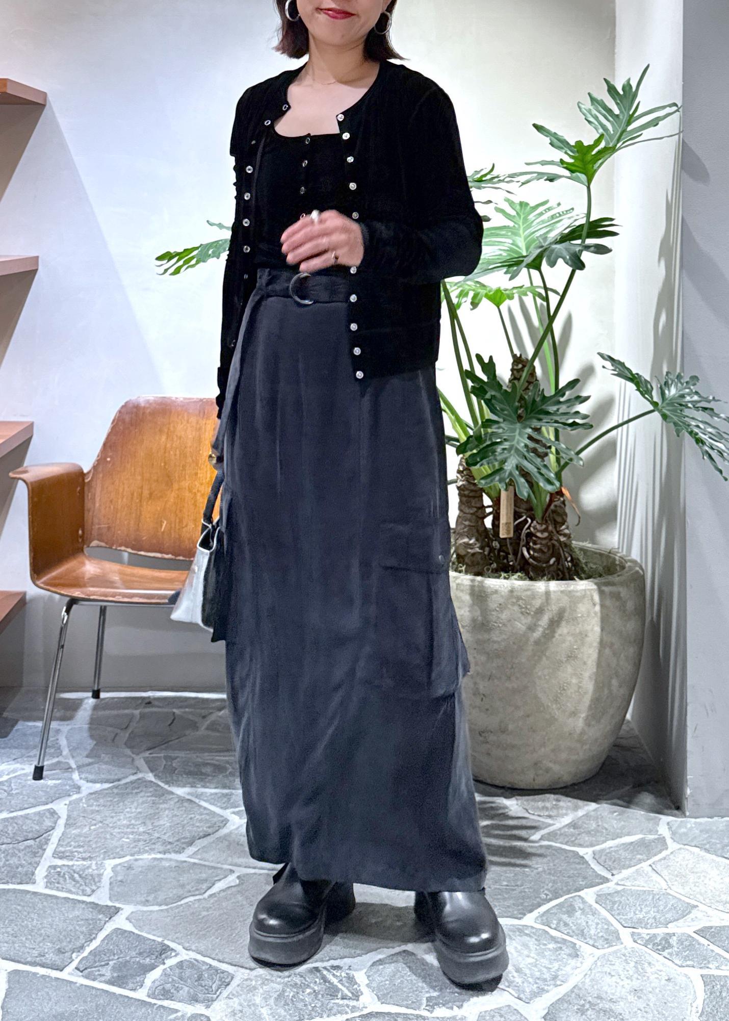 ベロアの上品なツヤ感と、キュプラの滑らかさのある柔らかいブラックで、ハードにならないブラックコーデです!