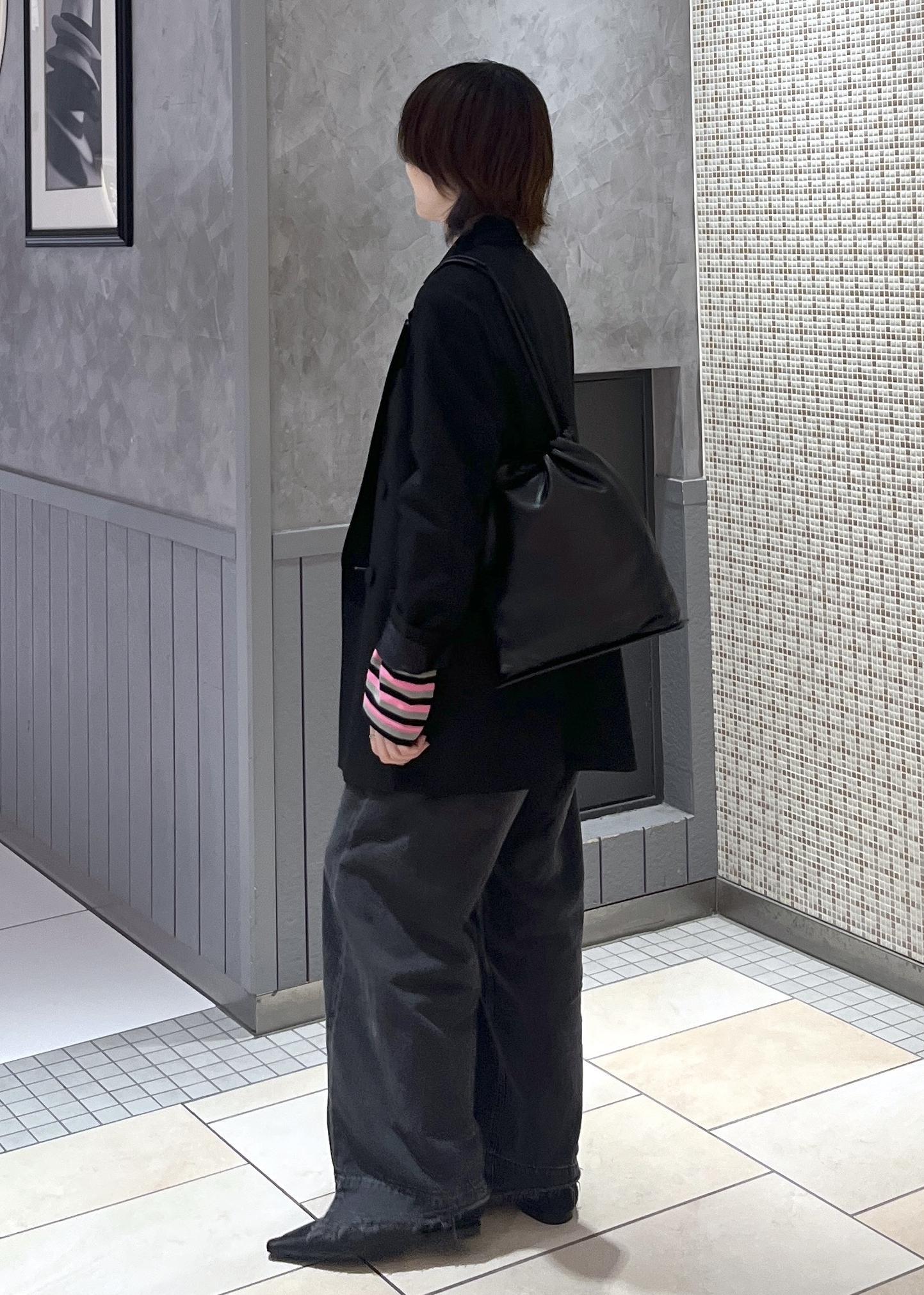ADAM ET ROPÉ FEMME【サステナブル】アーティフシャルレザー巾着バッグブラック / F¥13,860レビュー今回は肩掛けで使用していますがハンドバッグにもできます◎ コンパクトですが高さがしっかりあり、自立してくれる幅のマチもあります!