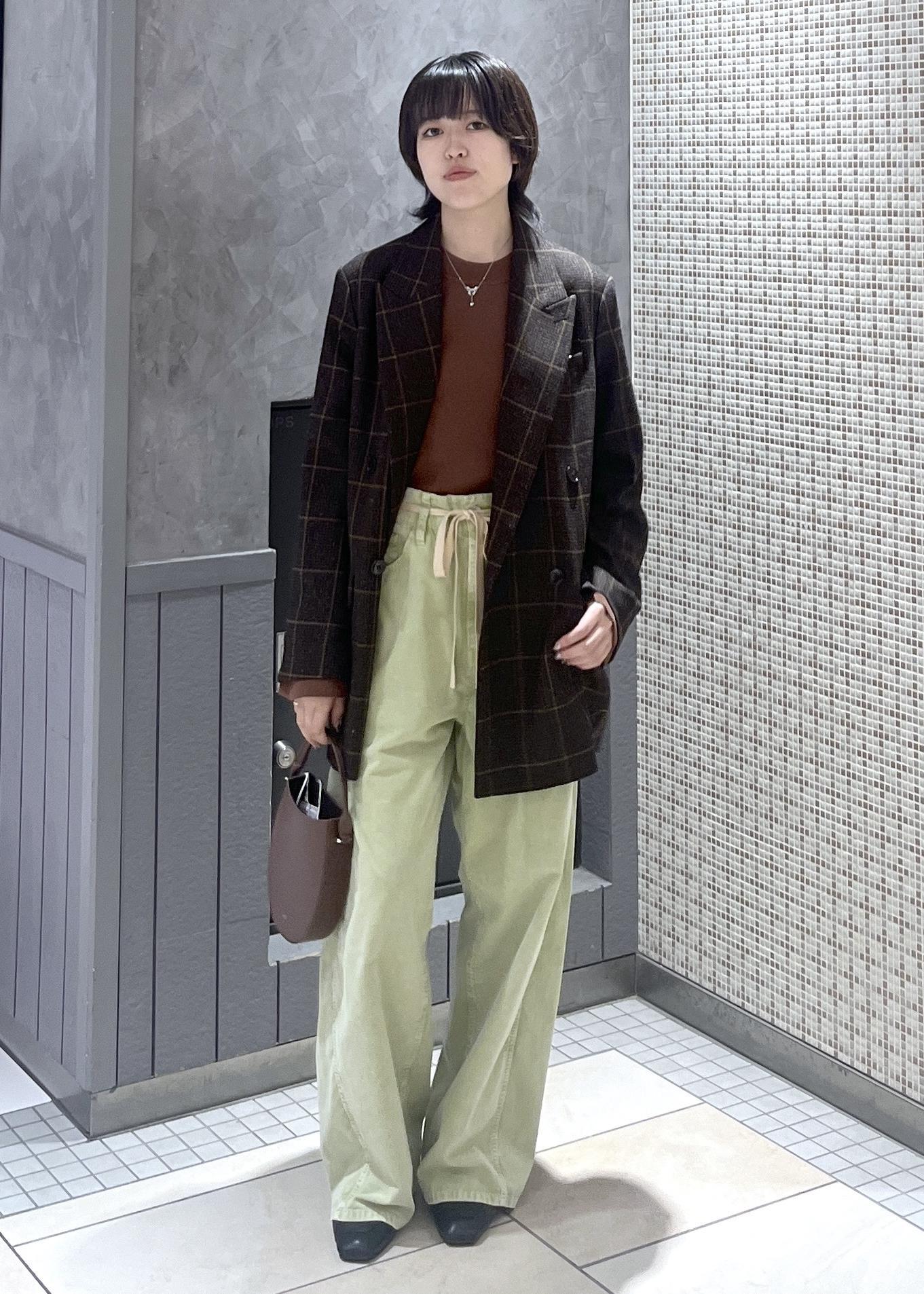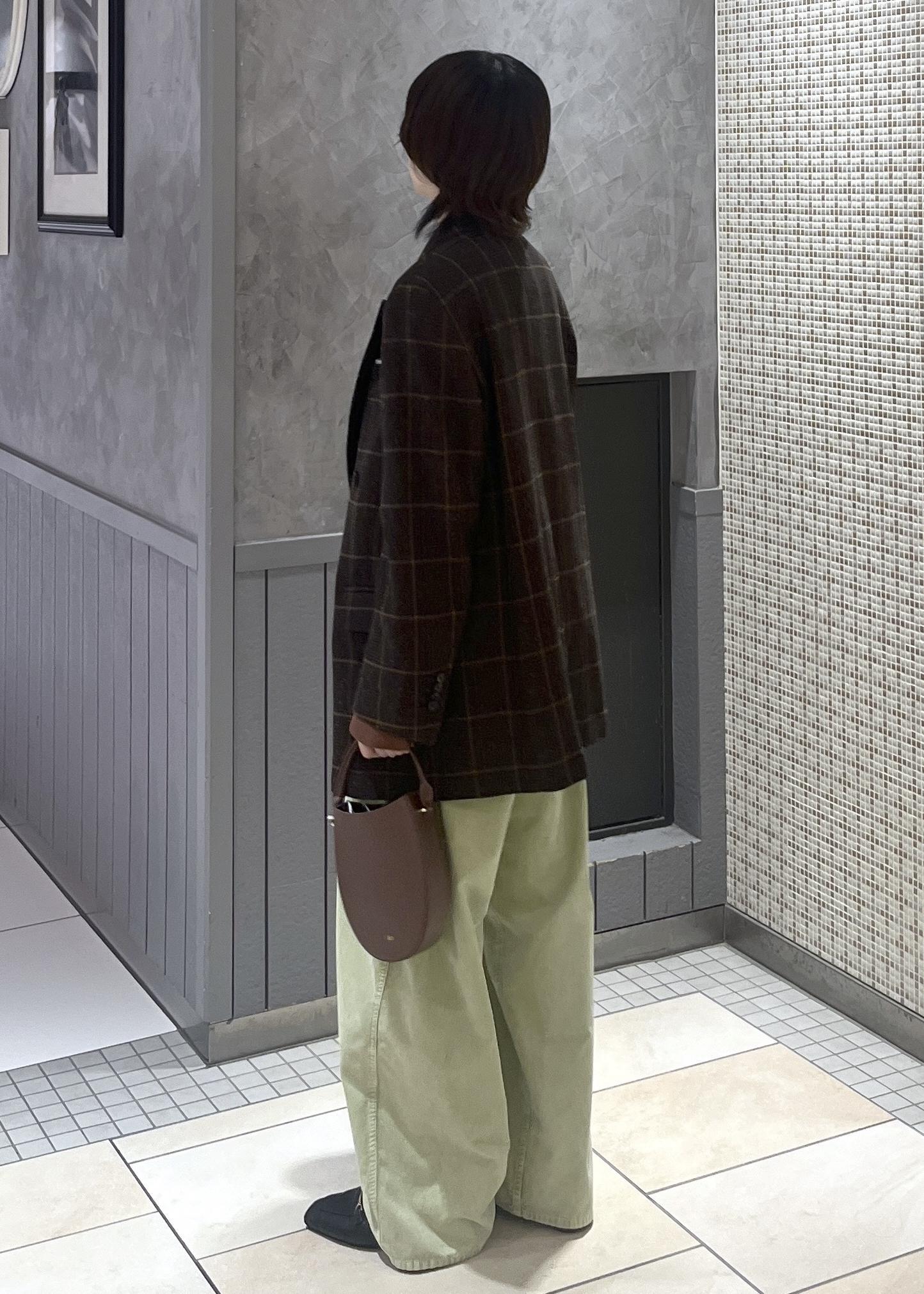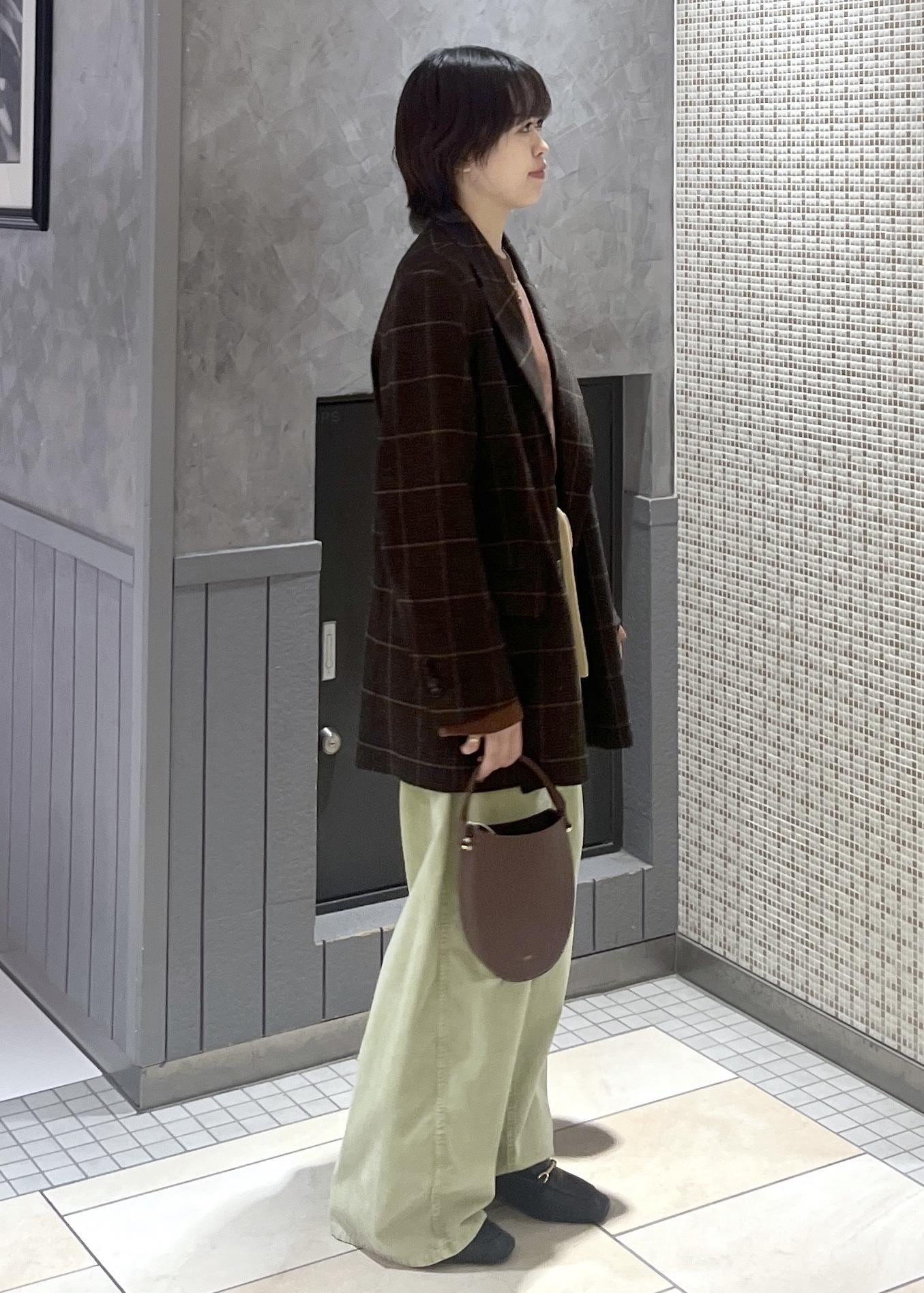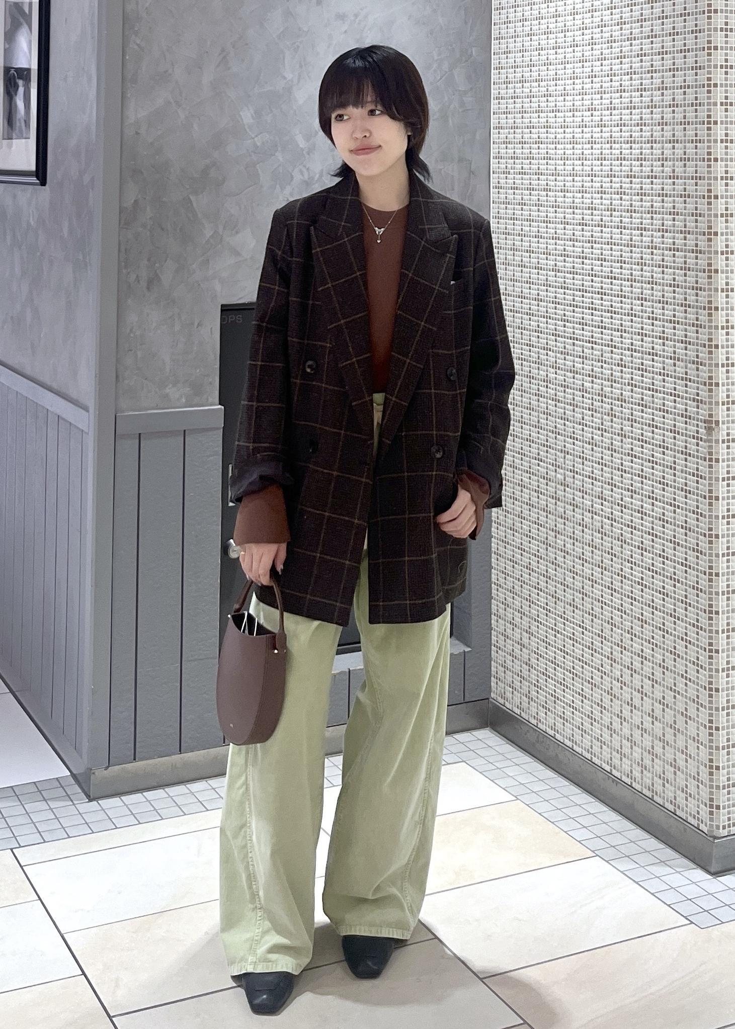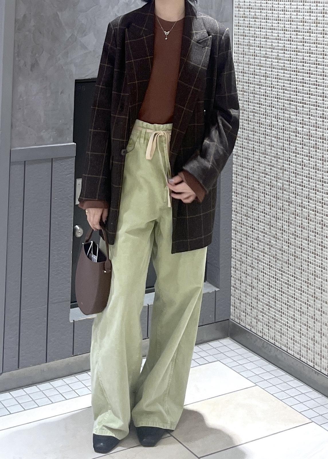 今回はブラウンコーデにライトグリーンを差し込んでみました。色物をあまり使わない方も、落ち着いたワンカラーコーデにひとついれるのは挑戦しやすくおすすめです◎