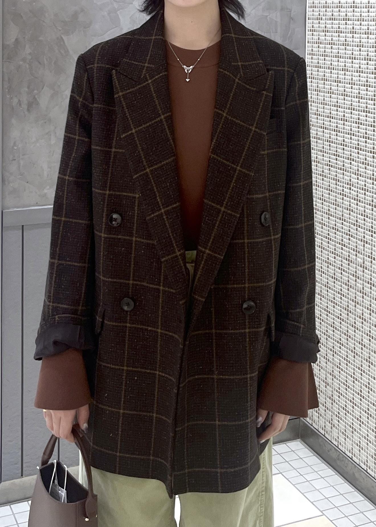 全体的にオーバーサイズで158cmの私はヒップ周りもすっぽり隠れる長さです。表面感のある生地と、ポケットチーフのような付属品で上品見えします!