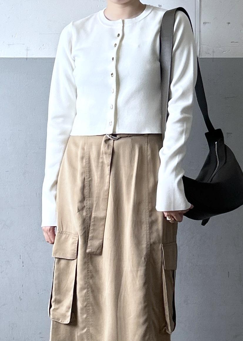 今回はニュアンスデザインのボタンが可愛いカーディガンと、カーゴスカートを合わせたコーデをご紹介いたします!