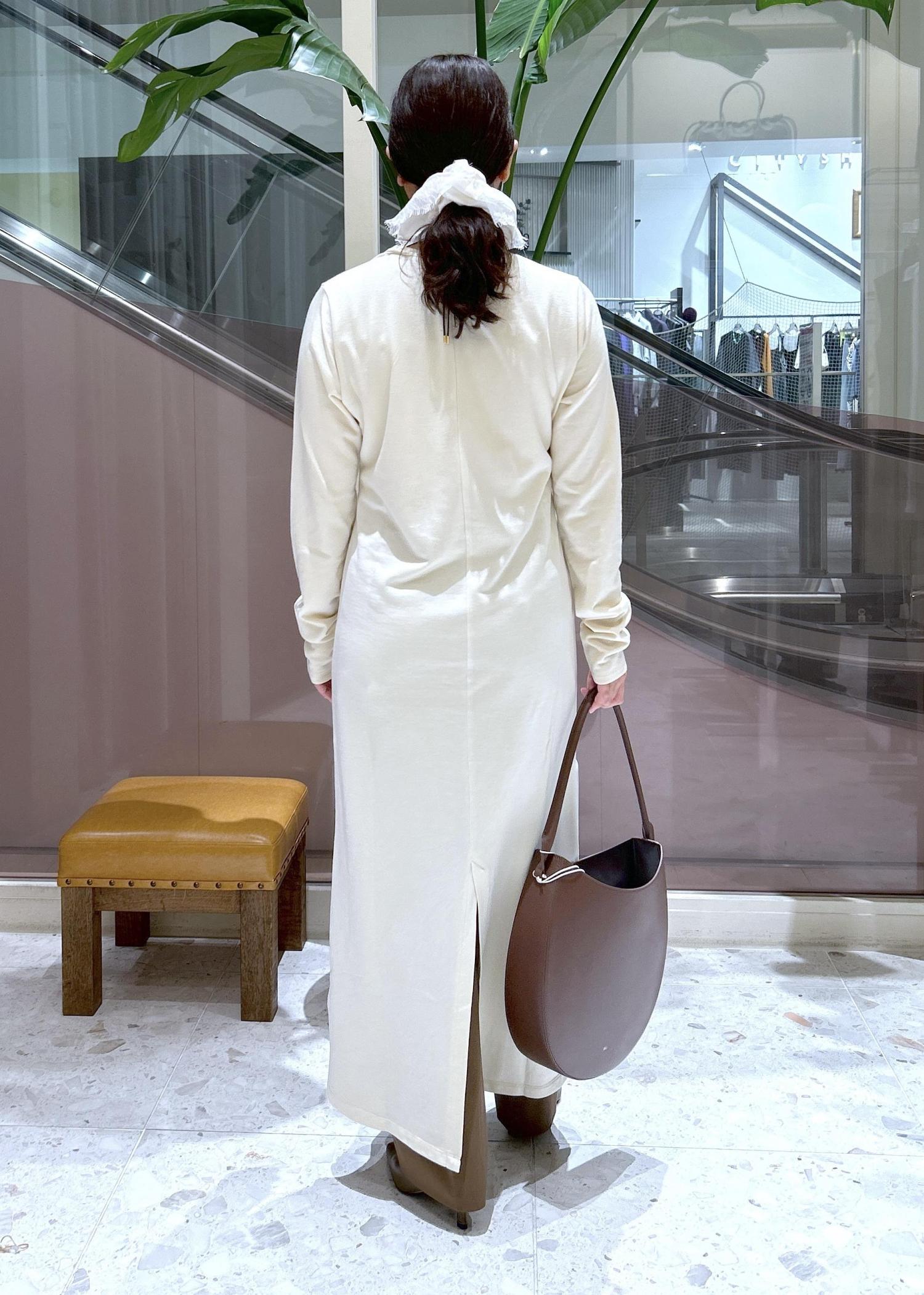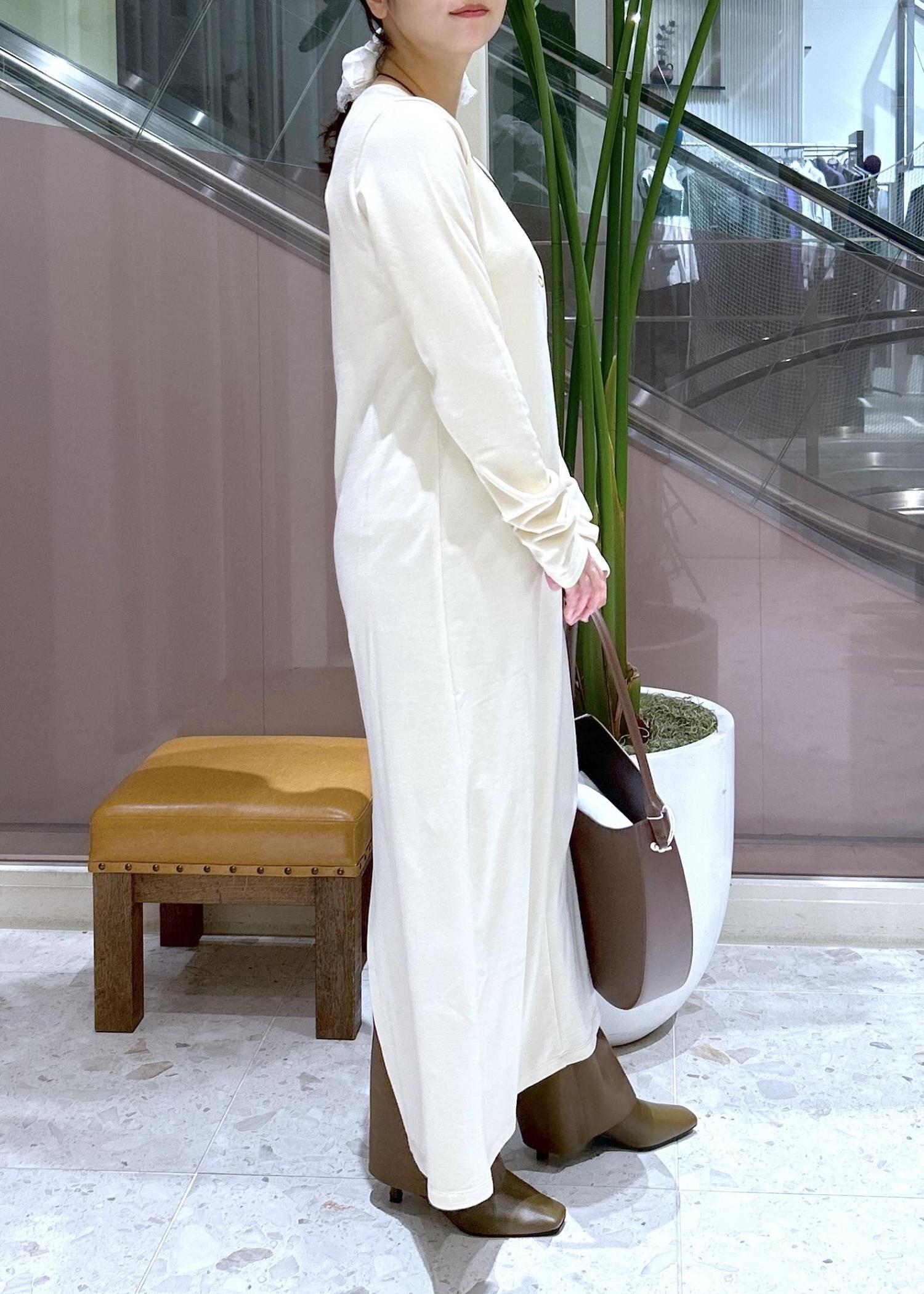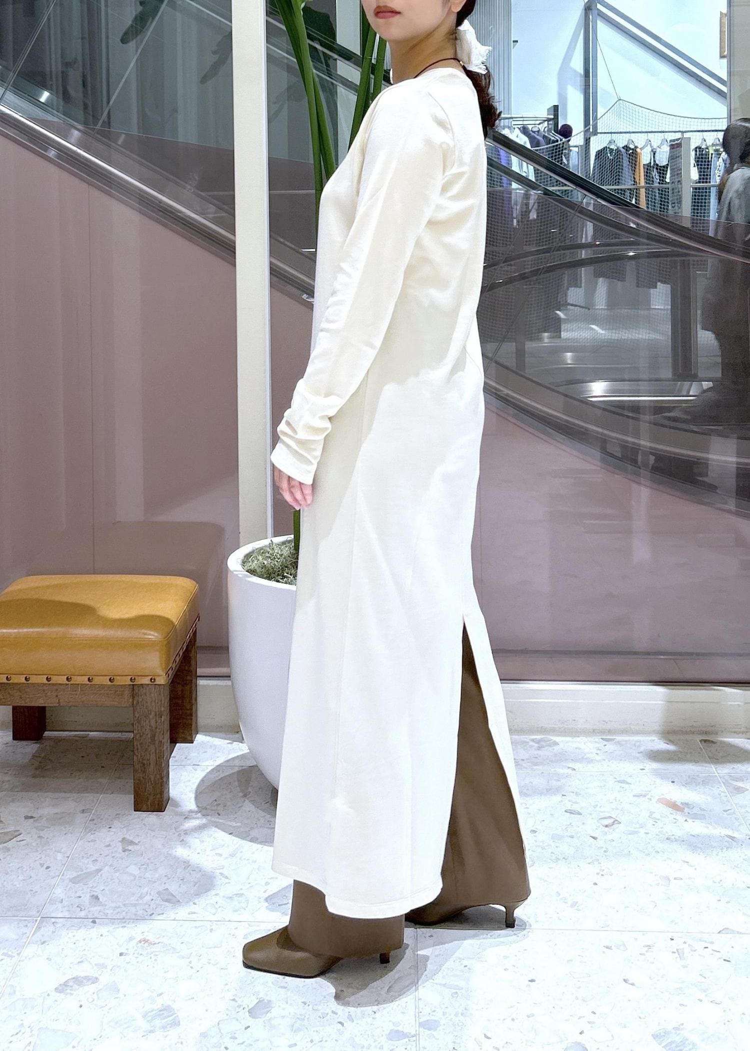 とても柔らかい生地です。体型のラインを拾いすぎないのにスタイル良く切られるのが嬉しいポイントです!着丈が短めなのでフラットシューズでも気にせず着用できます。