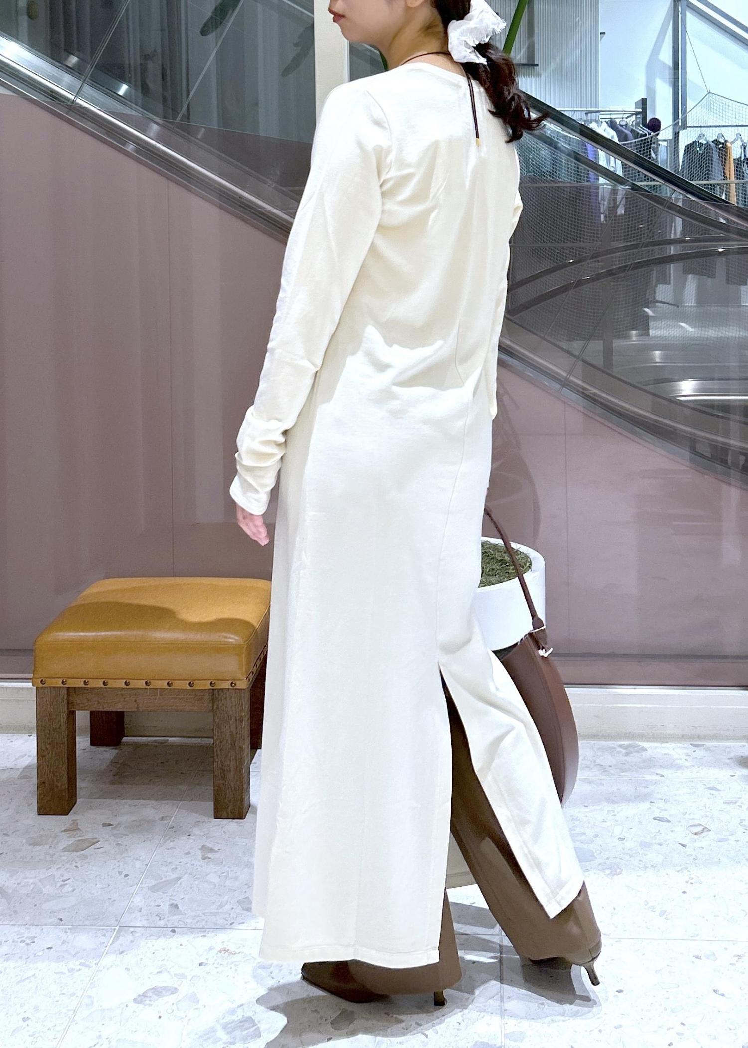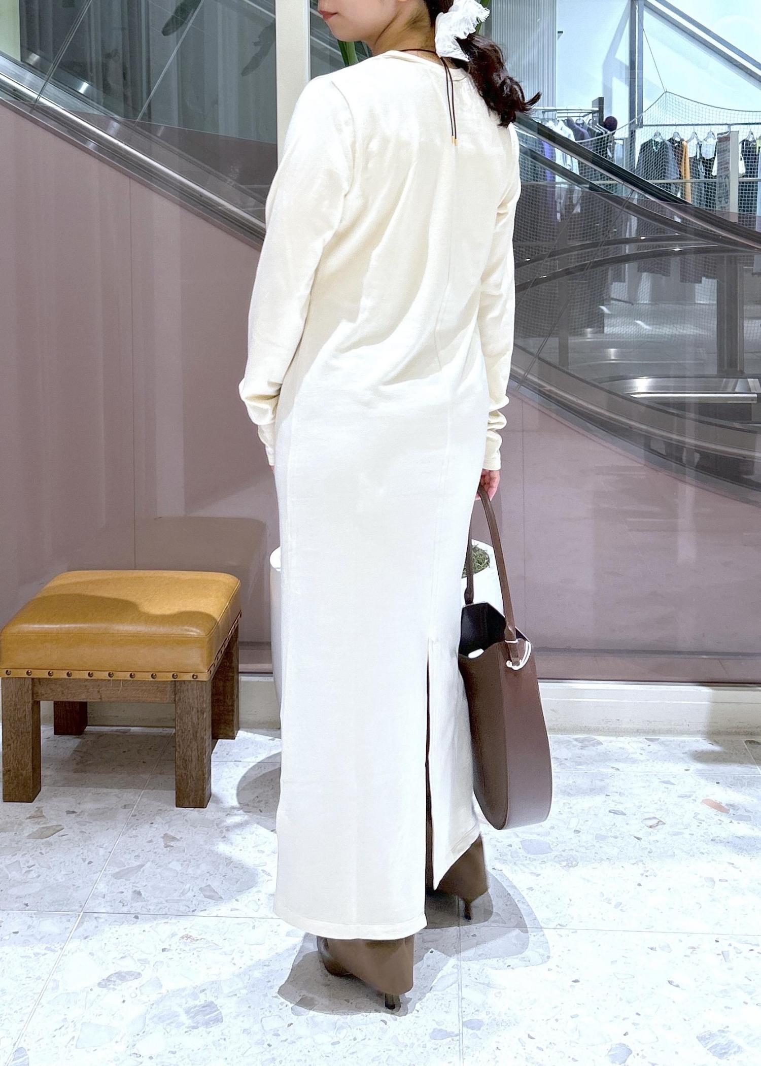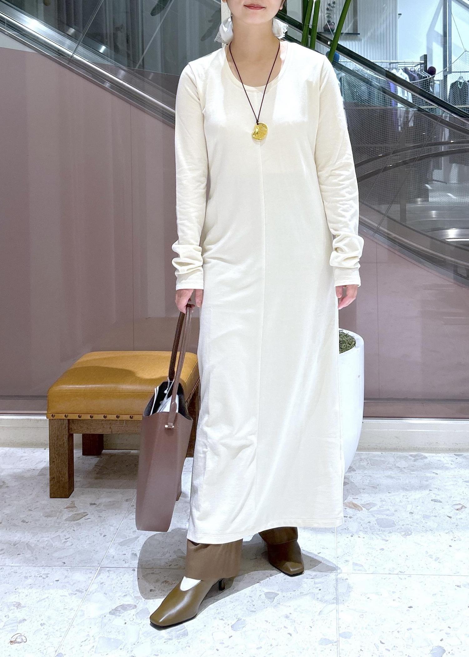 とても柔らかい生地です。体型のラインを拾いすぎないのにスタイル良く切られるのが嬉しいポイントです!着丈が短めなのでフラットシューズでも気にせず着用できます。