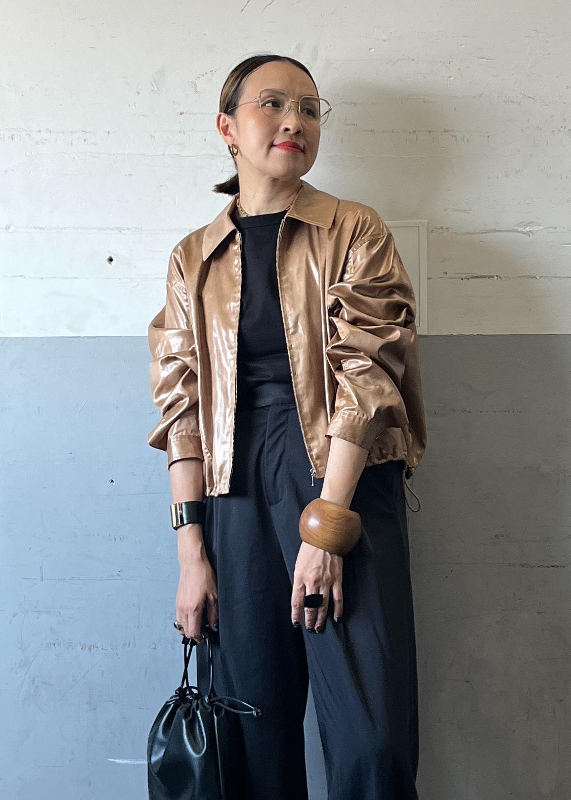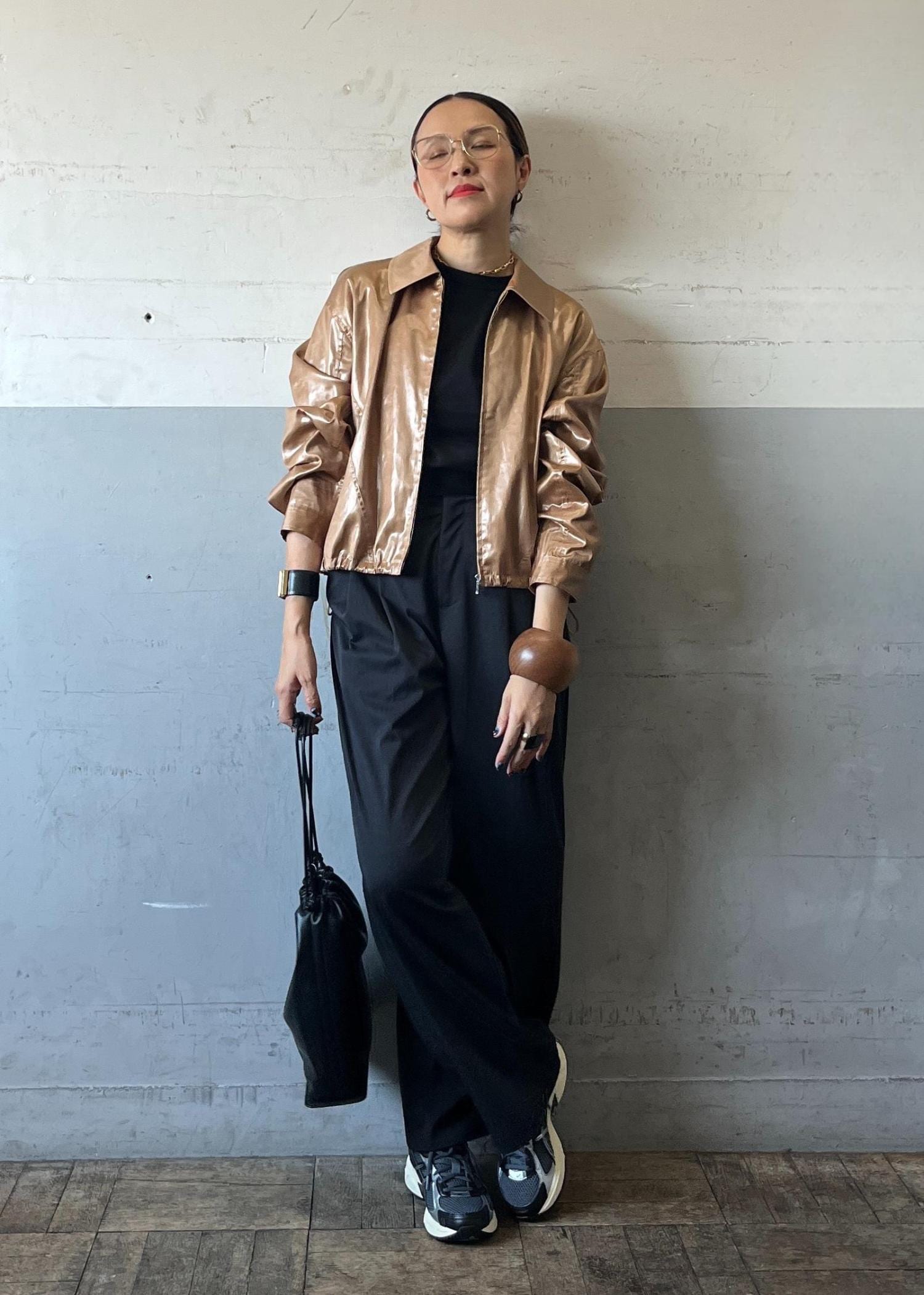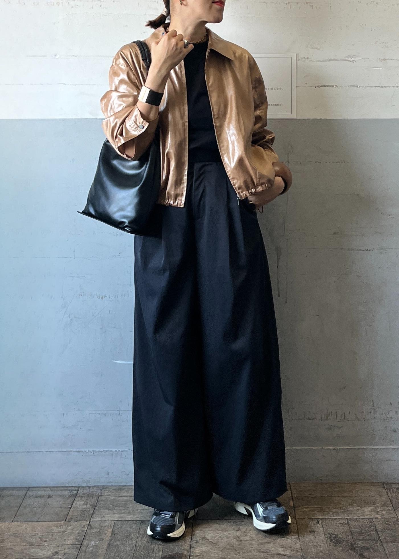 光沢感のあるレザーライクブルゾンを主役に、モノトーンでまとめたスタイリング。コンパクトな丈感がワイドパンツと好バランスで、羽織るだけでモードな存在感を放ちつつ、スニーカーで程よく力の抜けた今っぽさを演出しています。