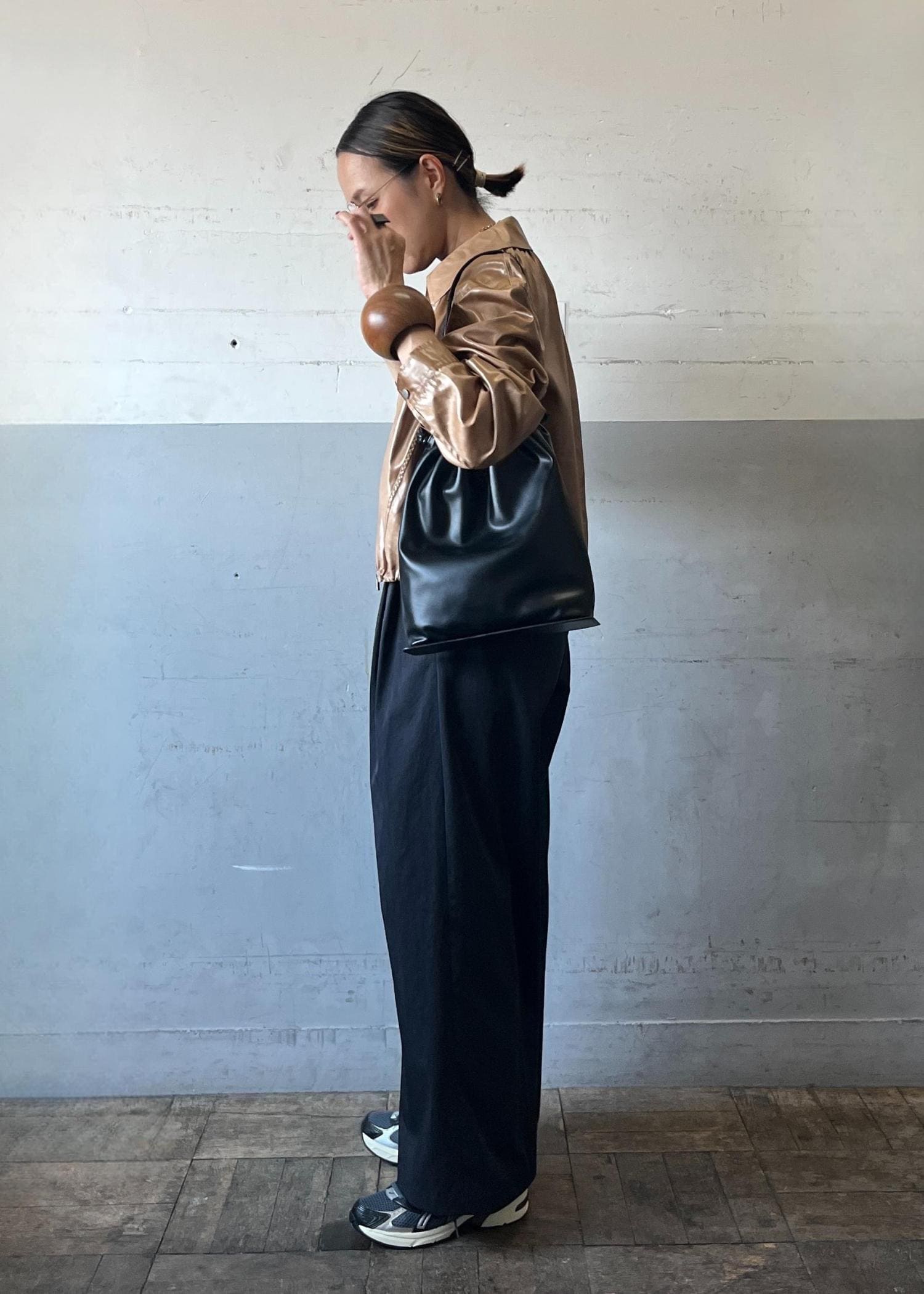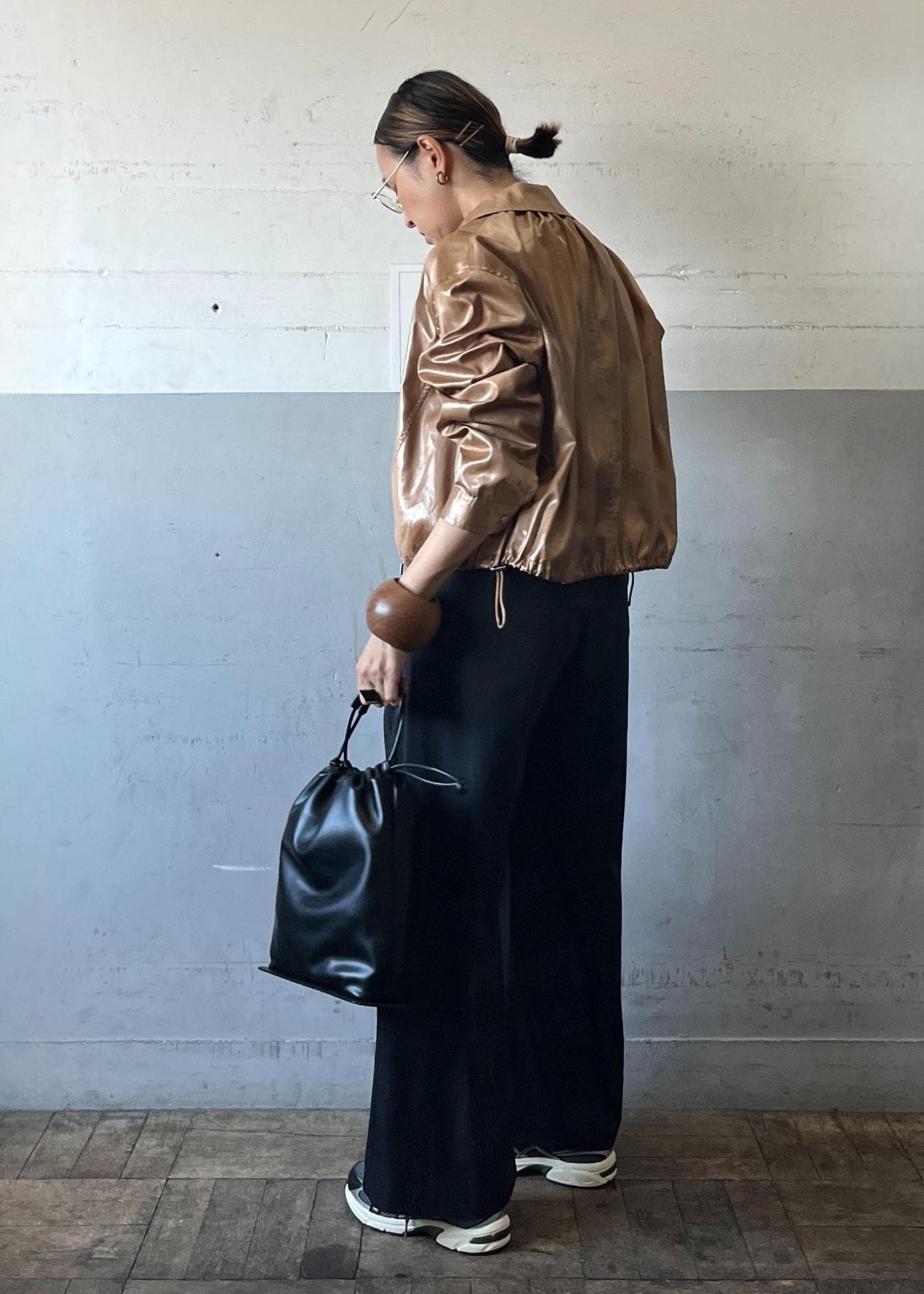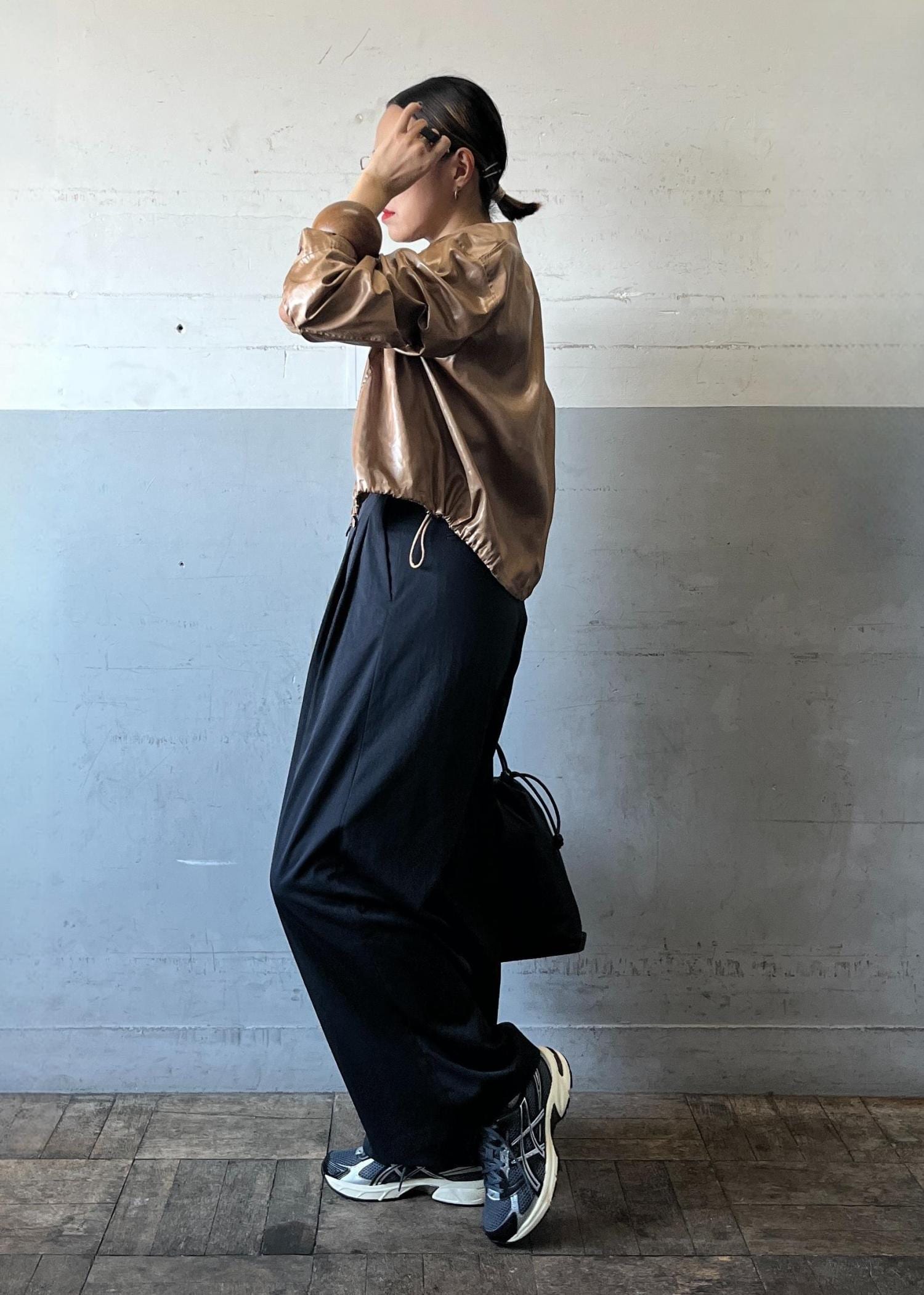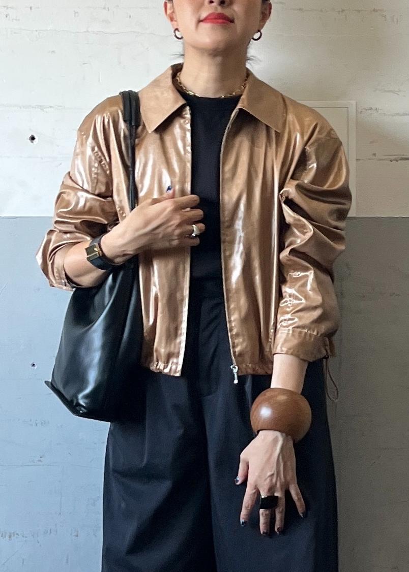 光沢感のあるレザーライクブルゾンを主役に、モノトーンでまとめたスタイリング。コンパクトな丈感がワイドパンツと好バランスで、羽織るだけでモードな存在感を放ちつつ、スニーカーで程よく力の抜けた今っぽさを演出しています。