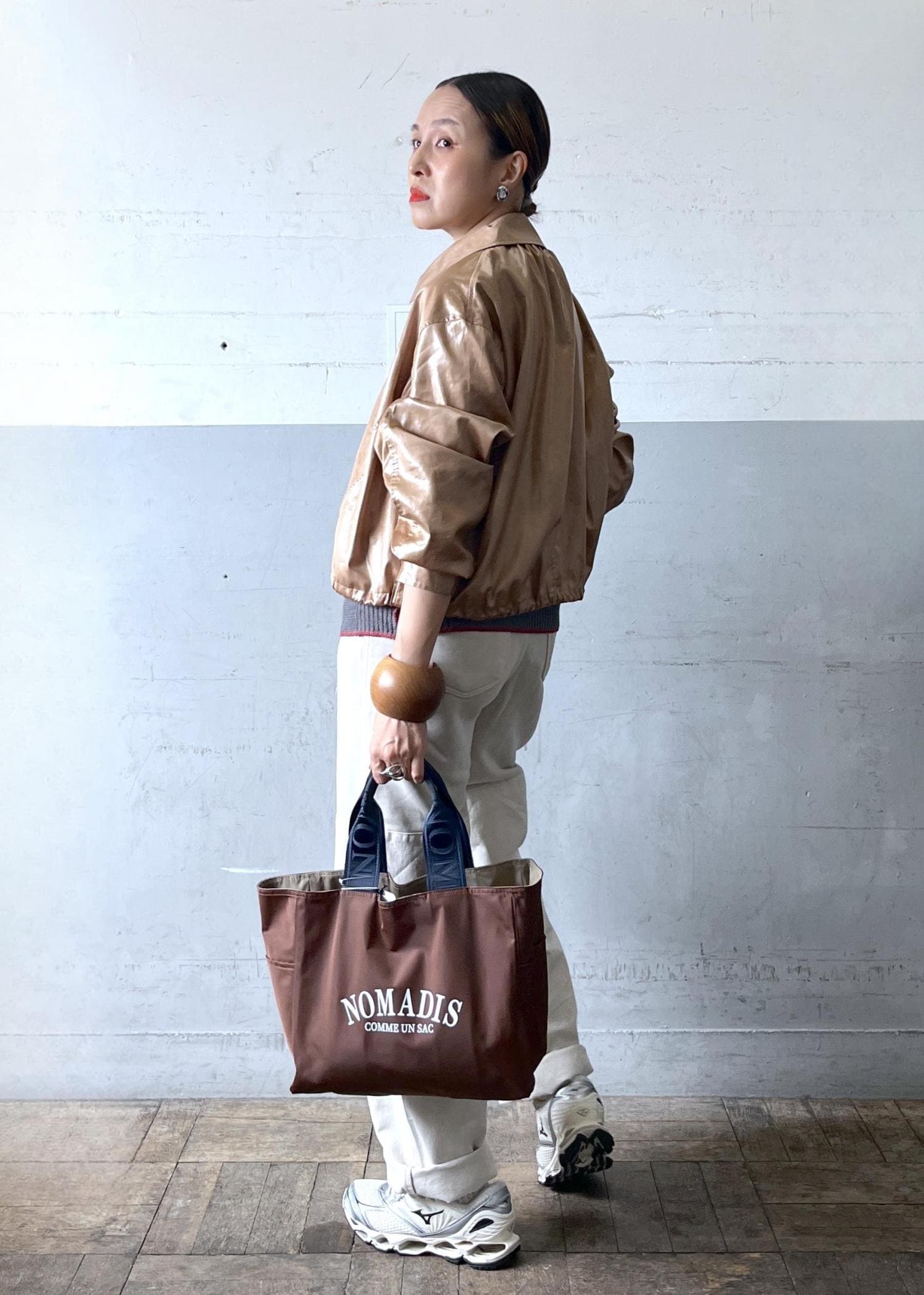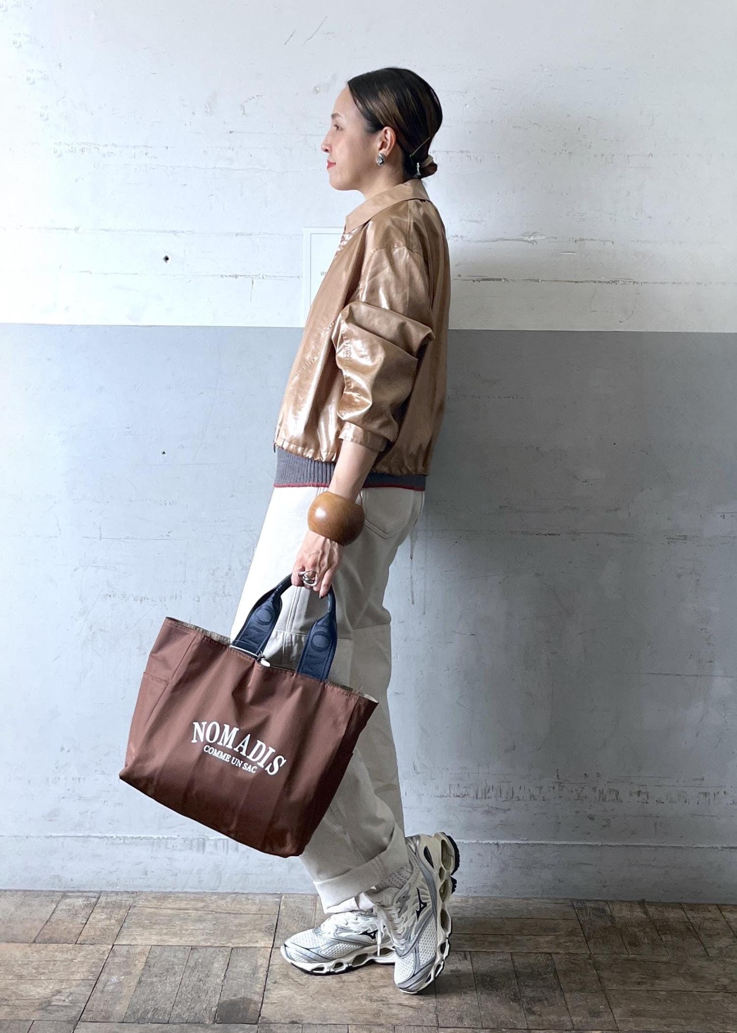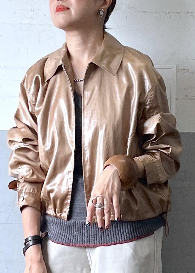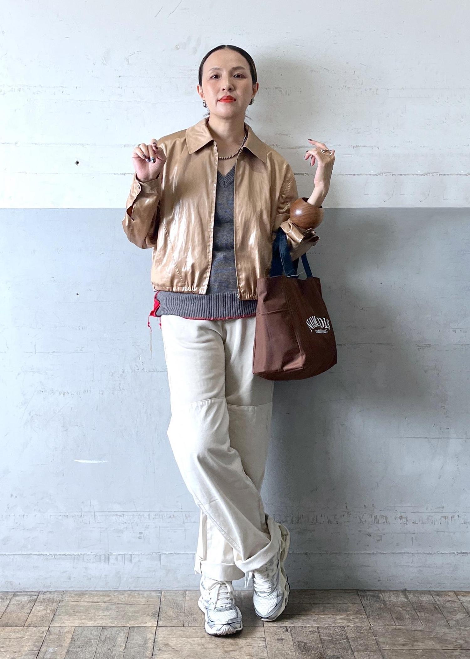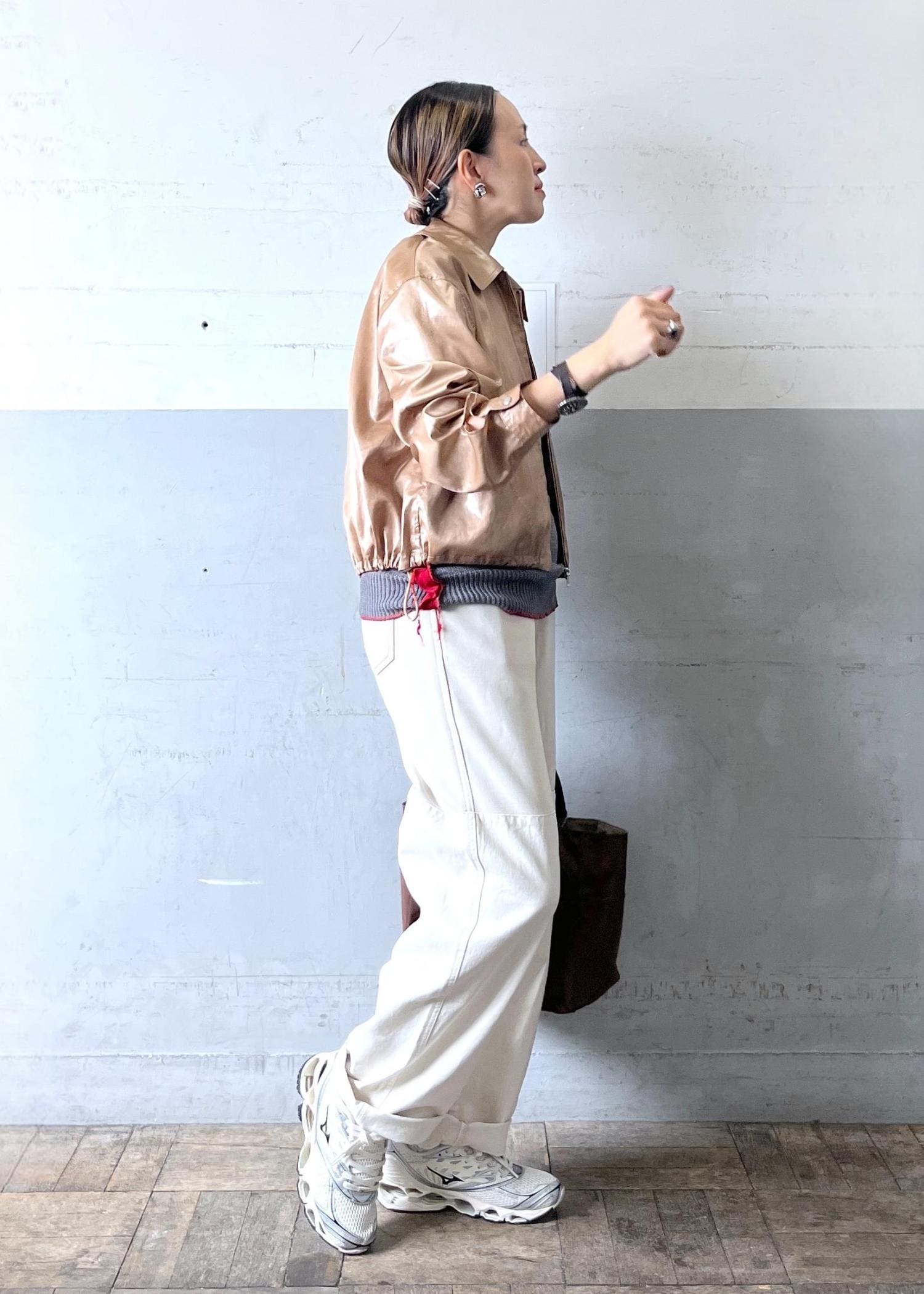 光沢感あるブロンズのレザーライクブルゾンを主役に、グレーとホワイトを合わせた抜け感配色。ブラウン小物でつなぎ、大人のカジュアルをモードに仕上げたバランスコーデ