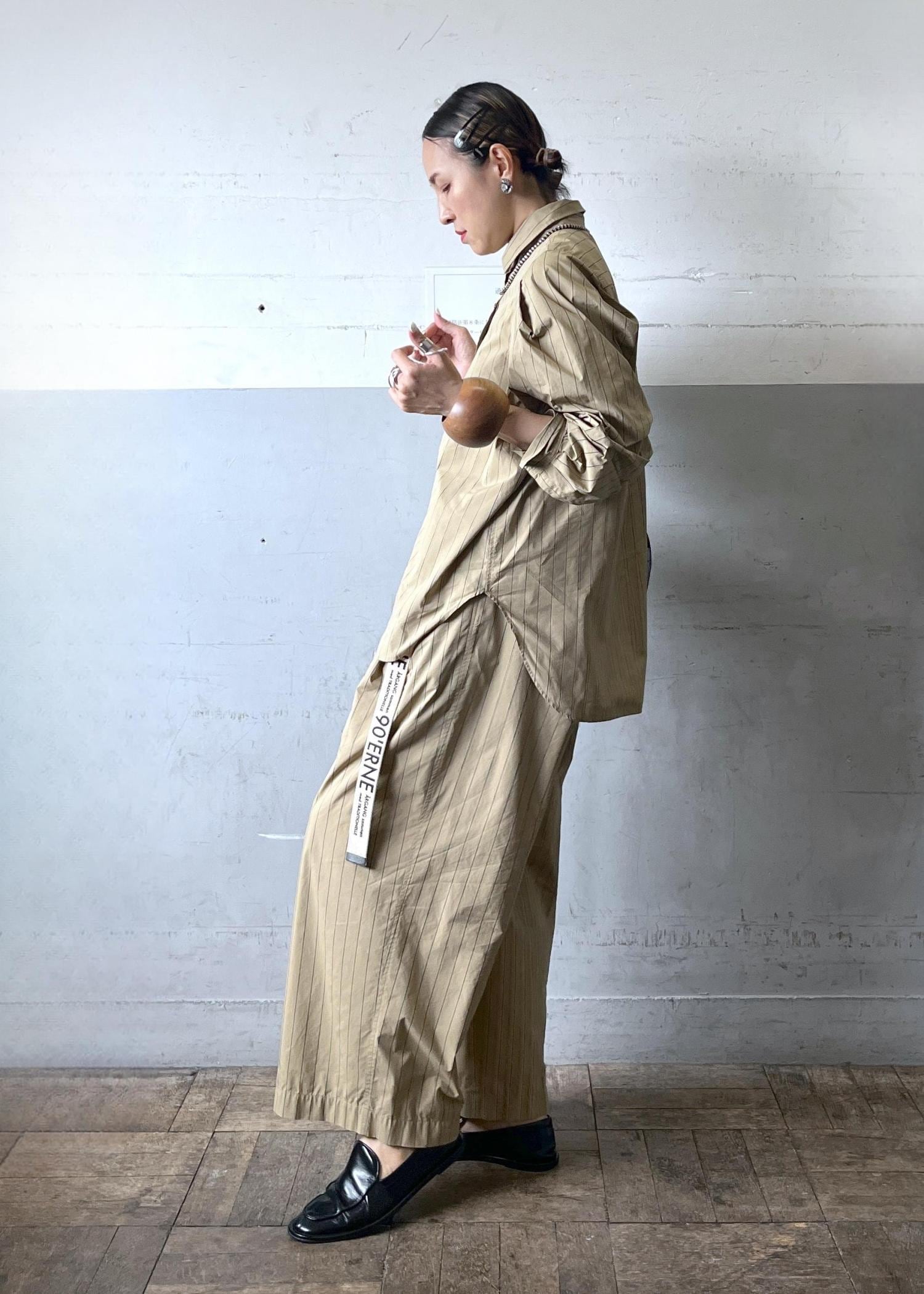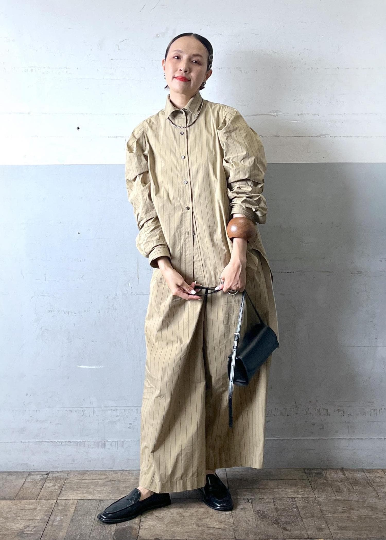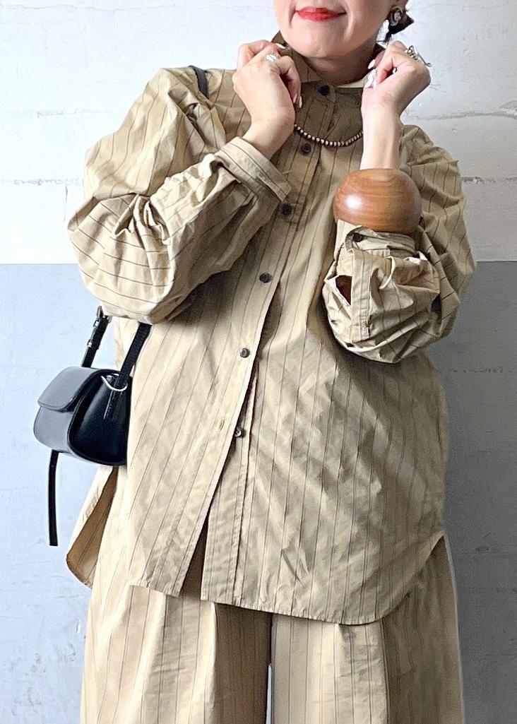 軽やかなシャツ素材のセットアップは、リラックス感がありながらストライプで縦長効果も抜群。小物で引き締めて、大人の抜け感スタイルに仕上げています