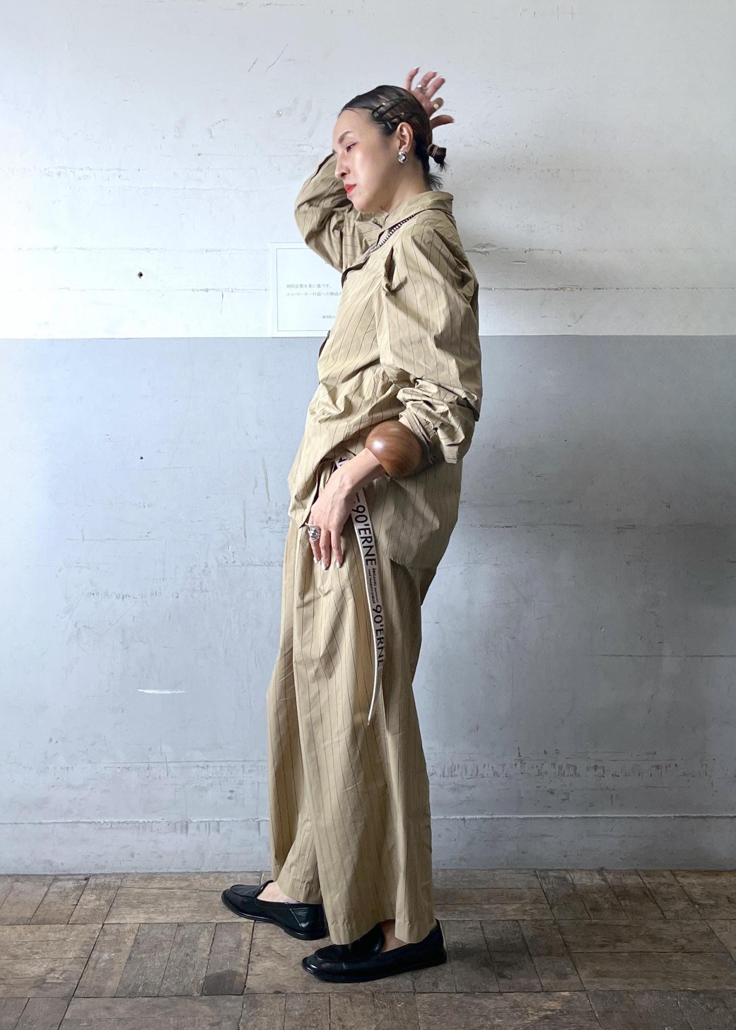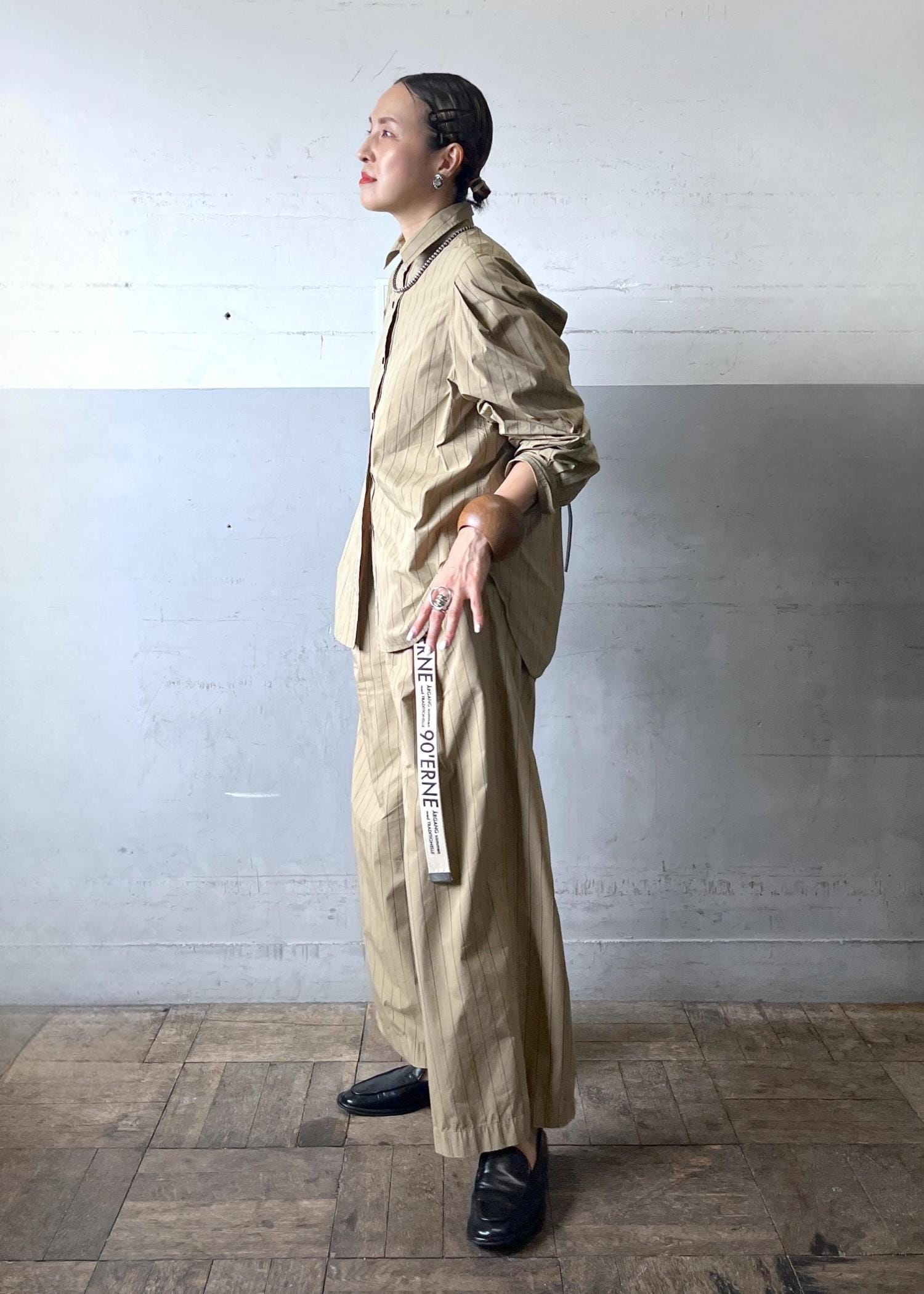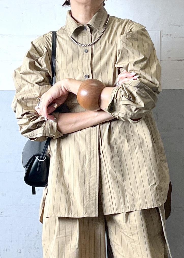 軽やかなシャツ素材のセットアップは、リラックス感がありながらストライプで縦長効果も抜群。小物で引き締めて、大人の抜け感スタイルに仕上げています