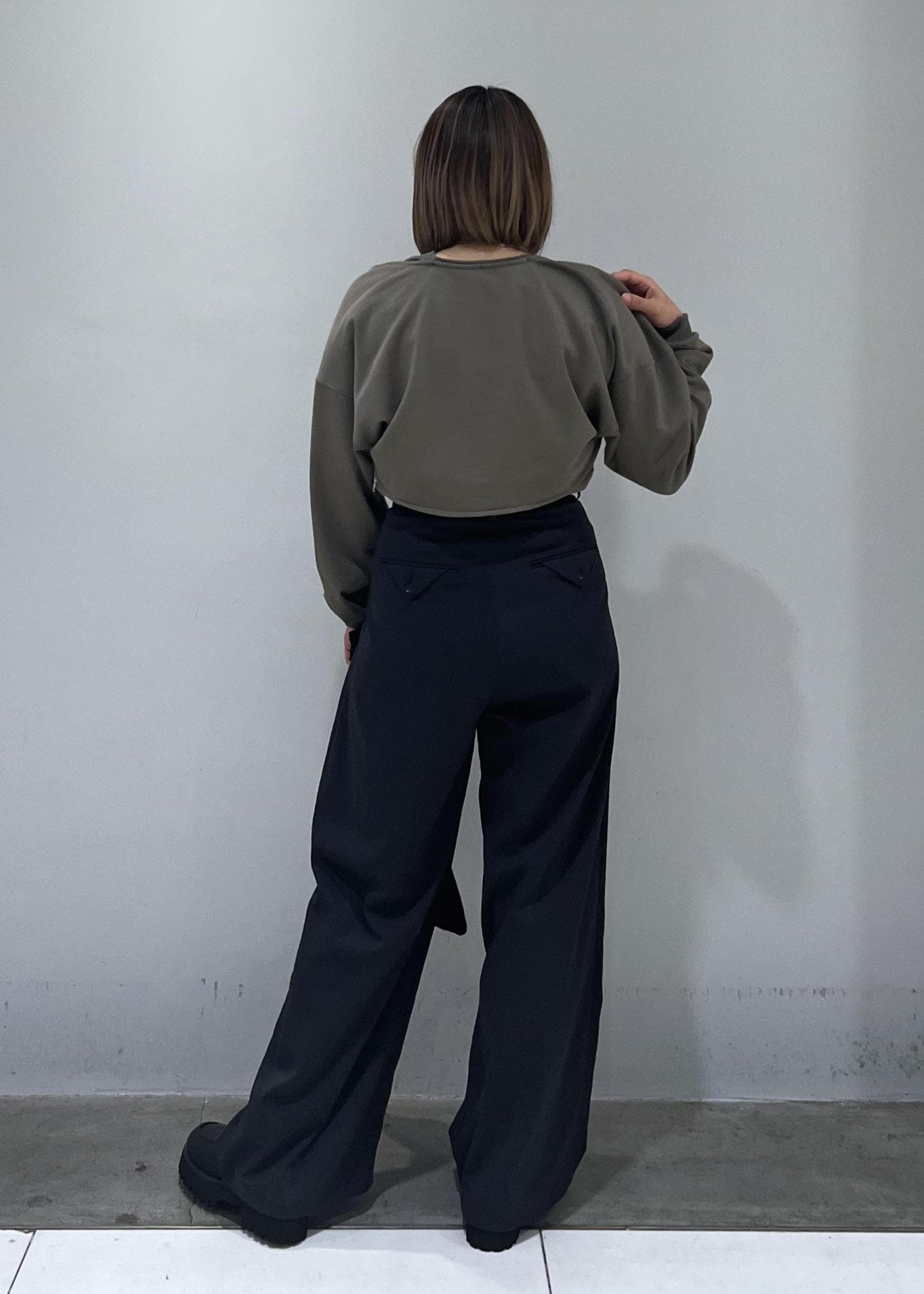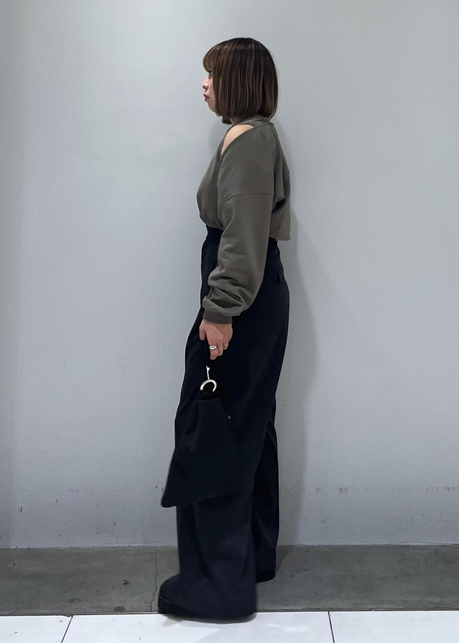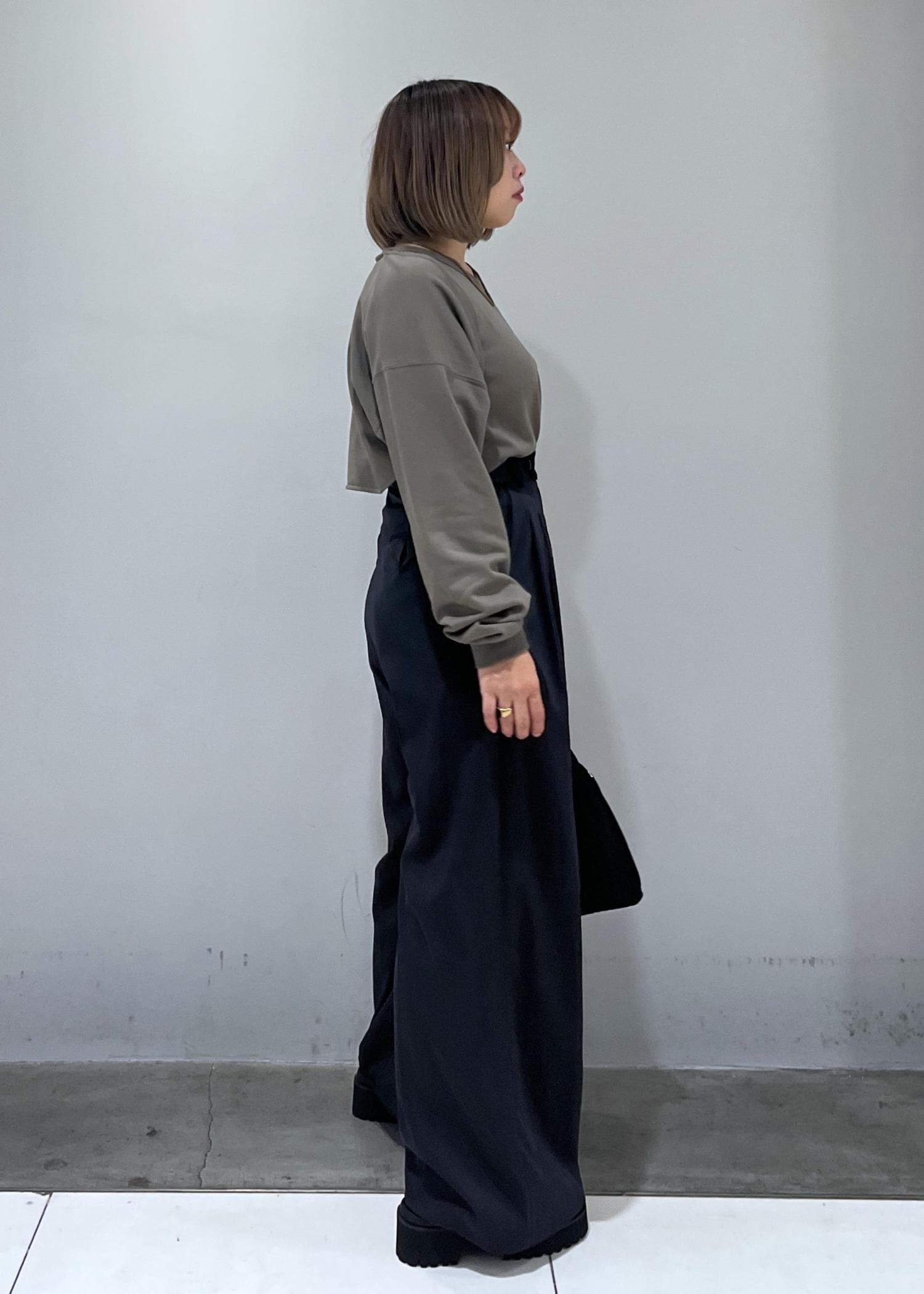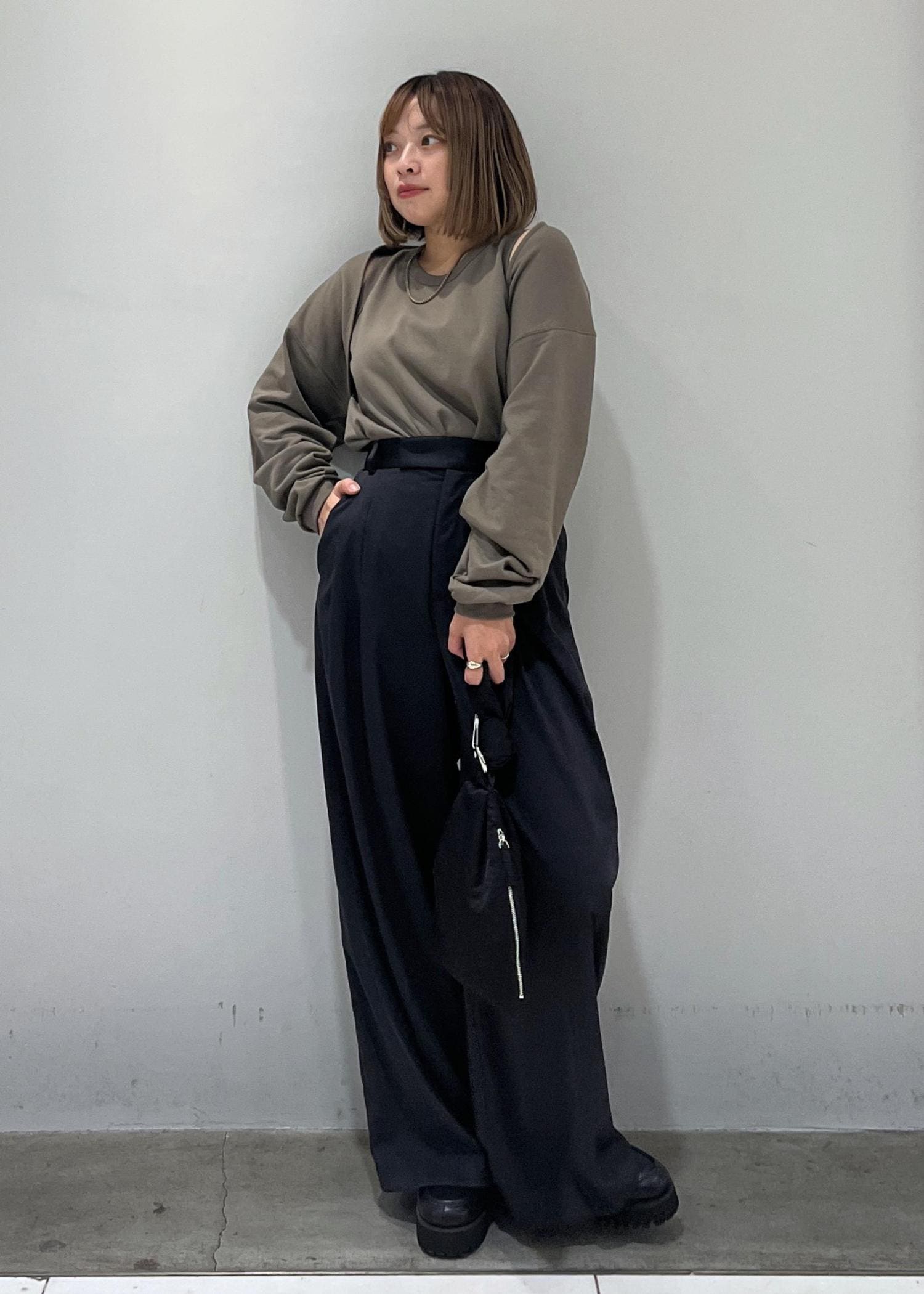 スウェット素材で楽ちんですが、ちらっと肌見せができるのでカジュアルすぎず、着用しやすいです!