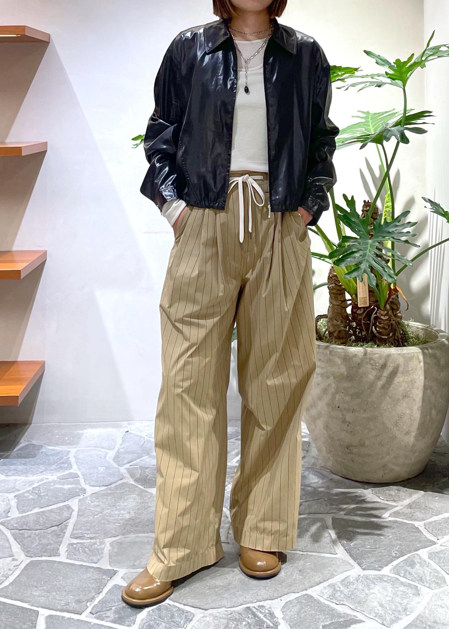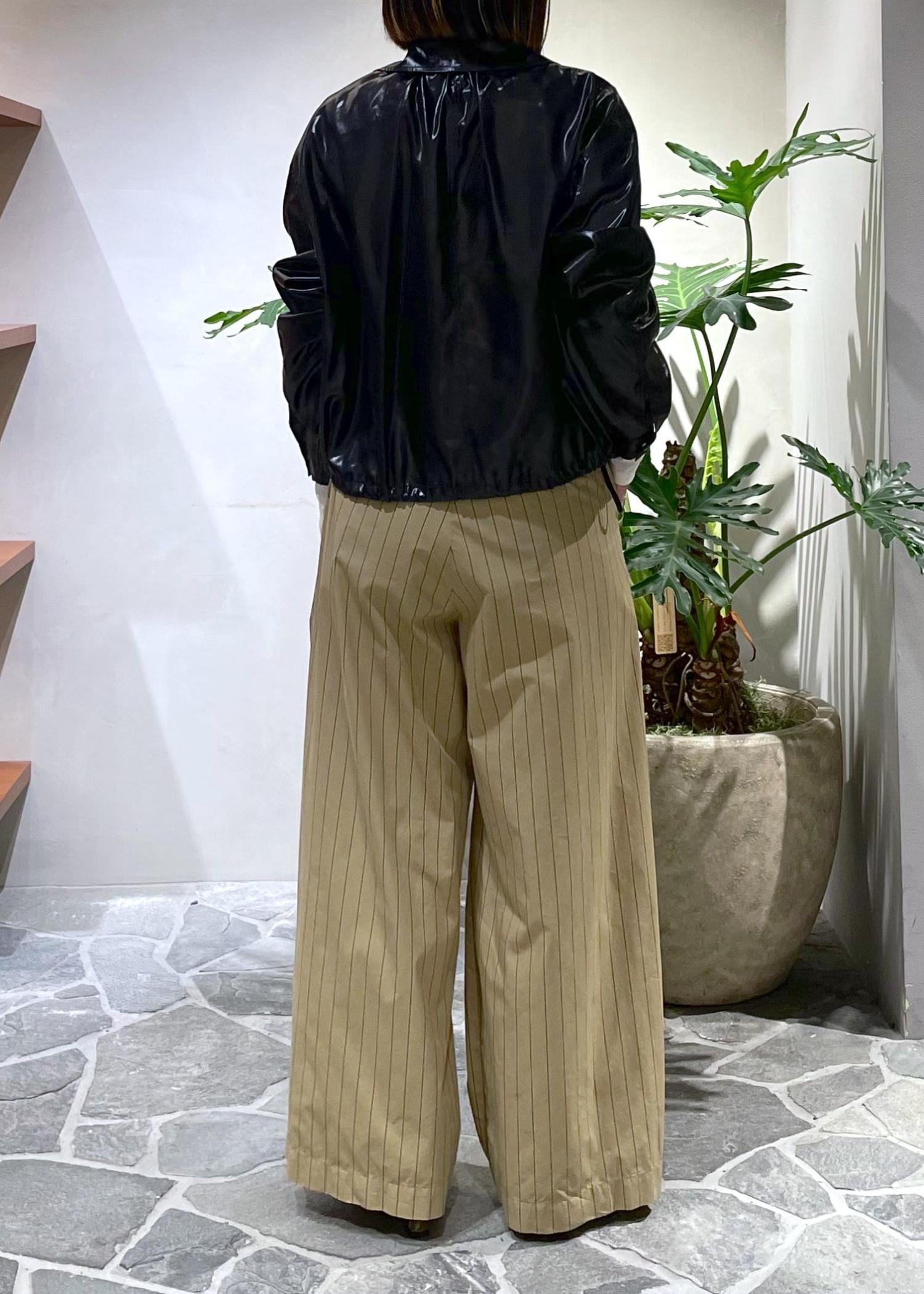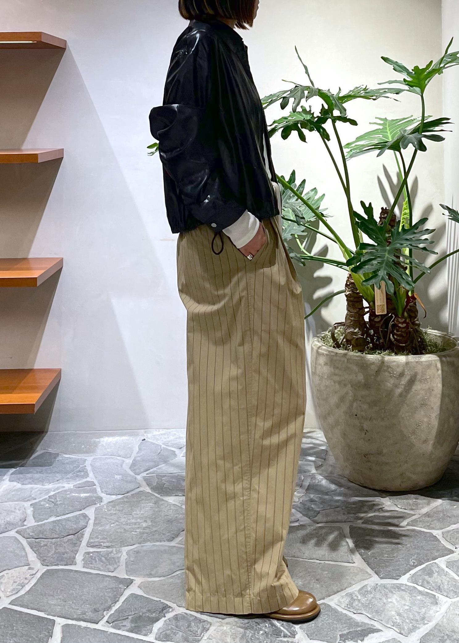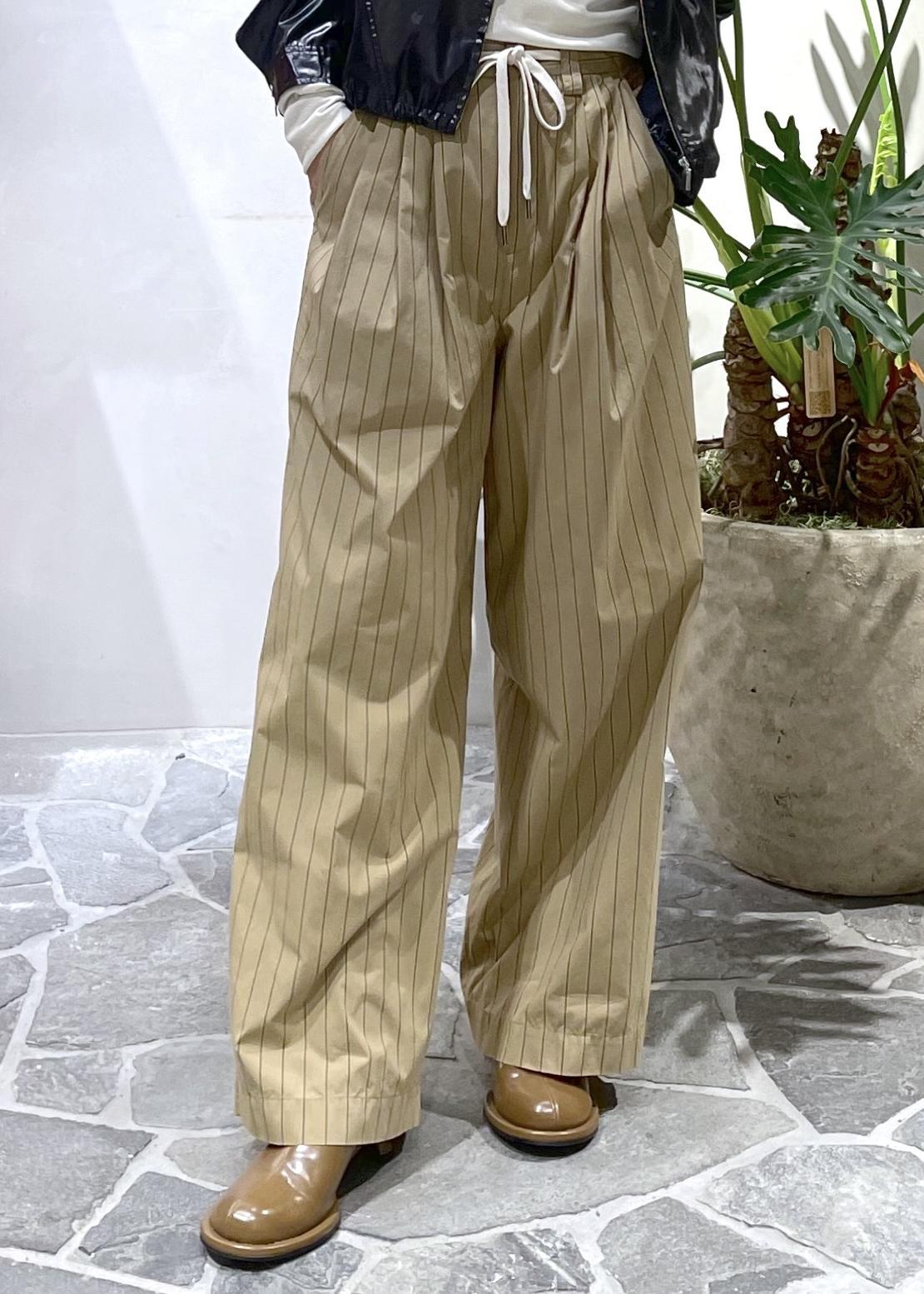 ワイドシルエットとタック入りでパジャマ感も出にくいストライプパンツです。 -