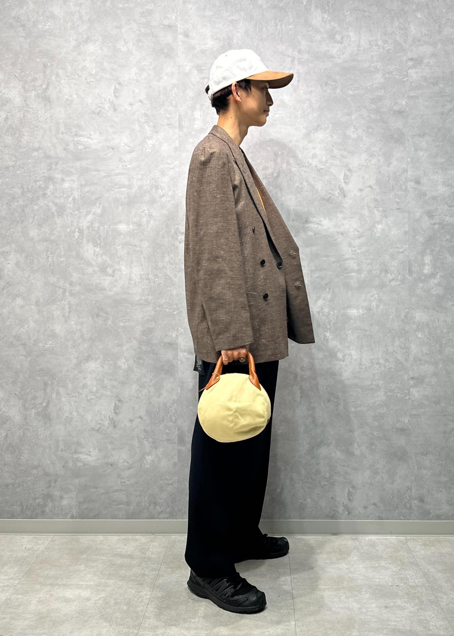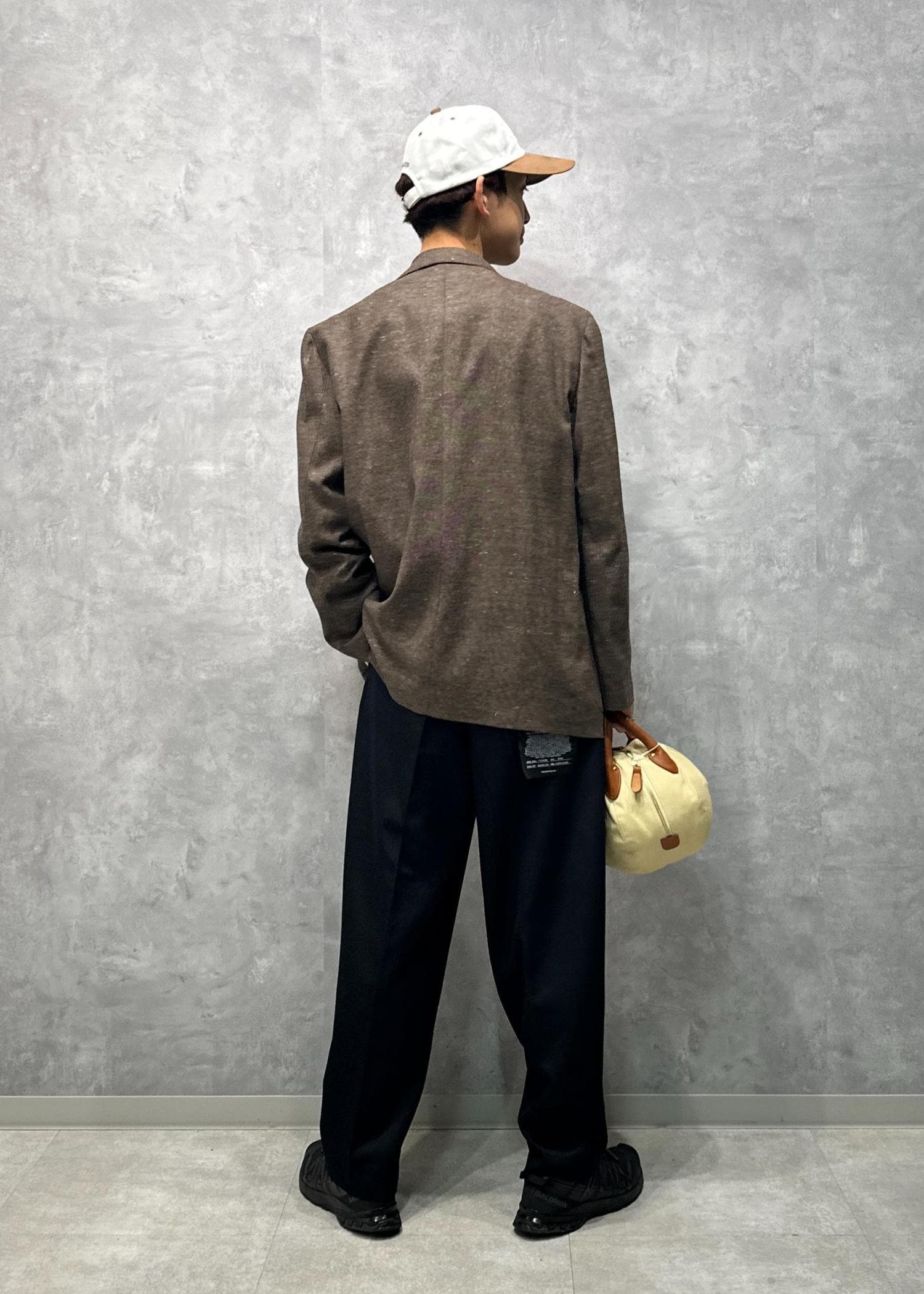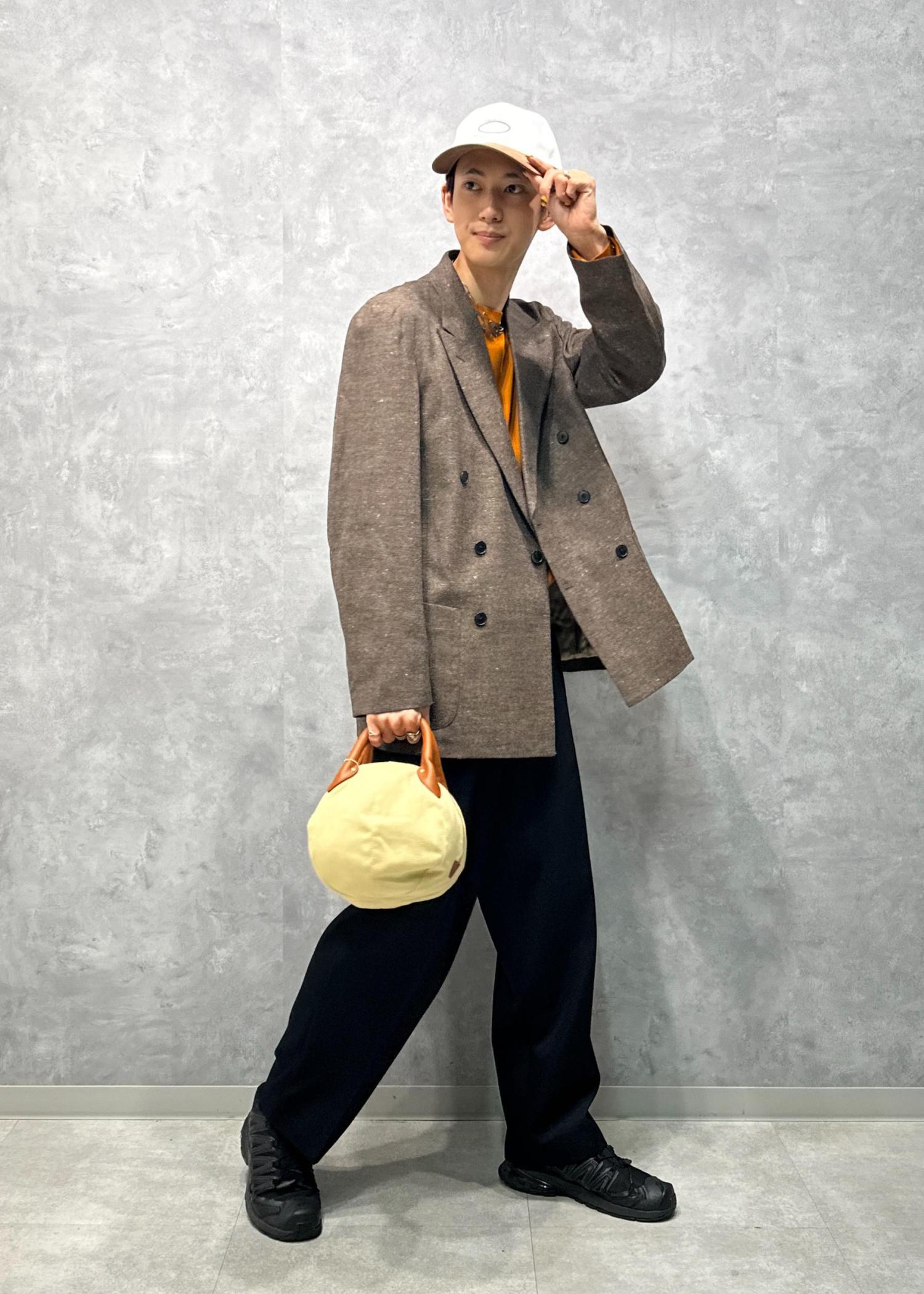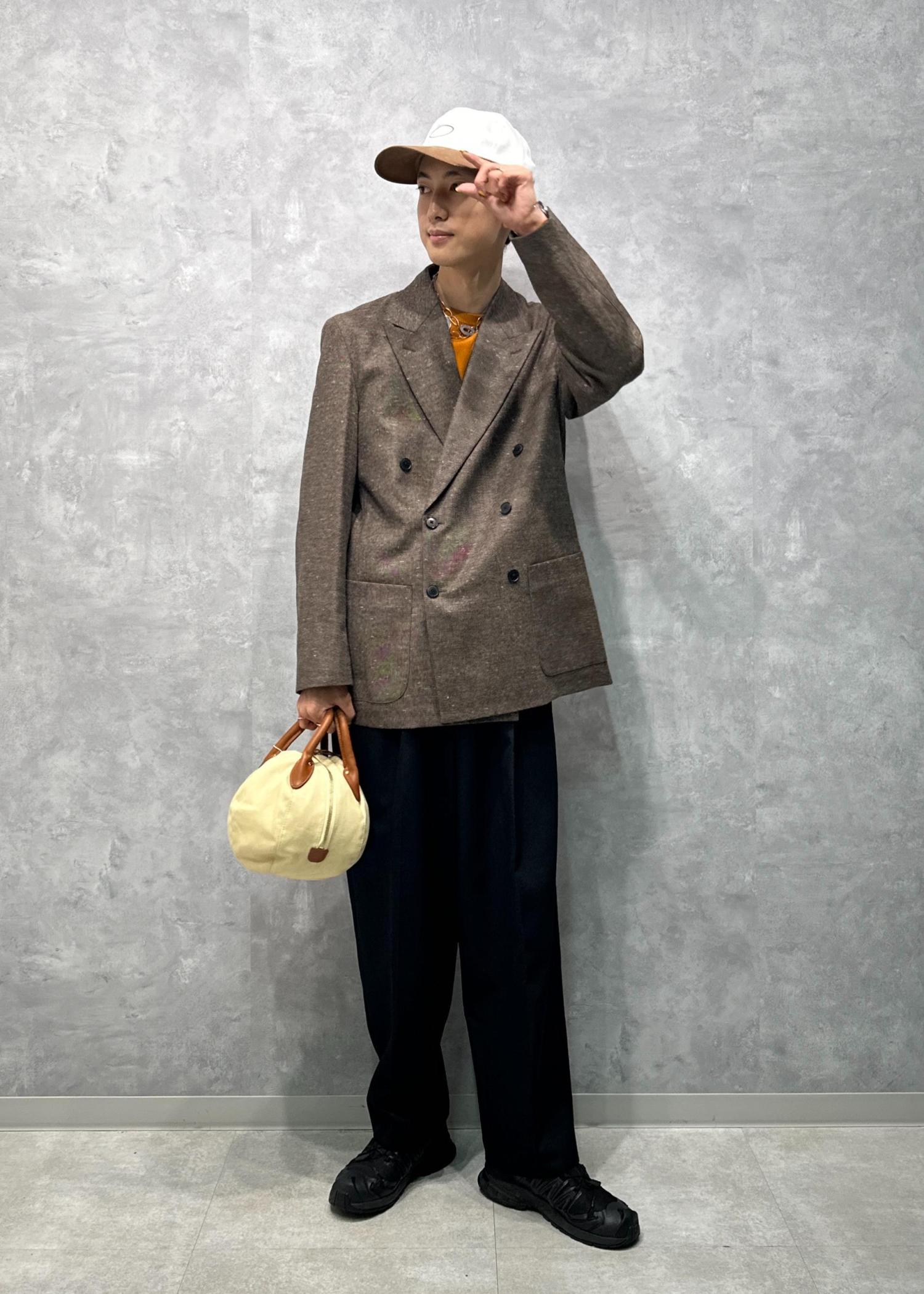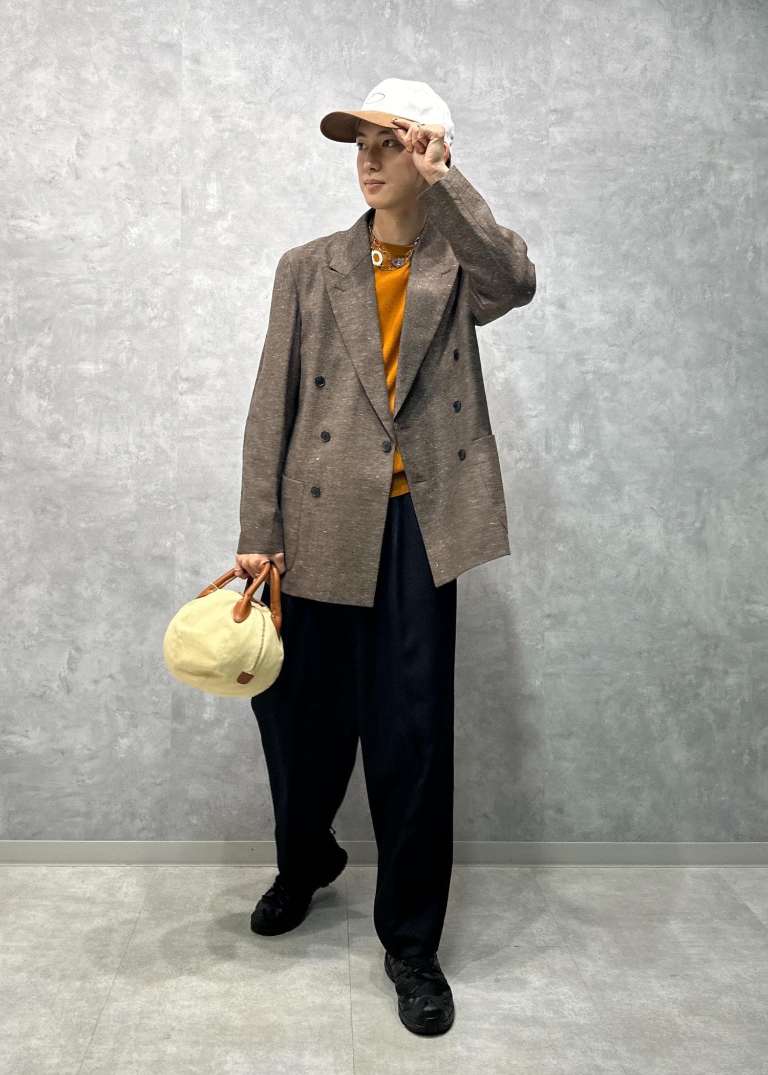 ボックスシルエット、ピークドラペル、ダブルブレストの形でとにかくかっこいいテーラードジャケットです。大きめなので私服使いしやすく、ちょっぴりカジュアルに寄っています。