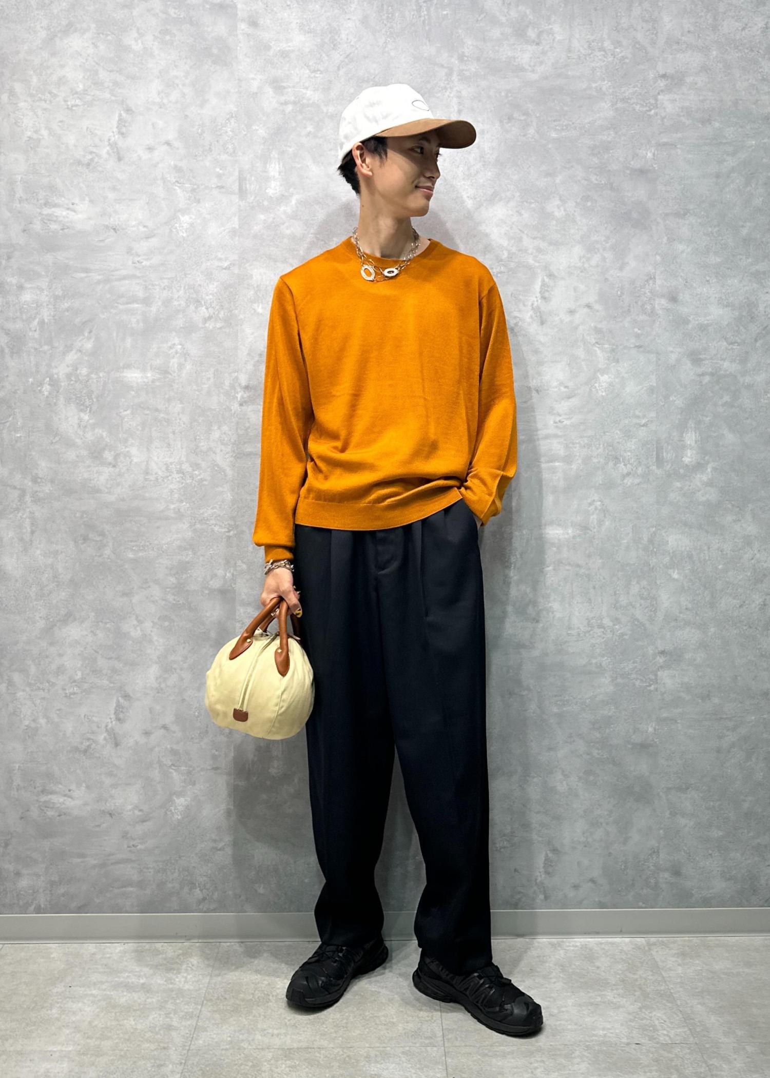 ブラウン×イエローで秋らしく、キャップにスニーカーでラフな印象に仕上げた大人カジュアルコーデです。シルエットは全体的にゆったりとしつつも綺麗で上品に。大人の余裕を感じさせるようなシルエット、雰囲気に仕上げました。