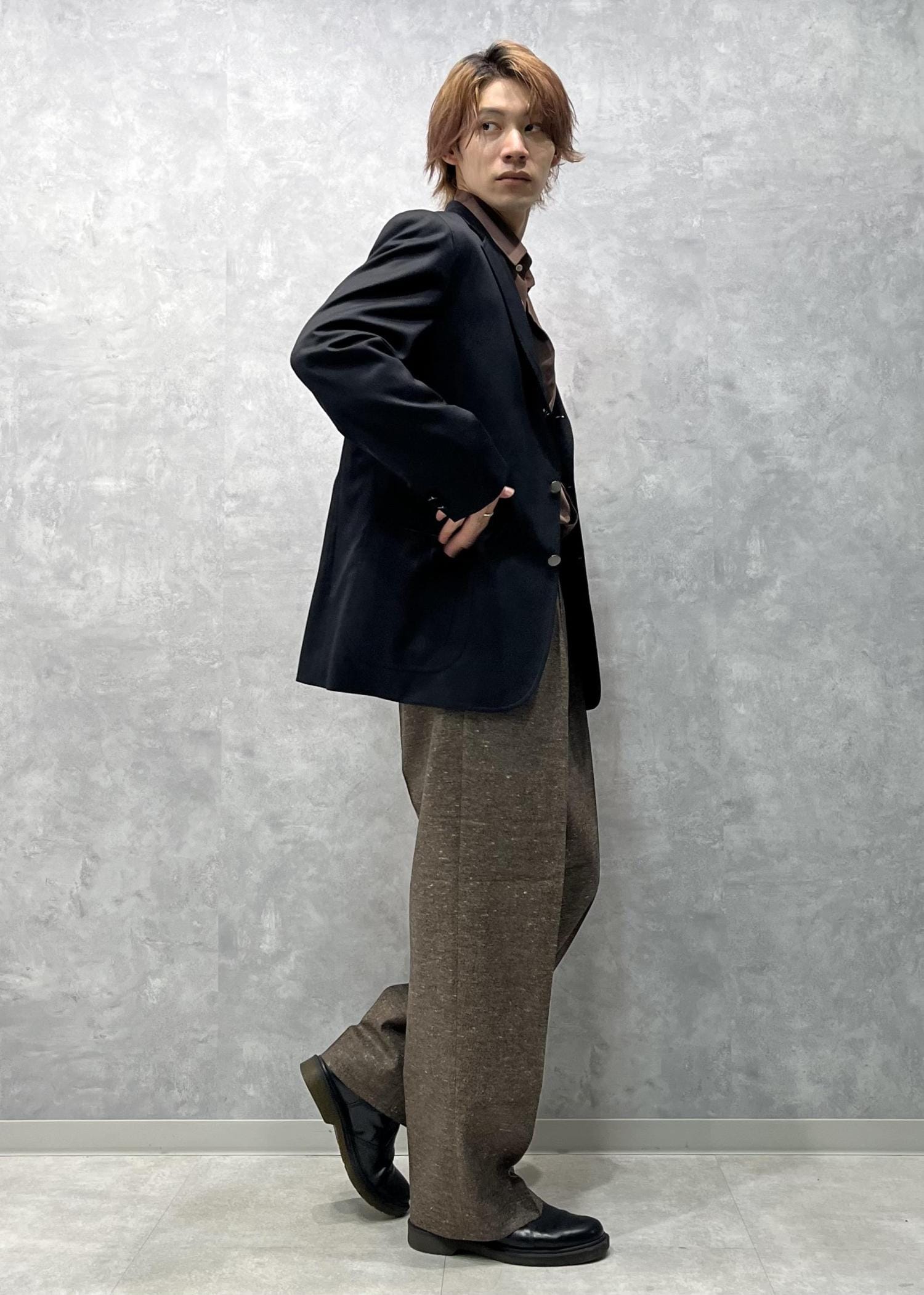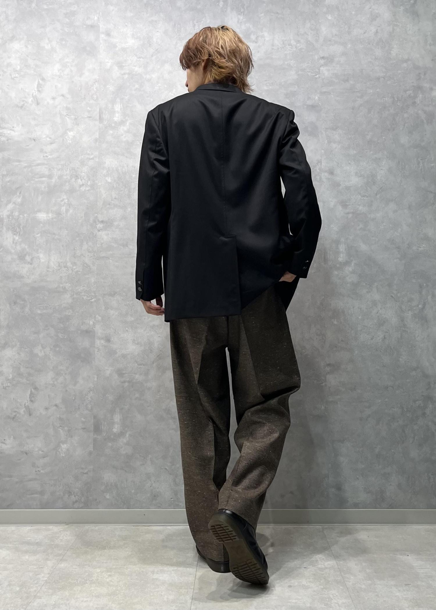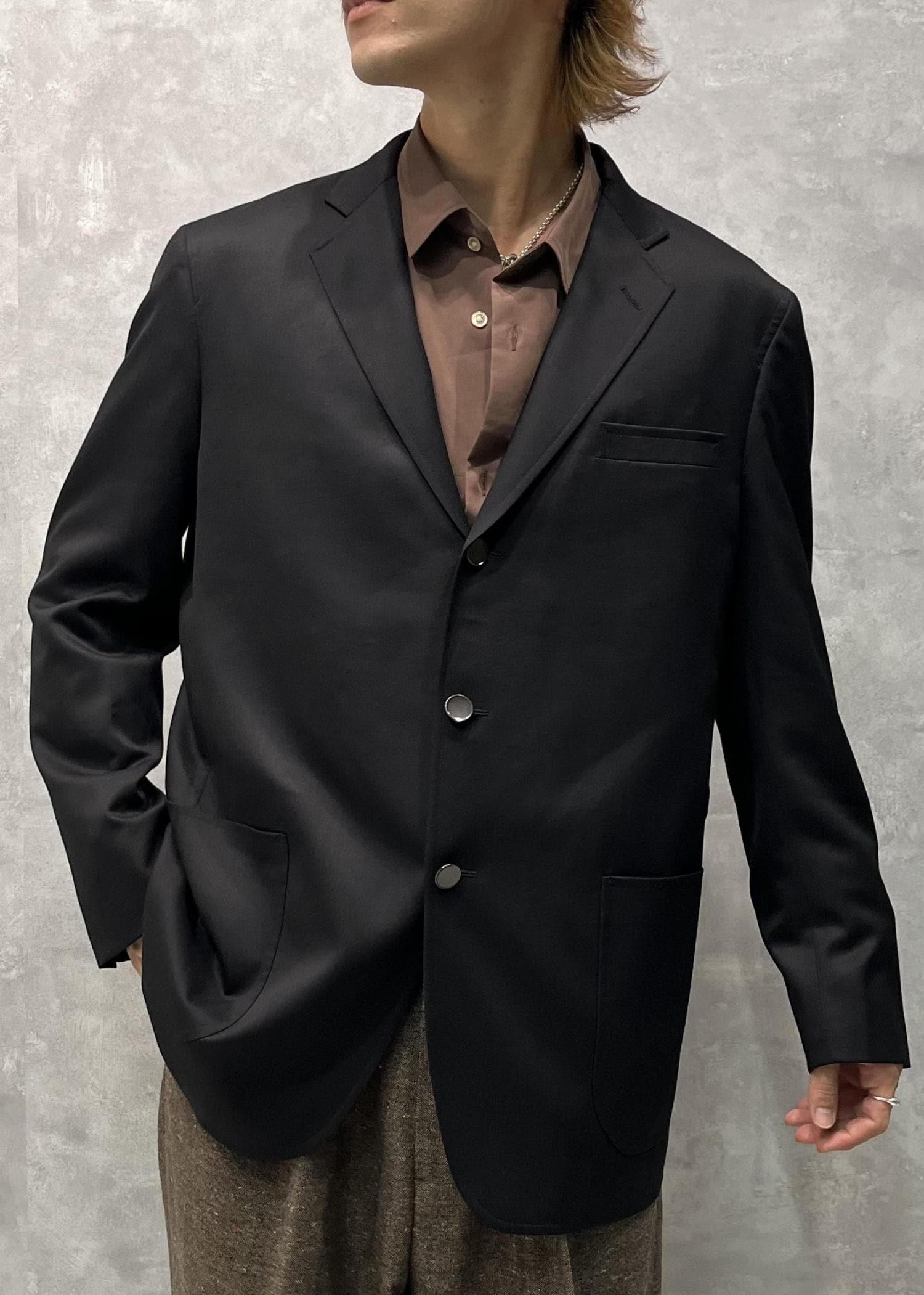 ウール100%の素材の良さと裏地もキャプラ100%と肌触りも着心地も良く、ボックスシルエットなつくりがフォーマルすぎないかっこいい別注ジャケットです。 -