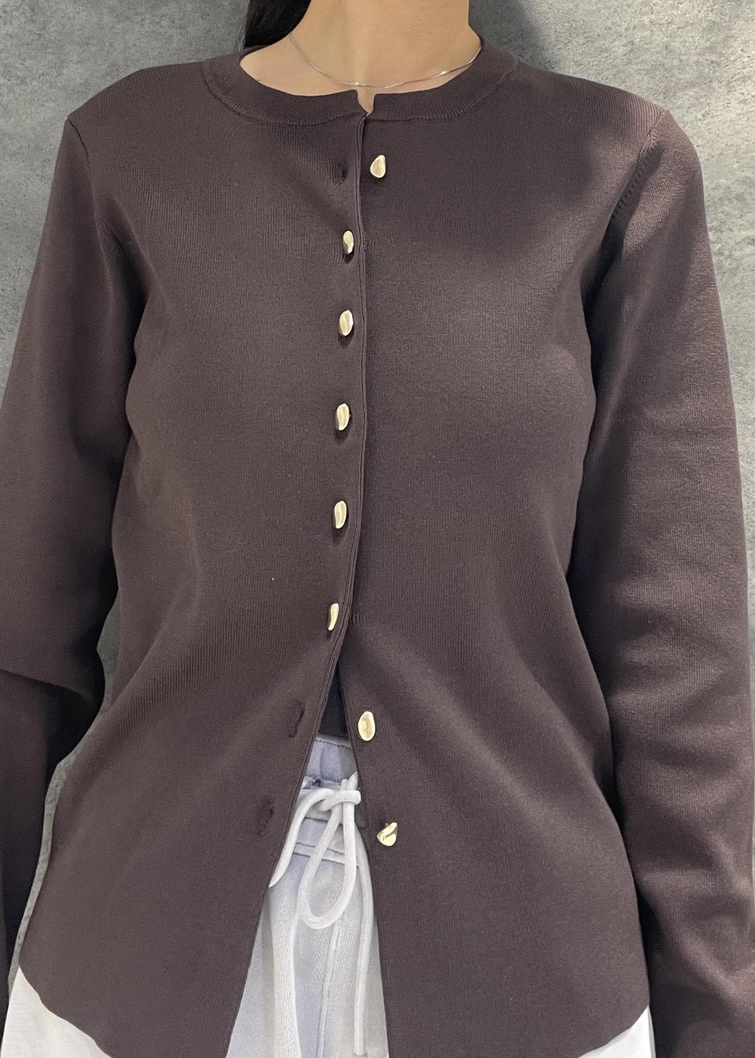 ブルー×ブラウンの組み合わせが最近流行っているのでトップスは深めのブラウンカーディガンを。