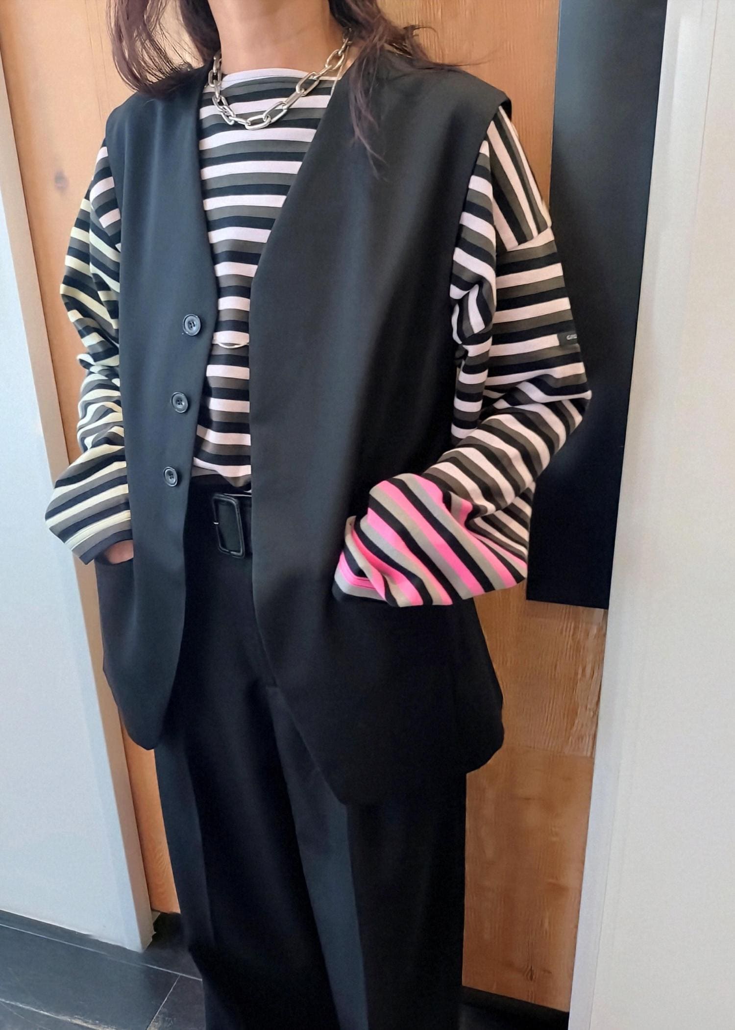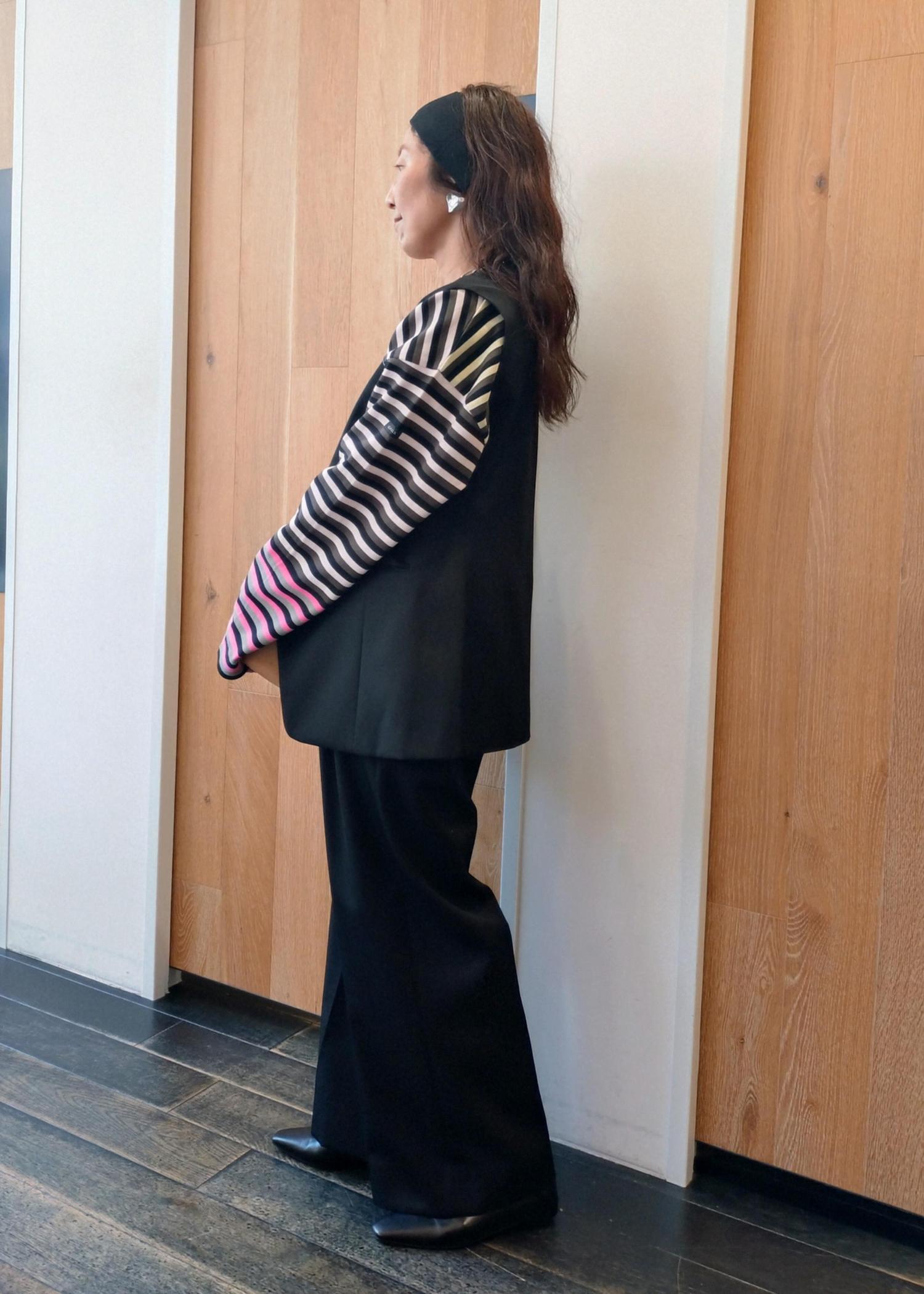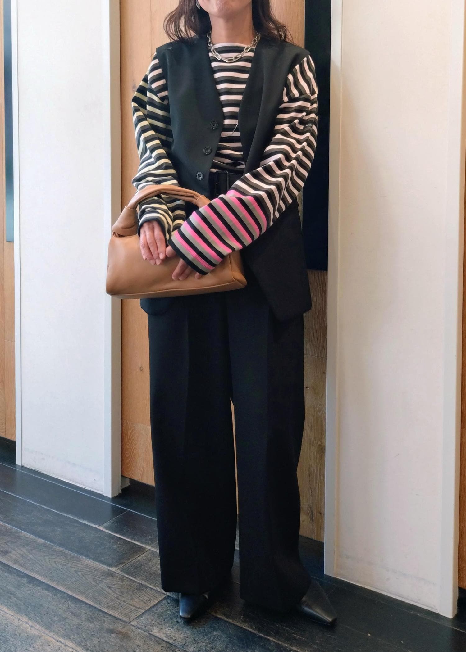 コーディネートは配色が分かりやすいようにブラックで合わせて、ボーダーがカジュアルな雰囲気なので、ジレとパンツでシックにしてみました。
