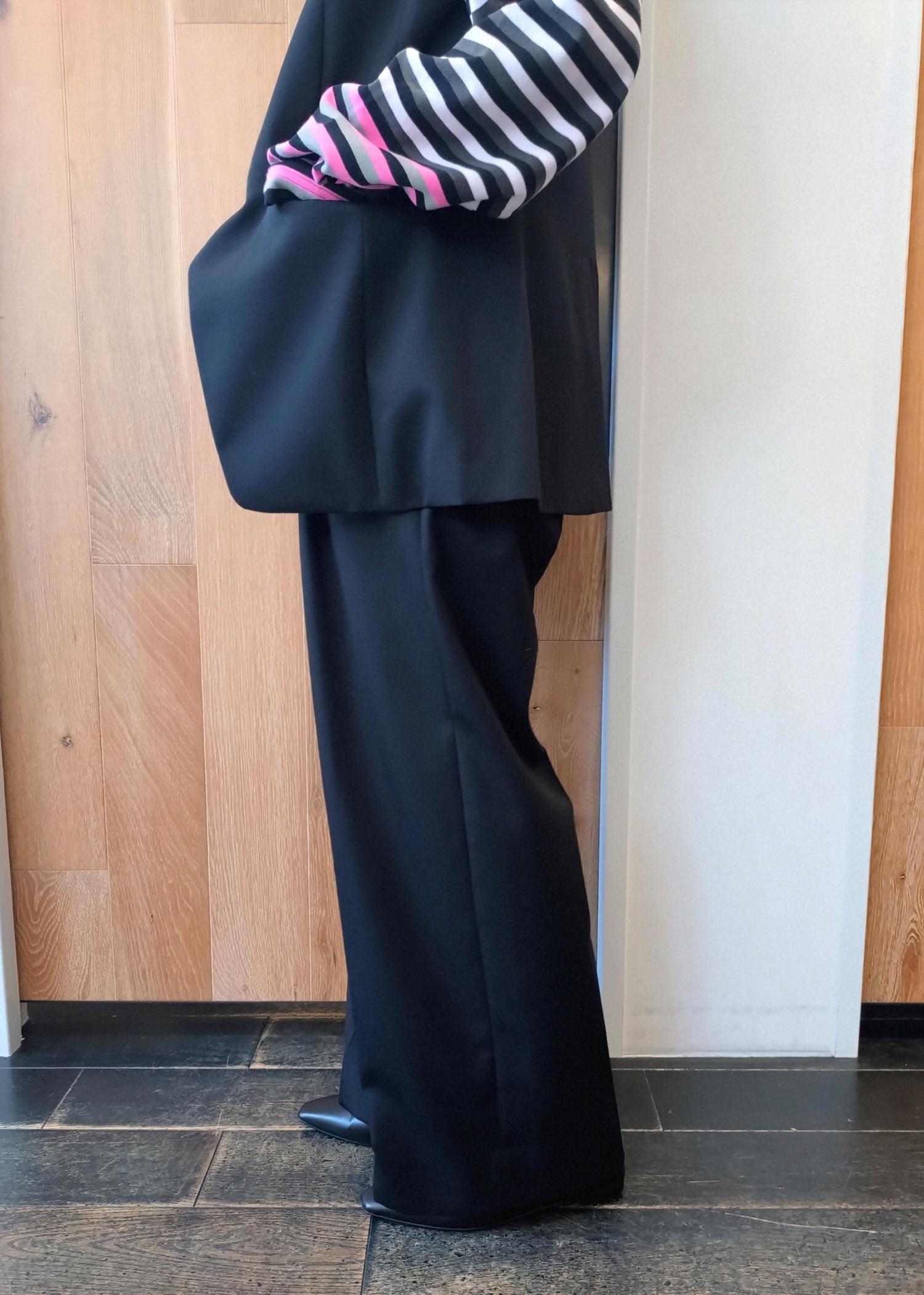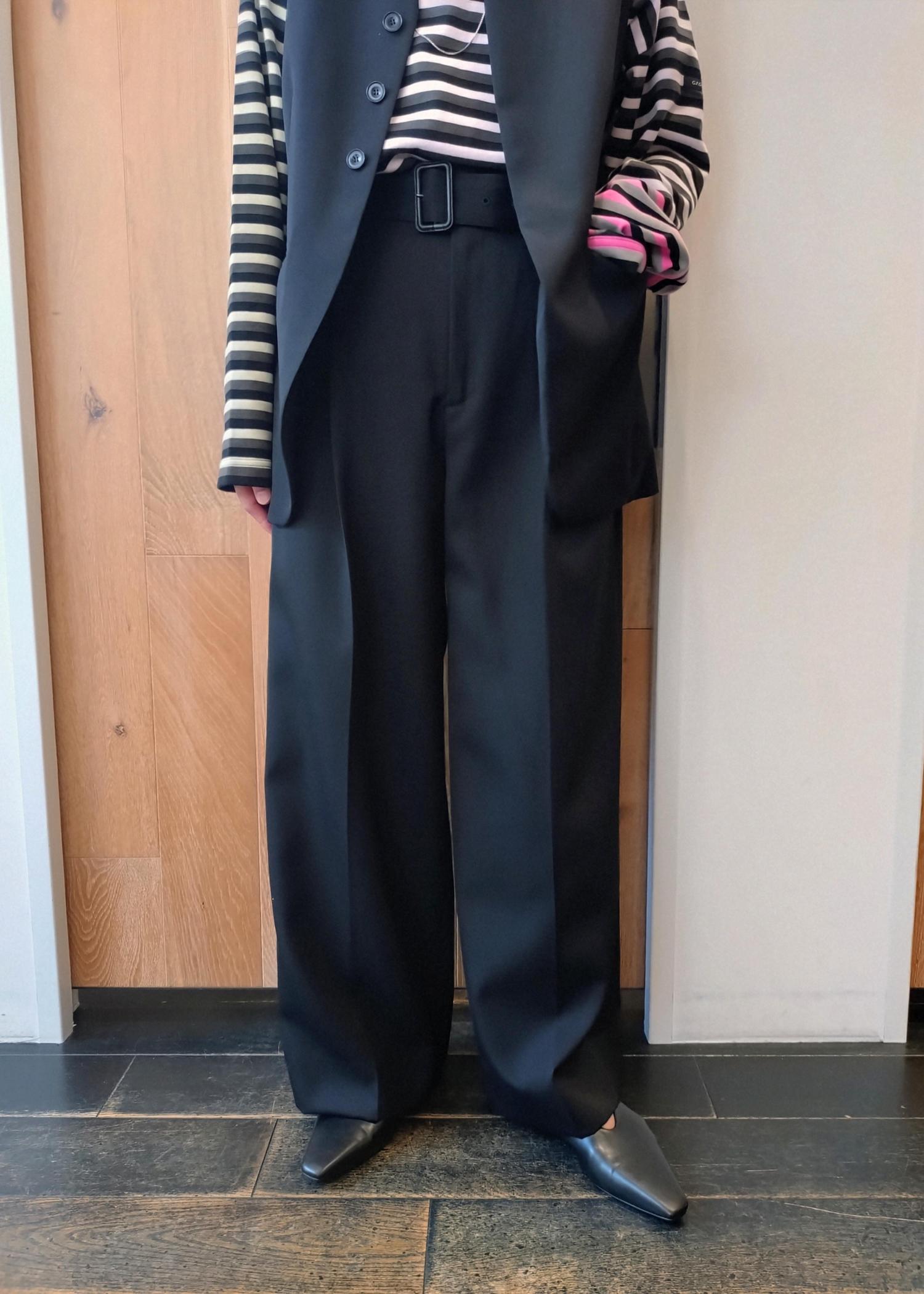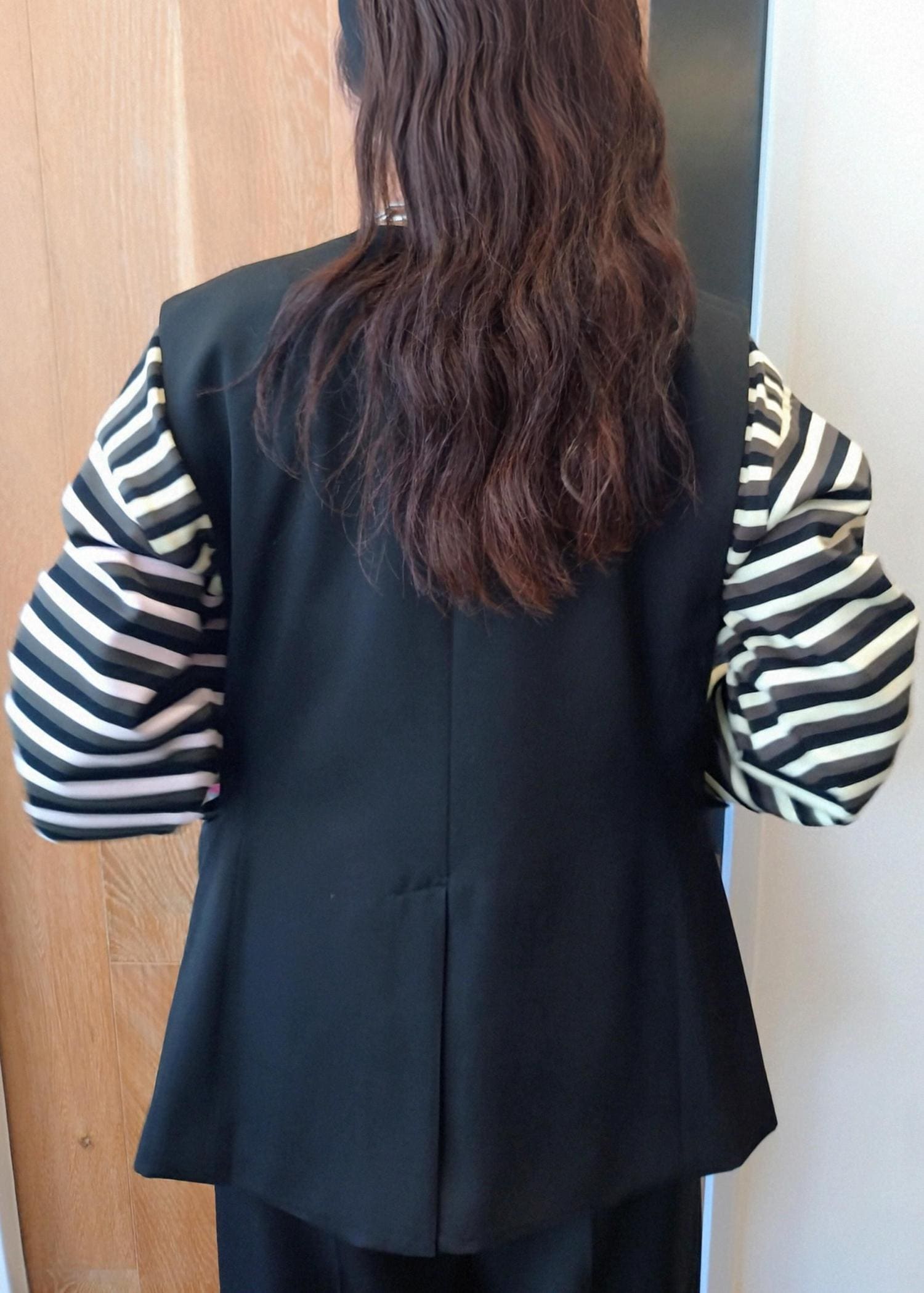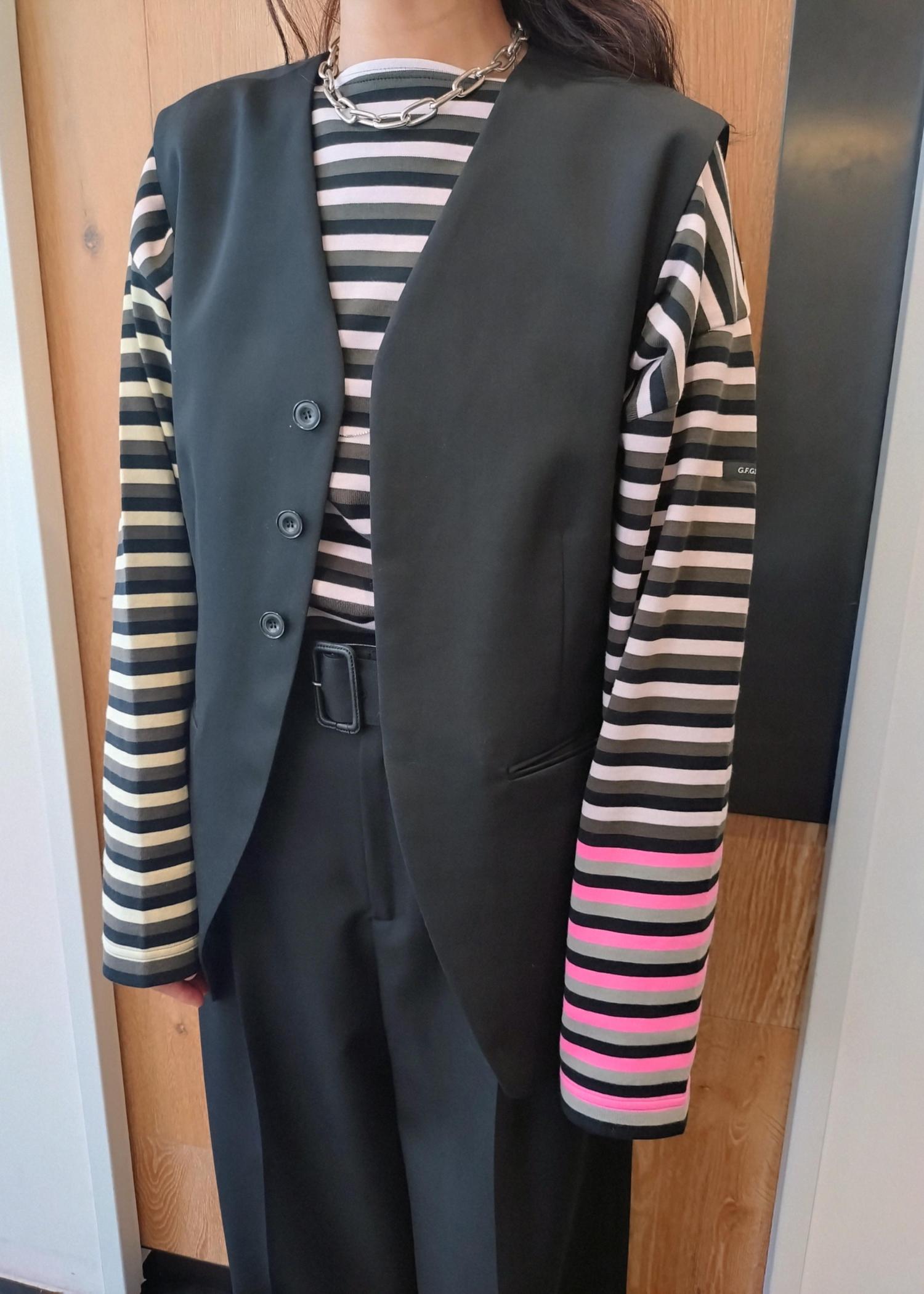 コーディネートは配色が分かりやすいようにブラックで合わせて、ボーダーがカジュアルな雰囲気なので、ジレとパンツでシックにしてみました。