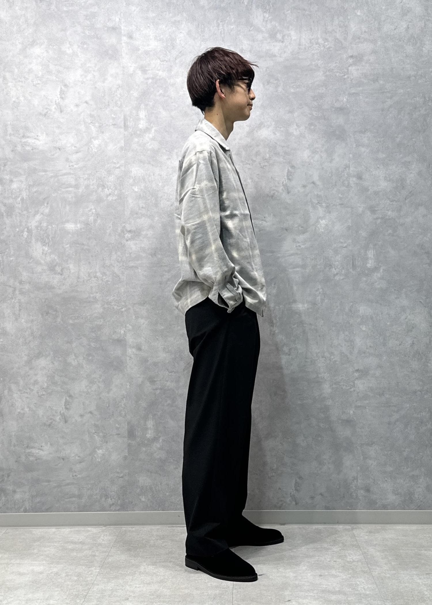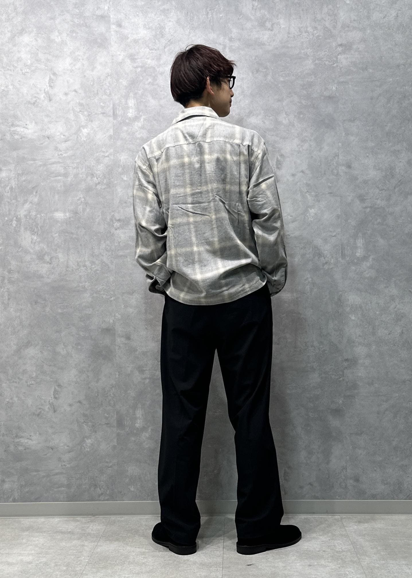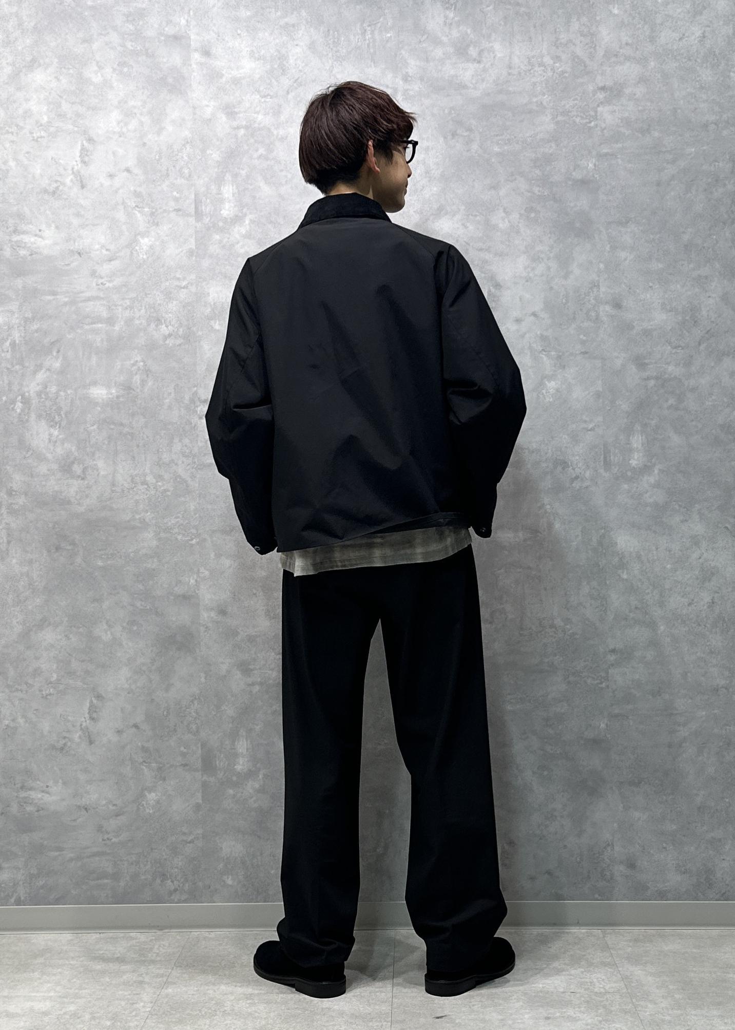 スタイリッシュな黒スラックスにバブアーのジャケットを組み合わせたオールブラックコーデです。インナーにチェックシャツを仕込み、レイヤードして差し色にしました。差し色があることで重たすぎず、殺風景にならないように仕上げました。