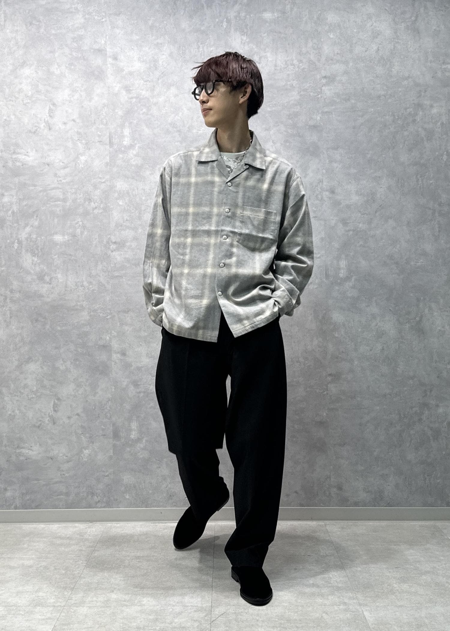 ややルーズめなサイズ感のオンブレチェックシャツ。オープンカラーの形なので首元スッキリで苦しさもないです。コットン100%で温かみがあり、秋らしい風合いです。落ち着いた色味で合わせやすく、インナーでも存在感を発揮してくれます。
