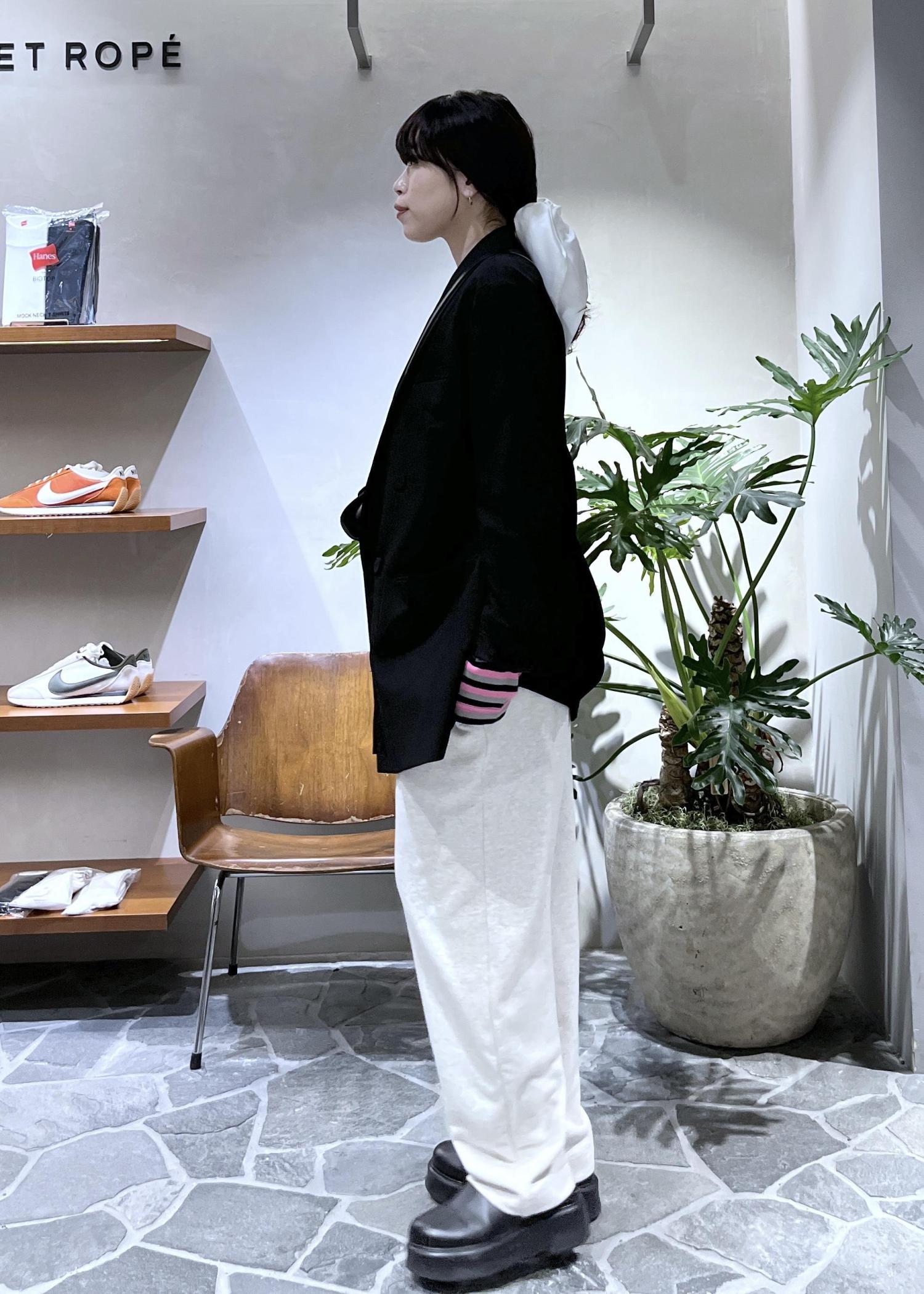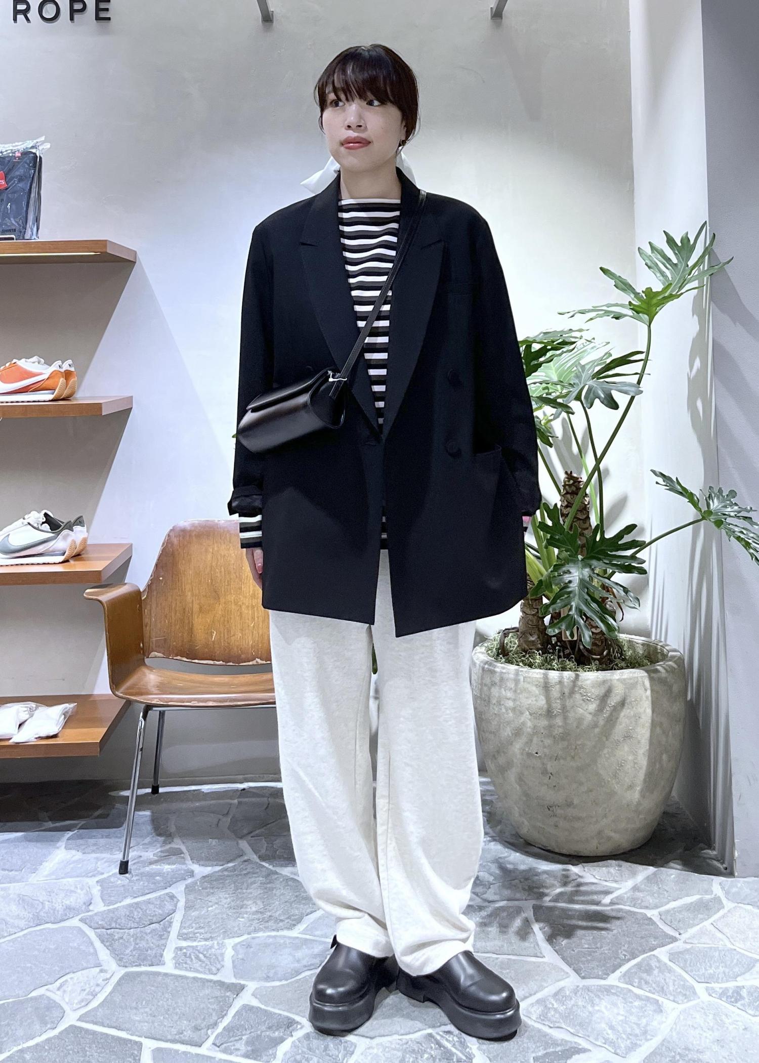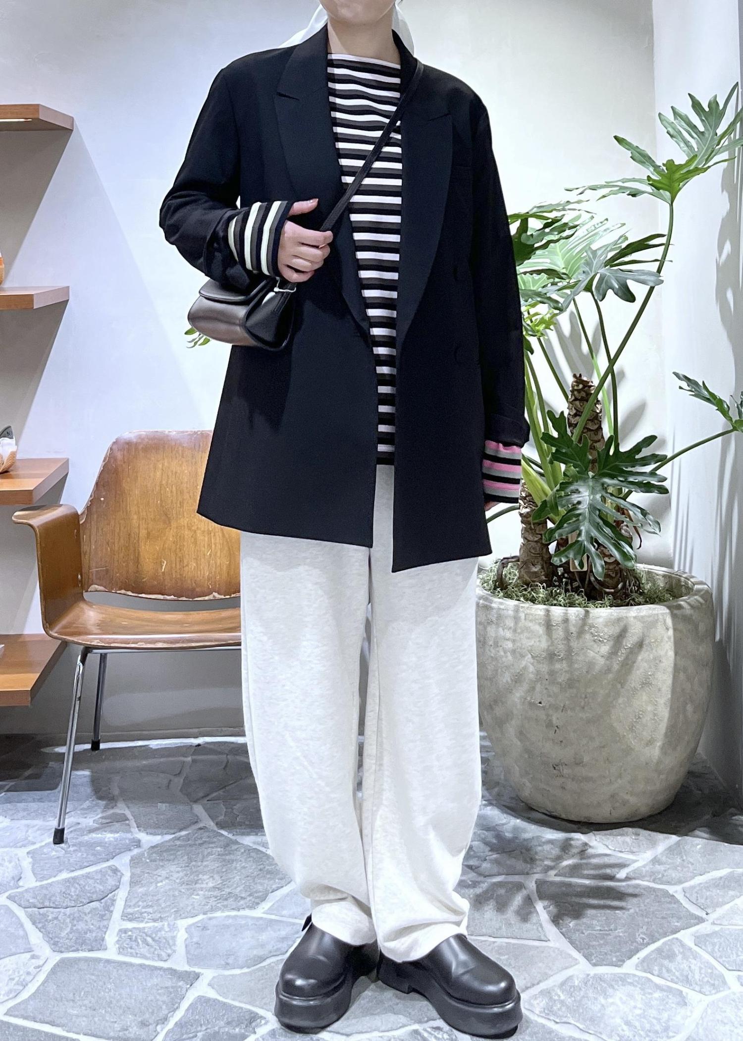 ジャケットがかっちりしすぎないようにカットソーとスウェットパンツで引き締めました。