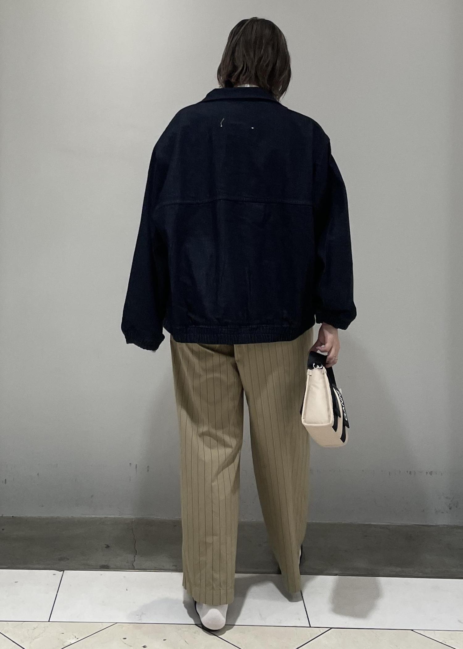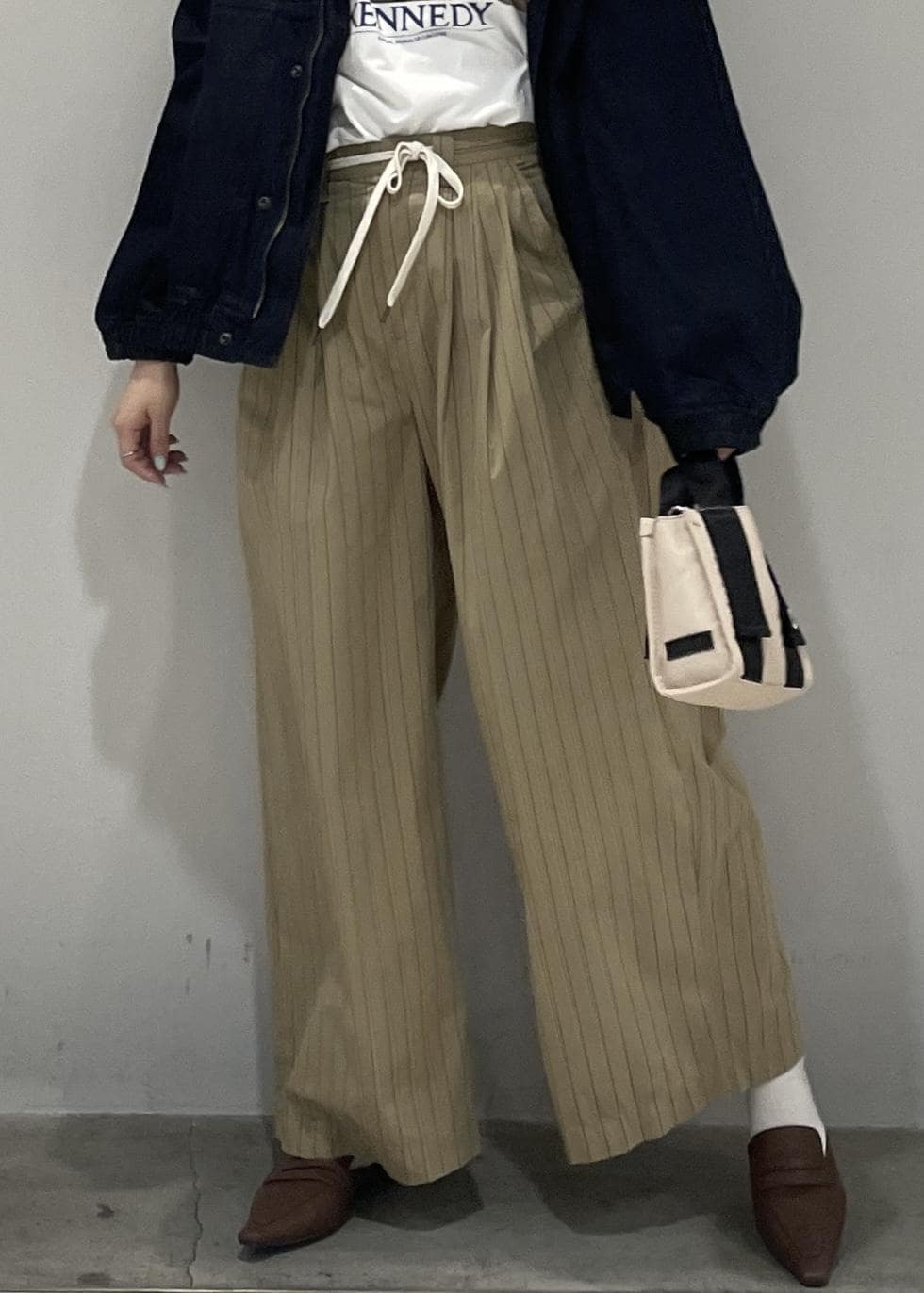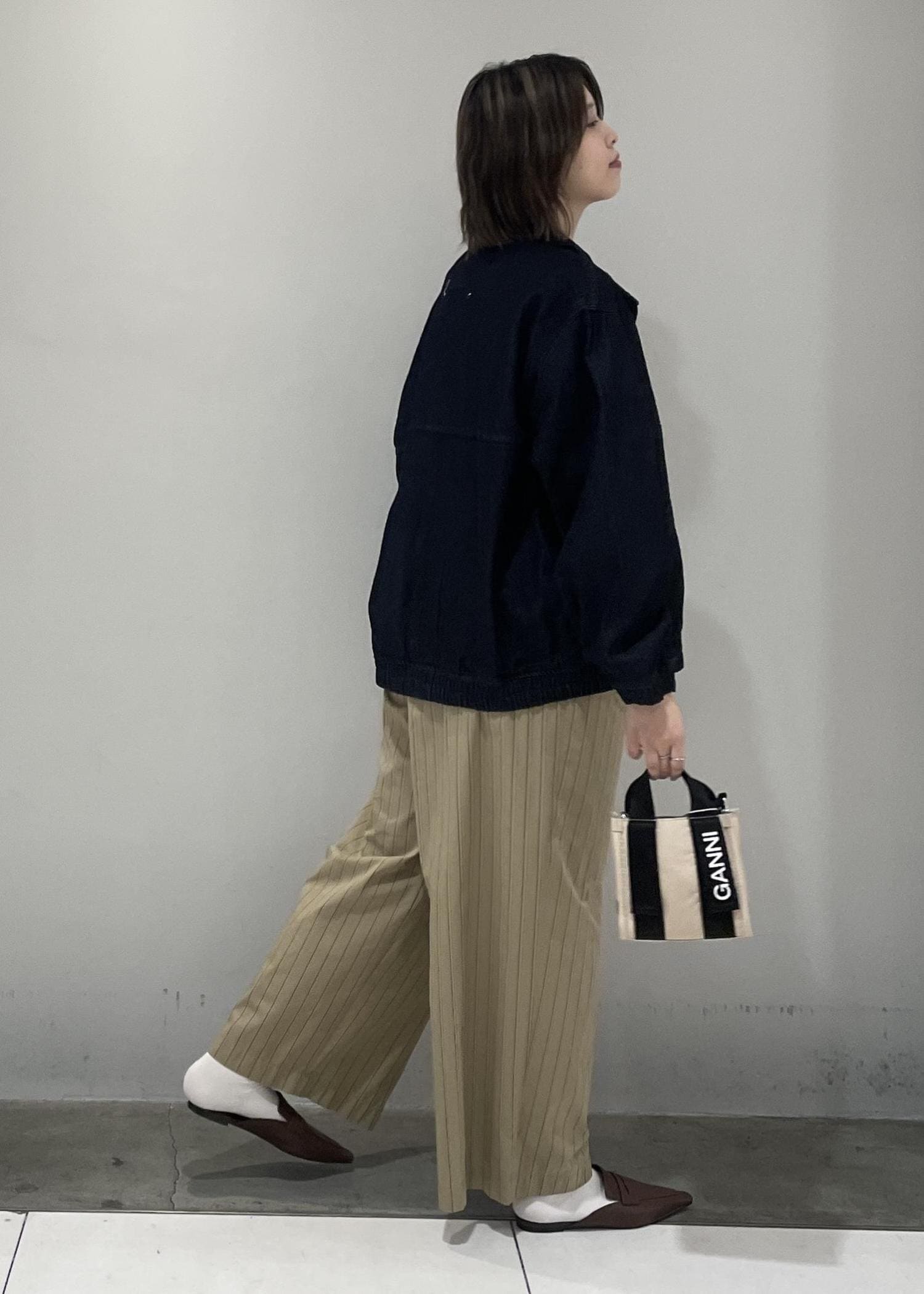 トップスがオーバーな分、ボトムスには抜け感のあるストライプパンツを、シューズにはすっきりしたフラットパンプスを合わせてバランスを取りました◎