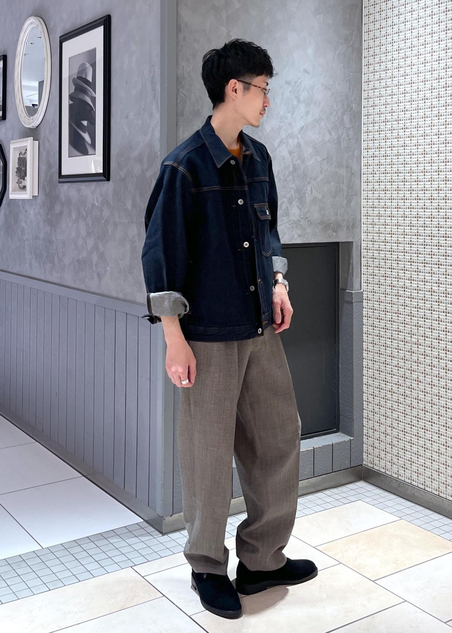 オーバーなサイジングが現代的なコーディネートに。