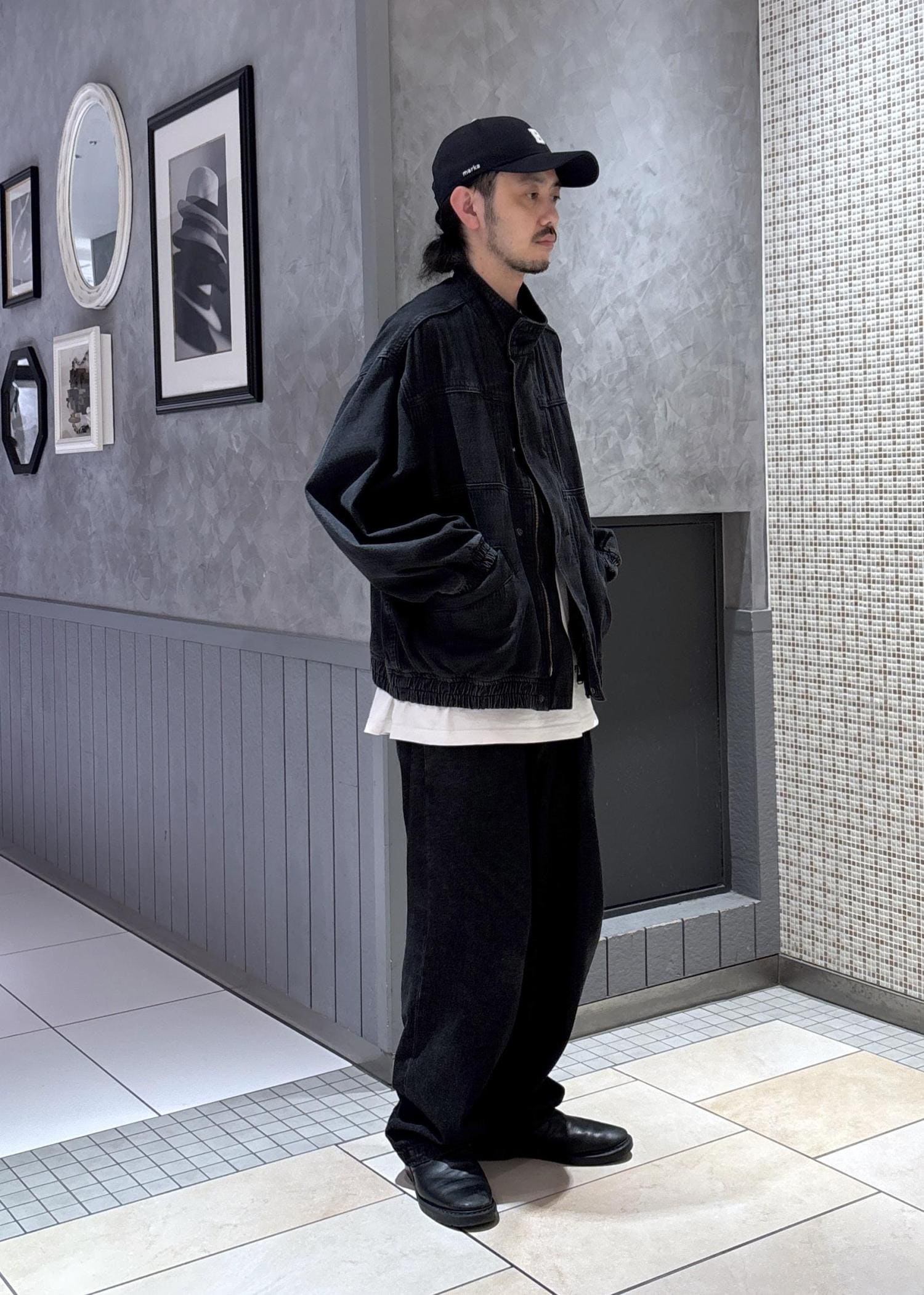 デニム素材のボマージャケットに、ワイドシルエットのデニムパンツでゆるめのセットアップスタイルです。