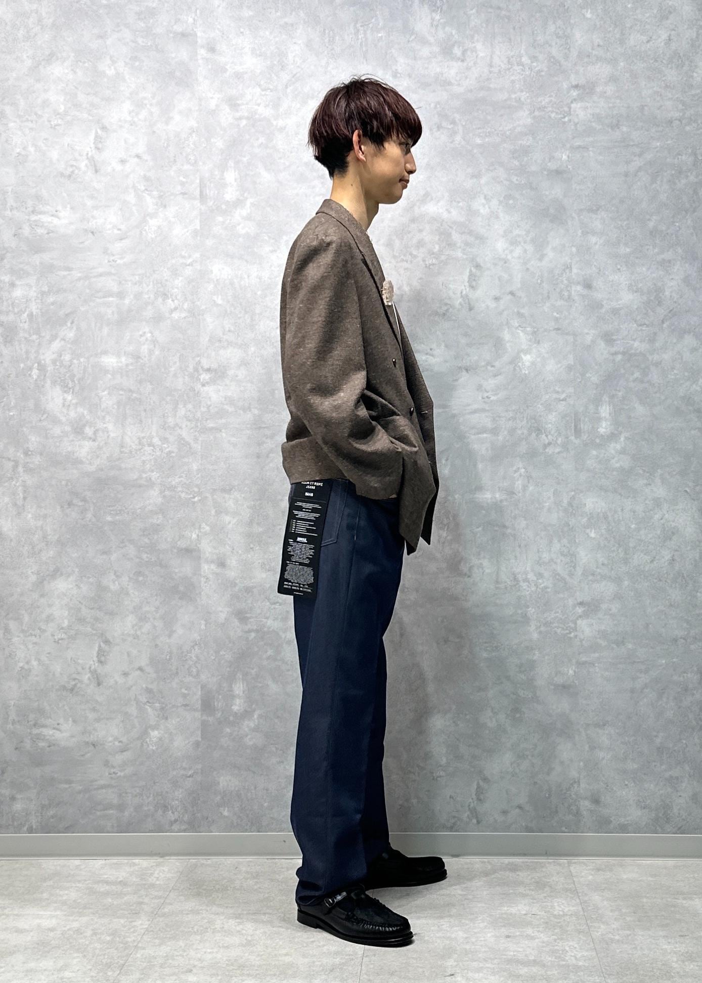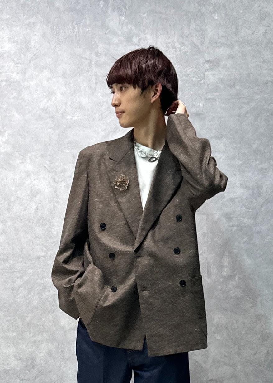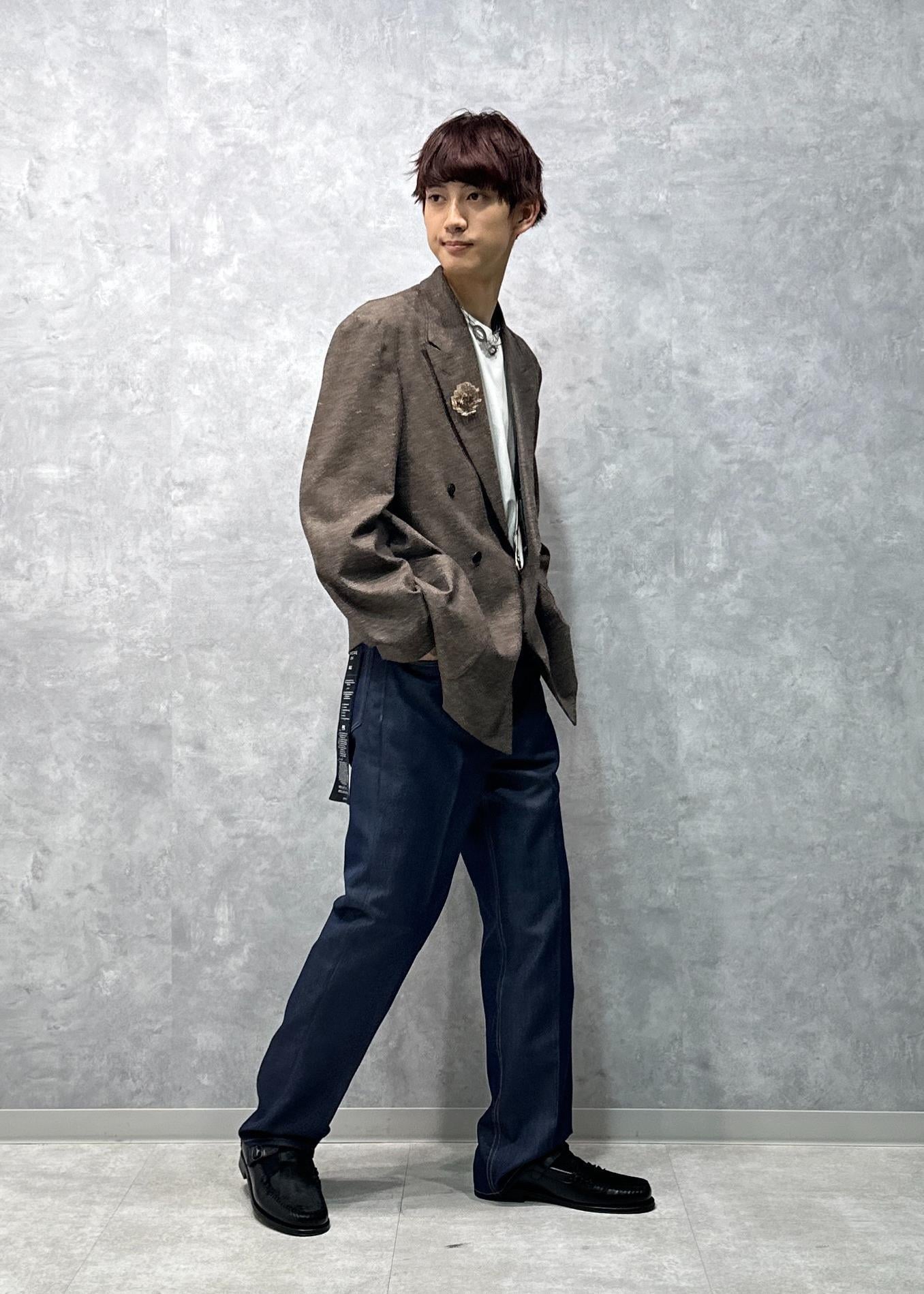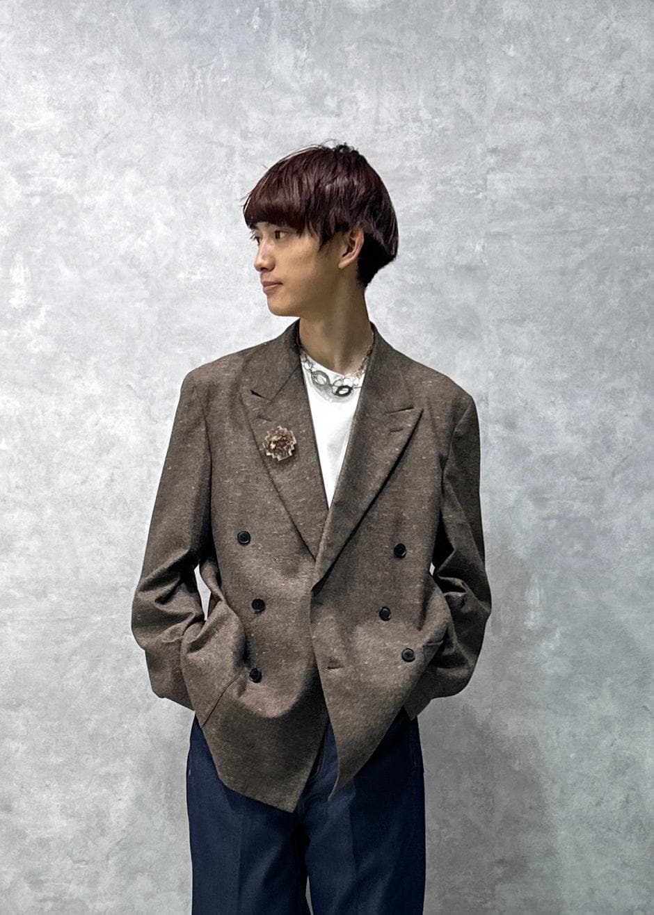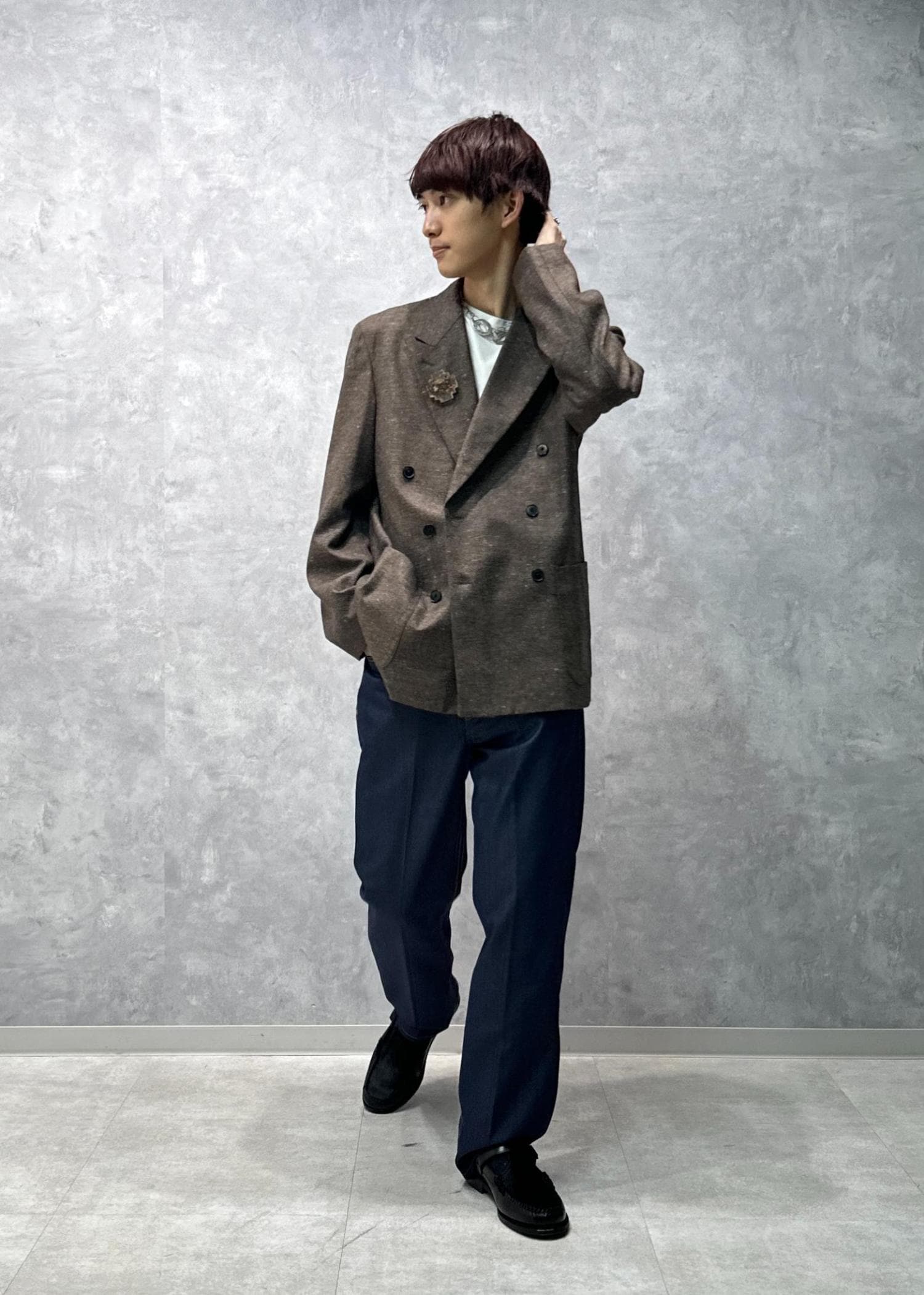 ボックスシルエット、ピークドラペル、ダブルブレストの形でとにかくかっこいいテーラードジャケットです。大きめなので私服使いしやすく、ちょっぴりカジュアルに寄っています。 -