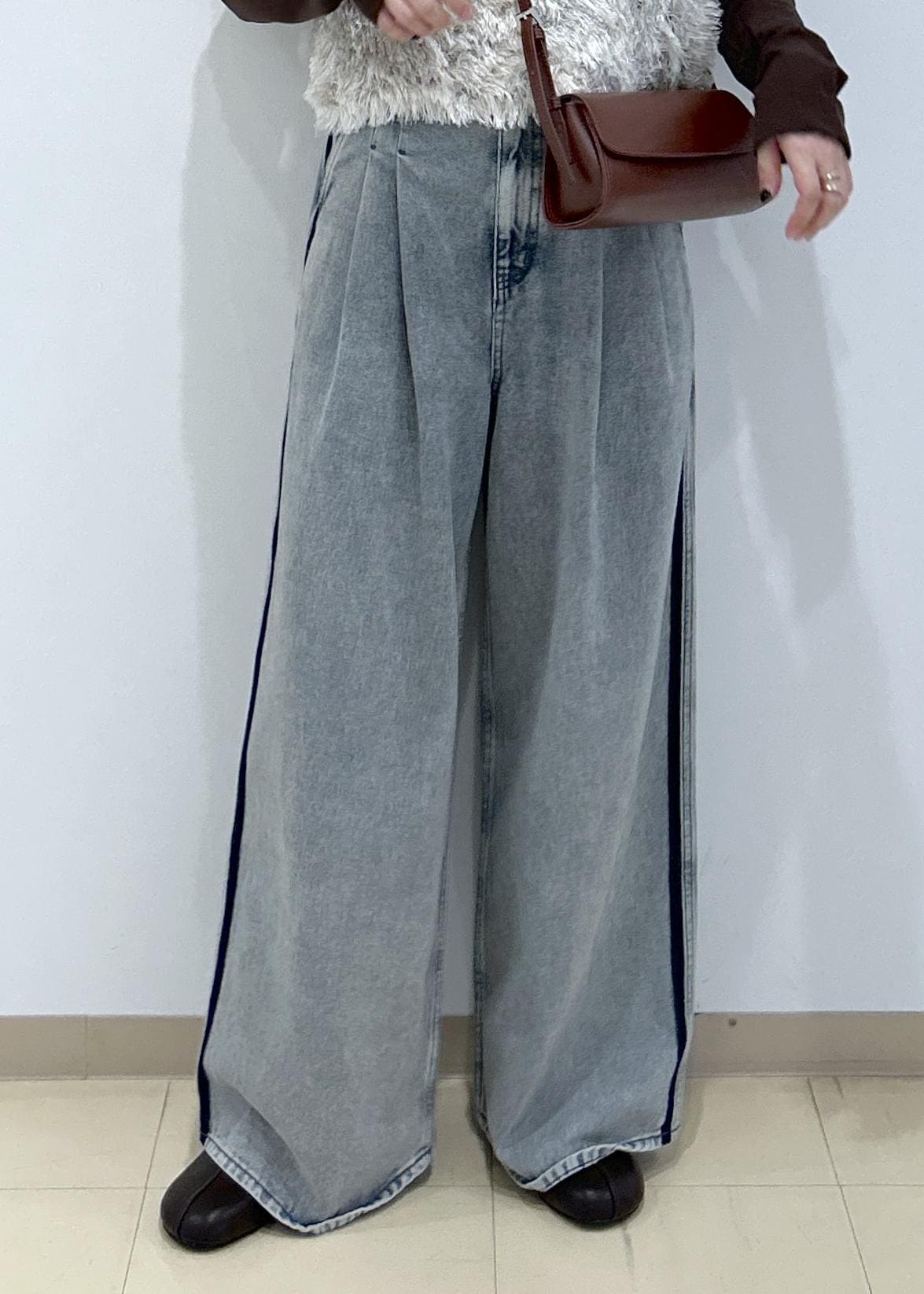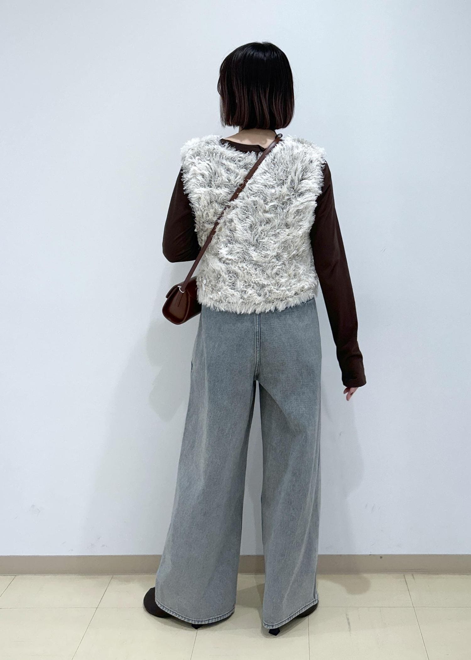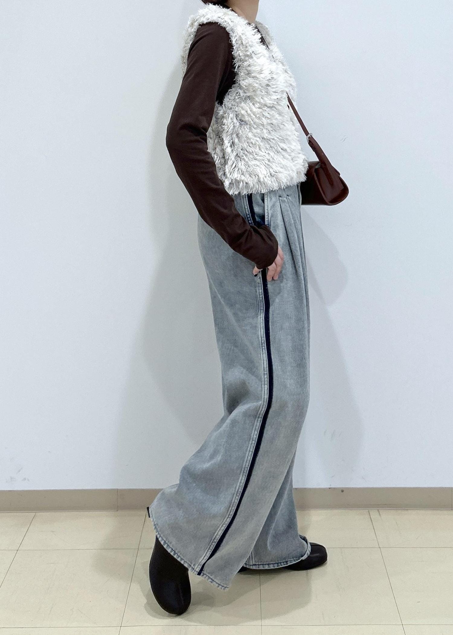 かなり太めのシルエットですが、ハイウエストで履けて腰回りがすっきりみえます。 -