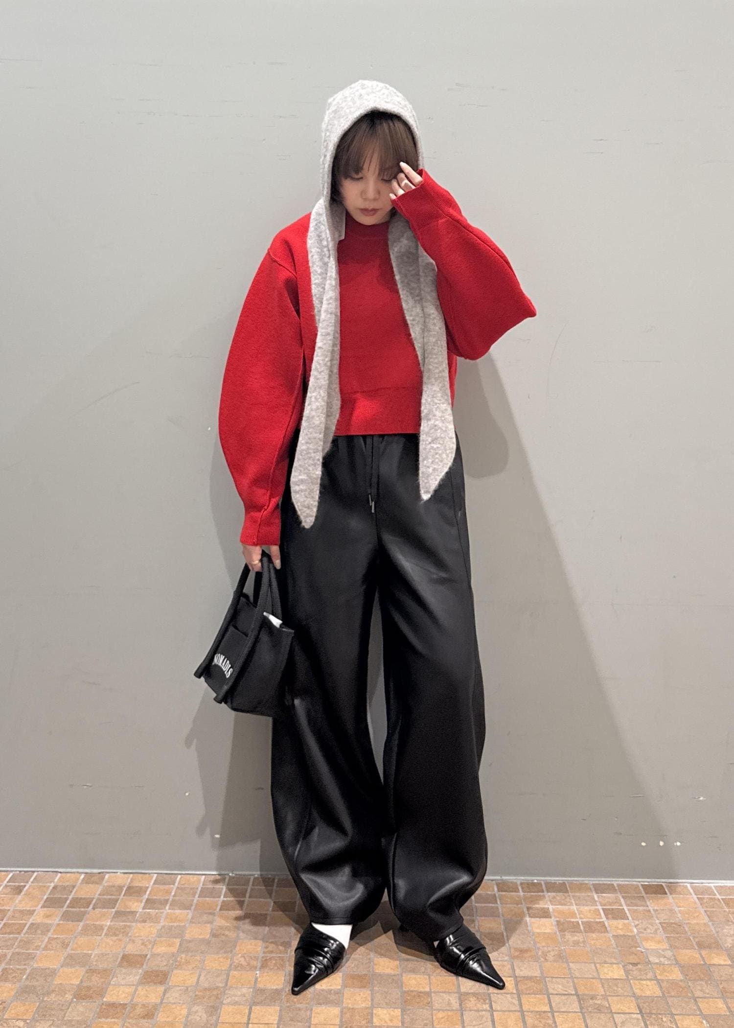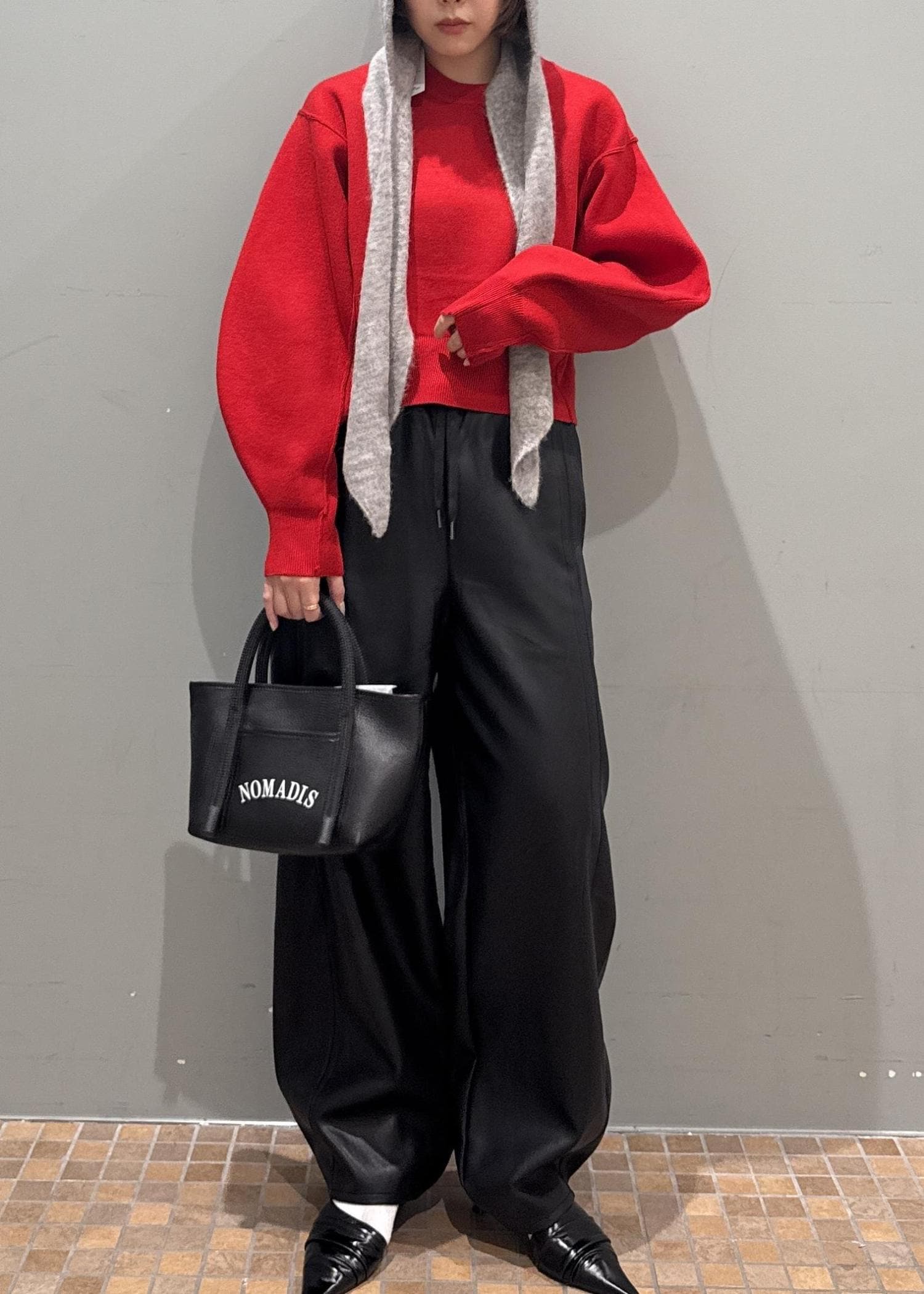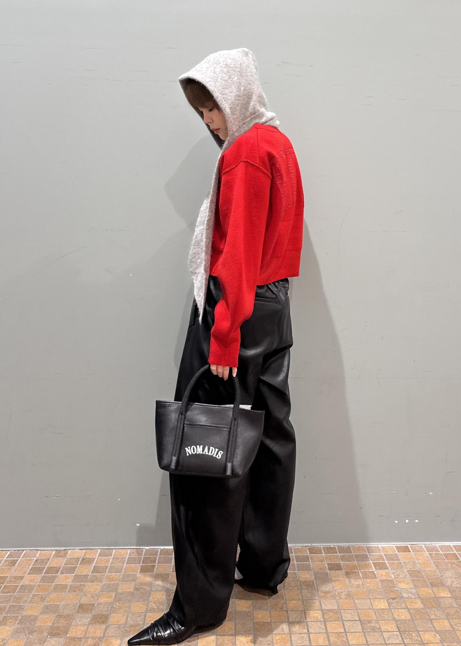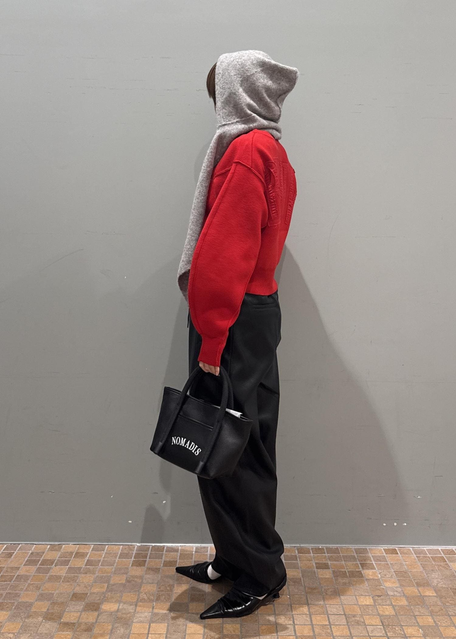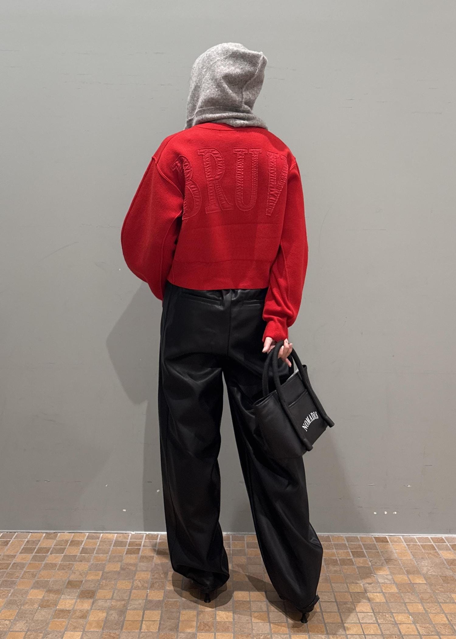 本日は鮮やかな赤が目を引くスウェットニットを着用しました。背中には同色でロゴがデザインされ、後ろ姿まで抜かりなく。きれいめな表面感のニット素材なので、カジュアルになりすぎず大人っぽく着られる一枚です。