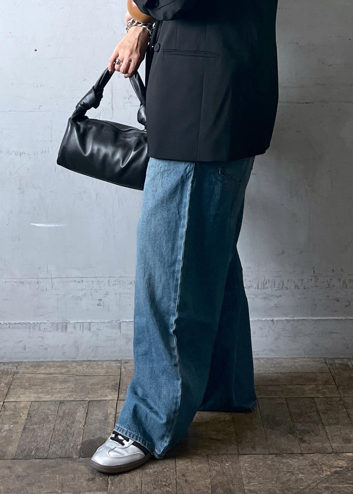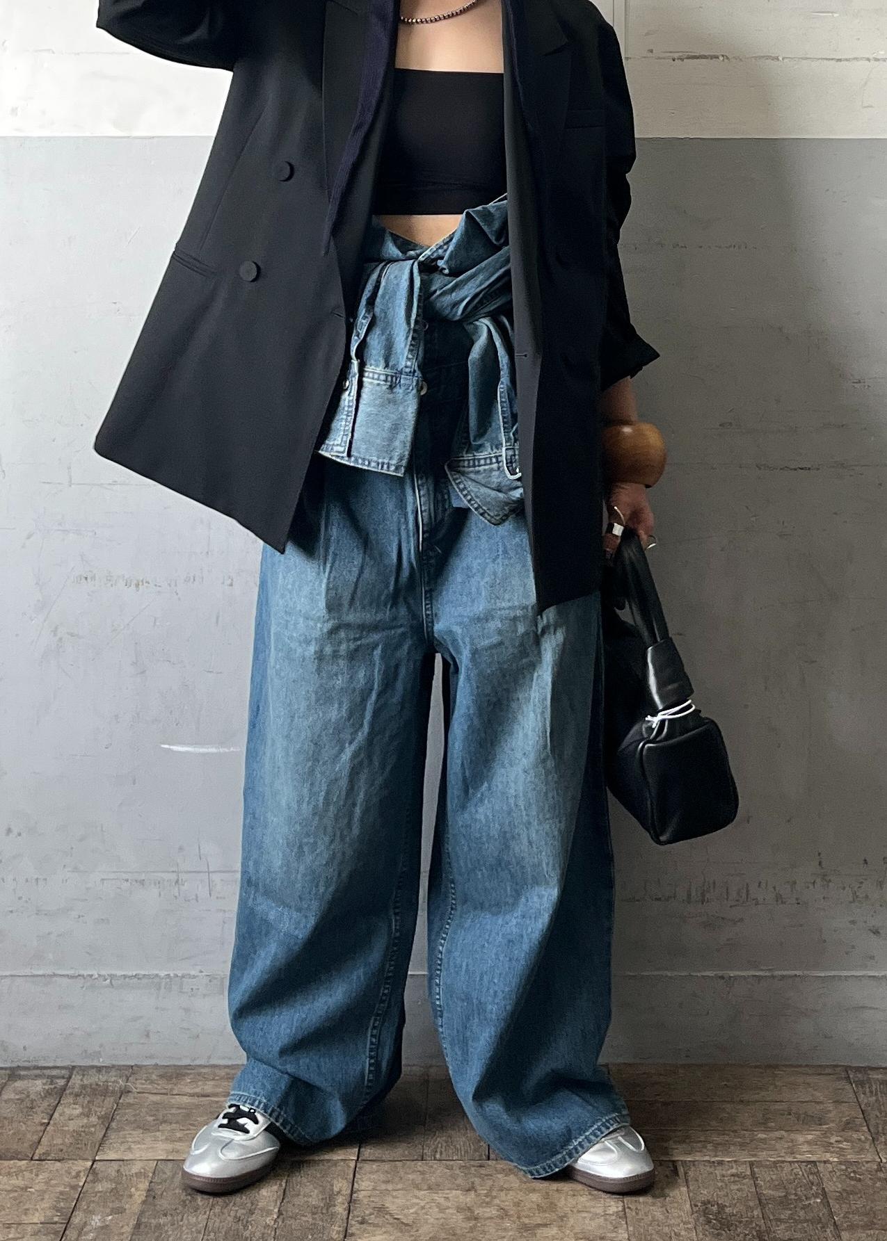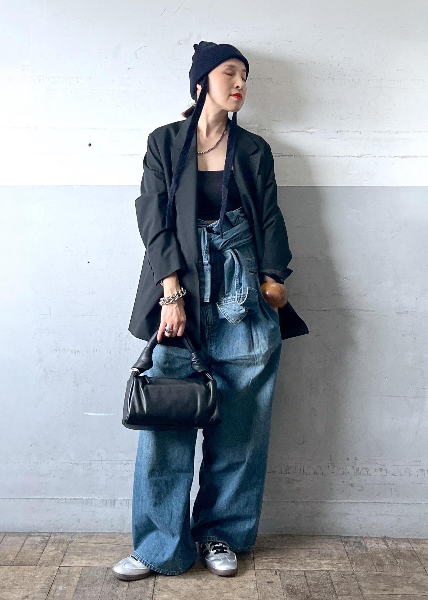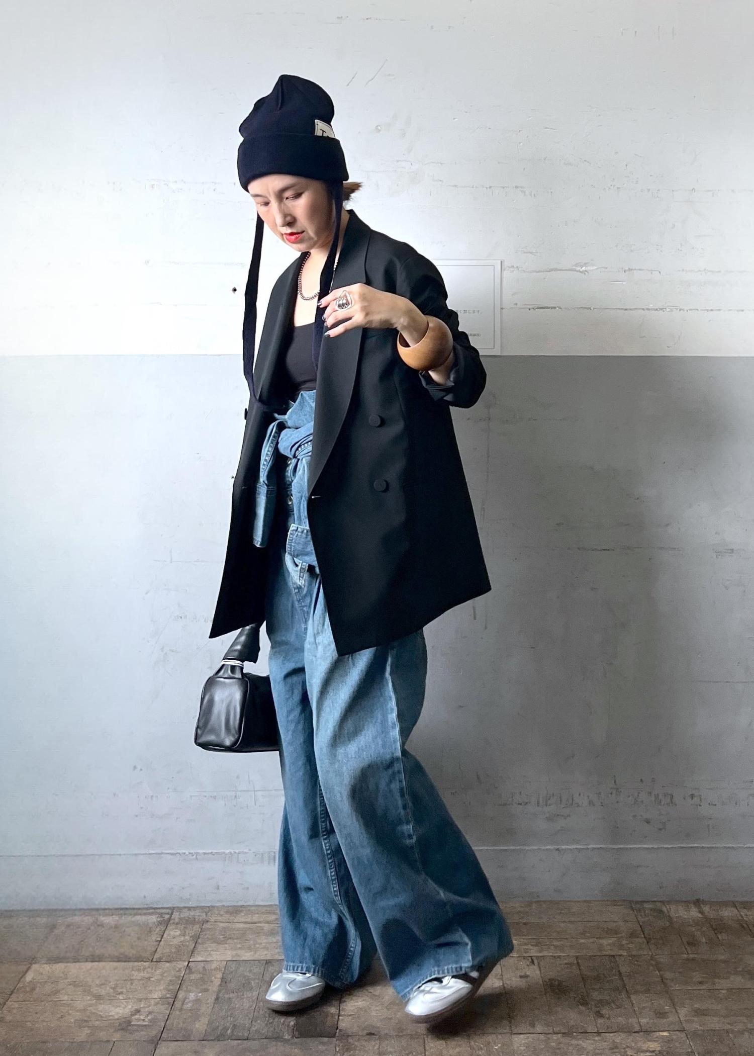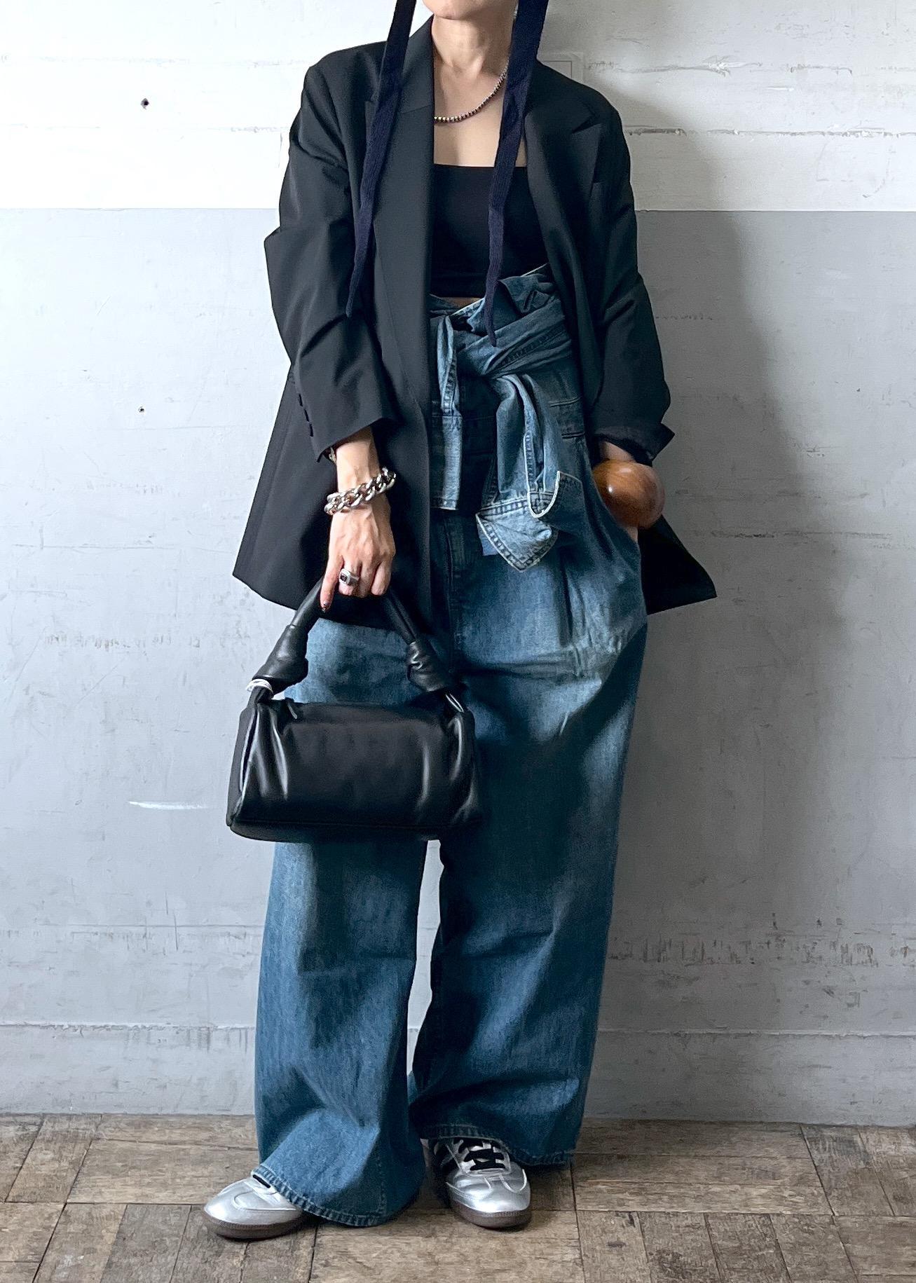 デニムシャツにデニムパンツでもいいけど、オーバーオールはペインターでワイドだからちょっと雰囲気が変わるんですよね!これからだと1枚で着てもいいし、こんな風にウエストにトップス部分をくくって着ても雰囲気が変わって◎。意外と大人っぽい着こなしができるのでオススメです♪