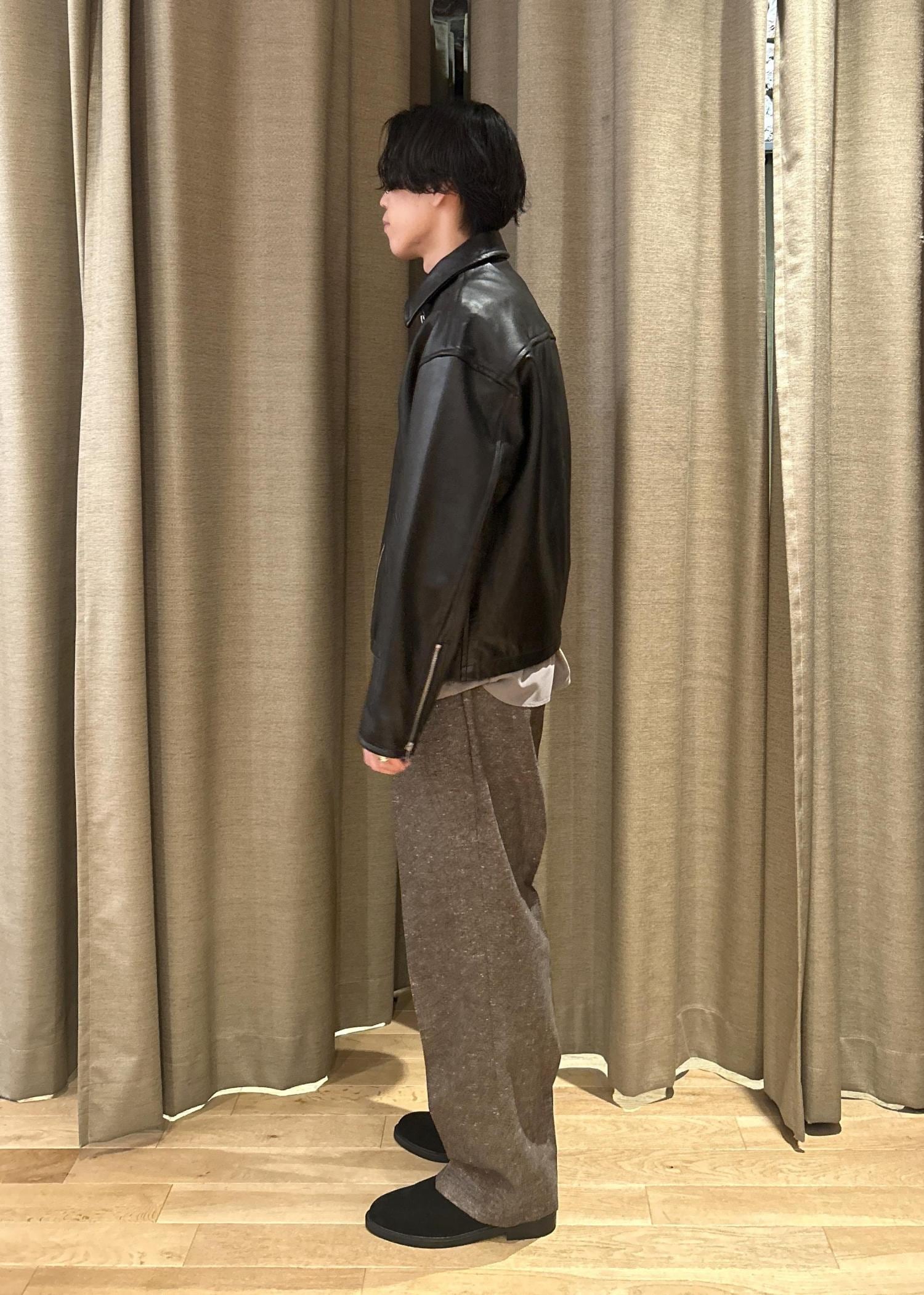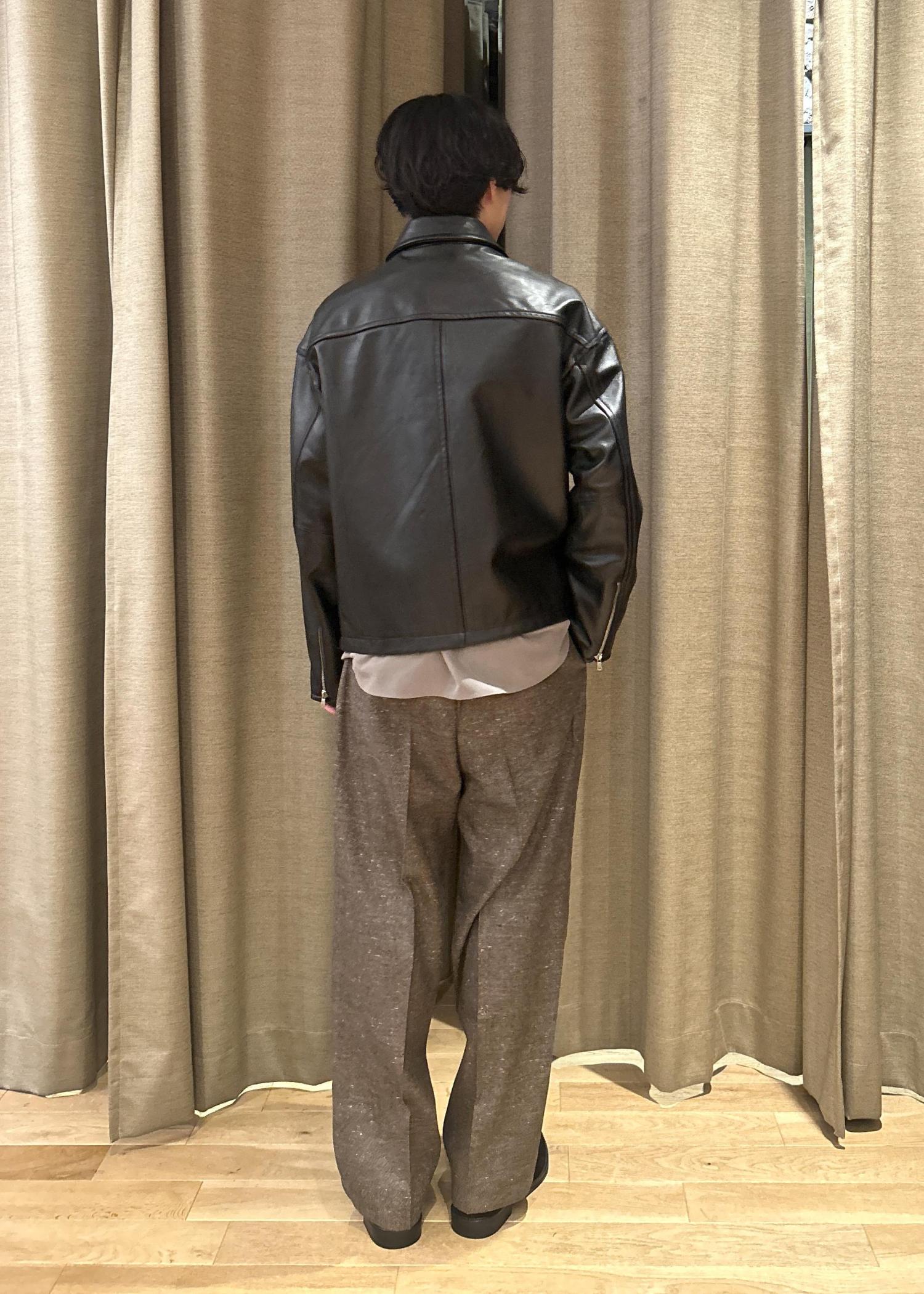 冬に近づくにつれてニットやスウェットなど厚手のアイテムを入れることができるので、寒くなってきたタイミングでもトレンド感のあるレザージャケットを着ることができます!
