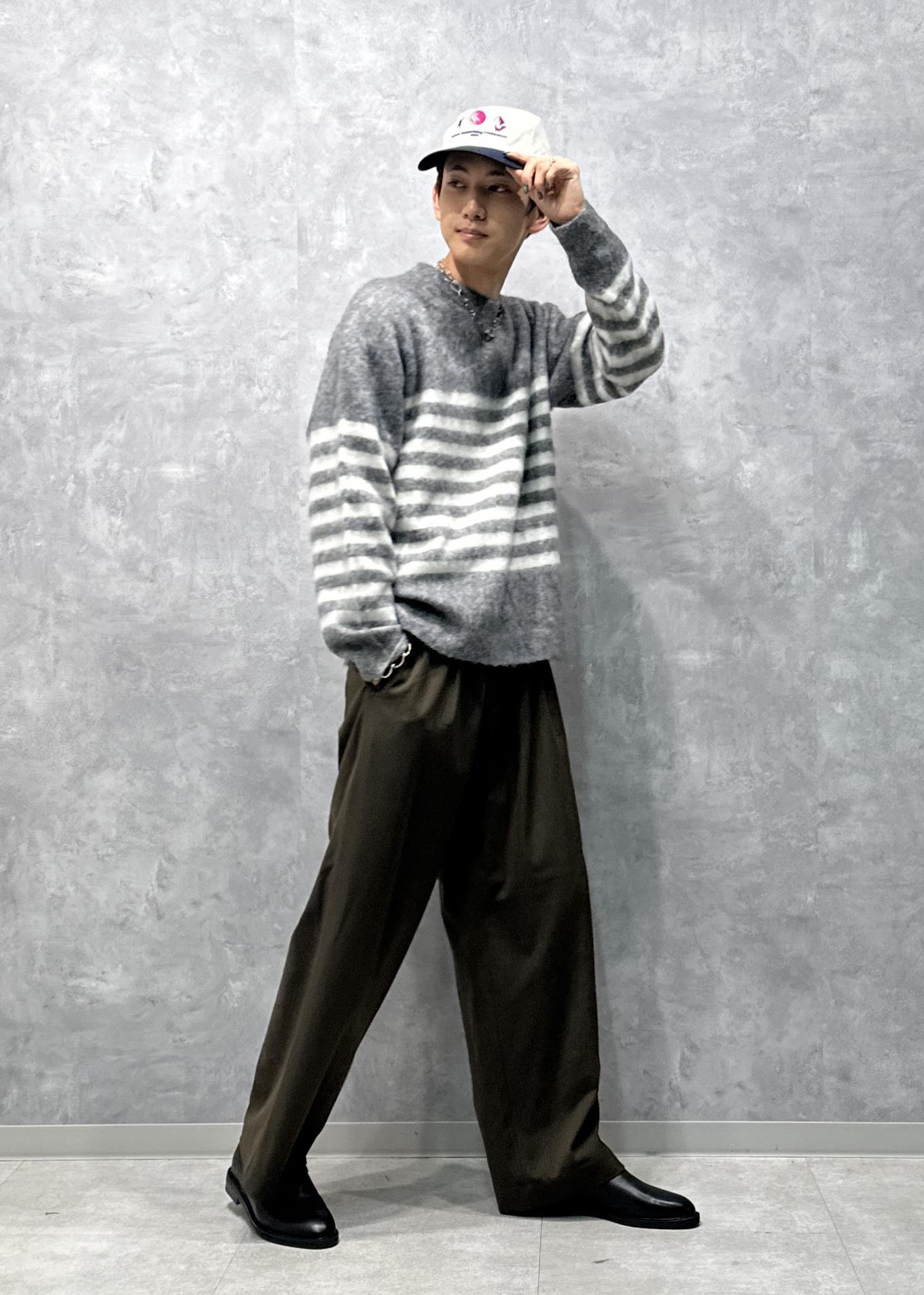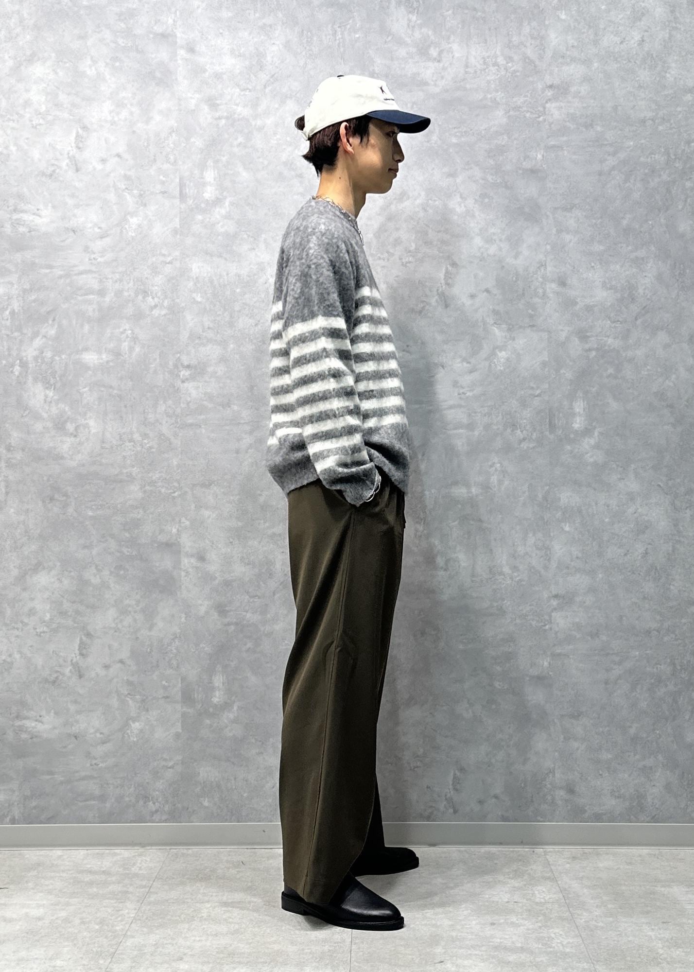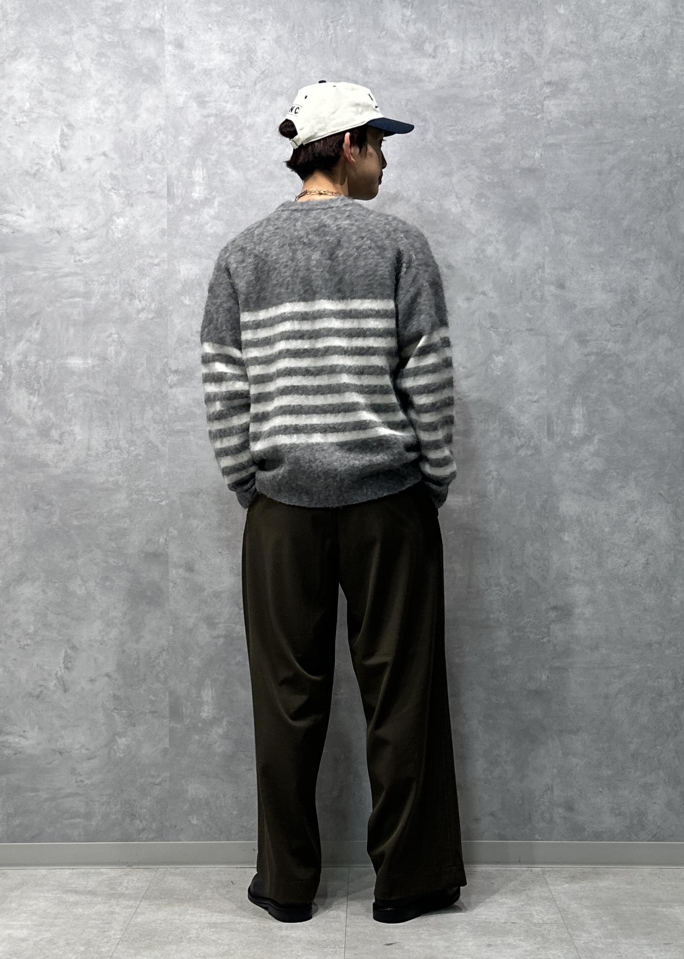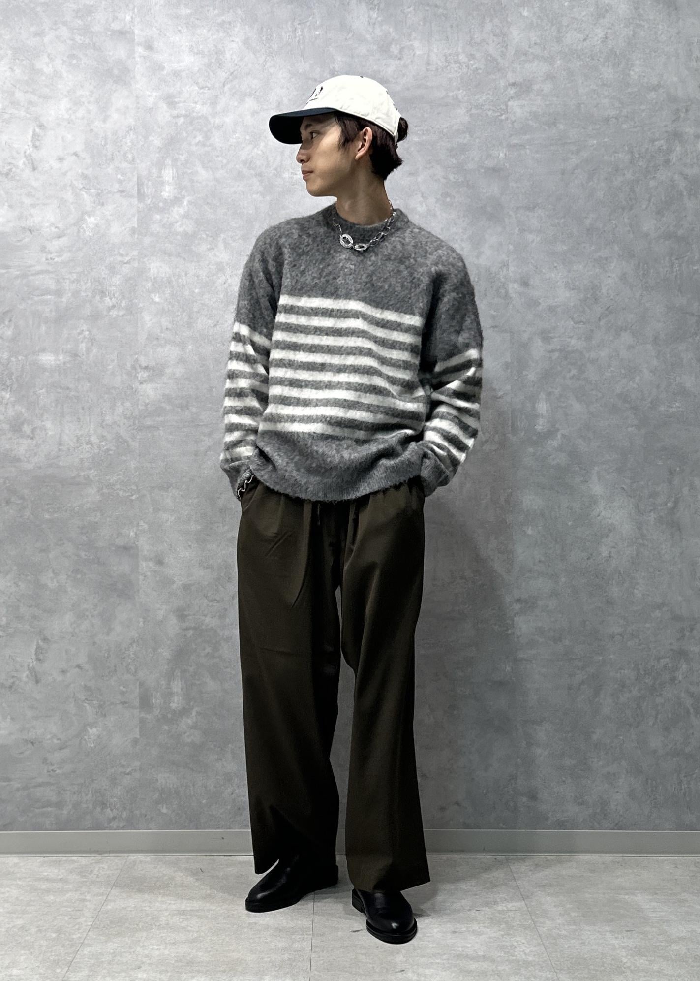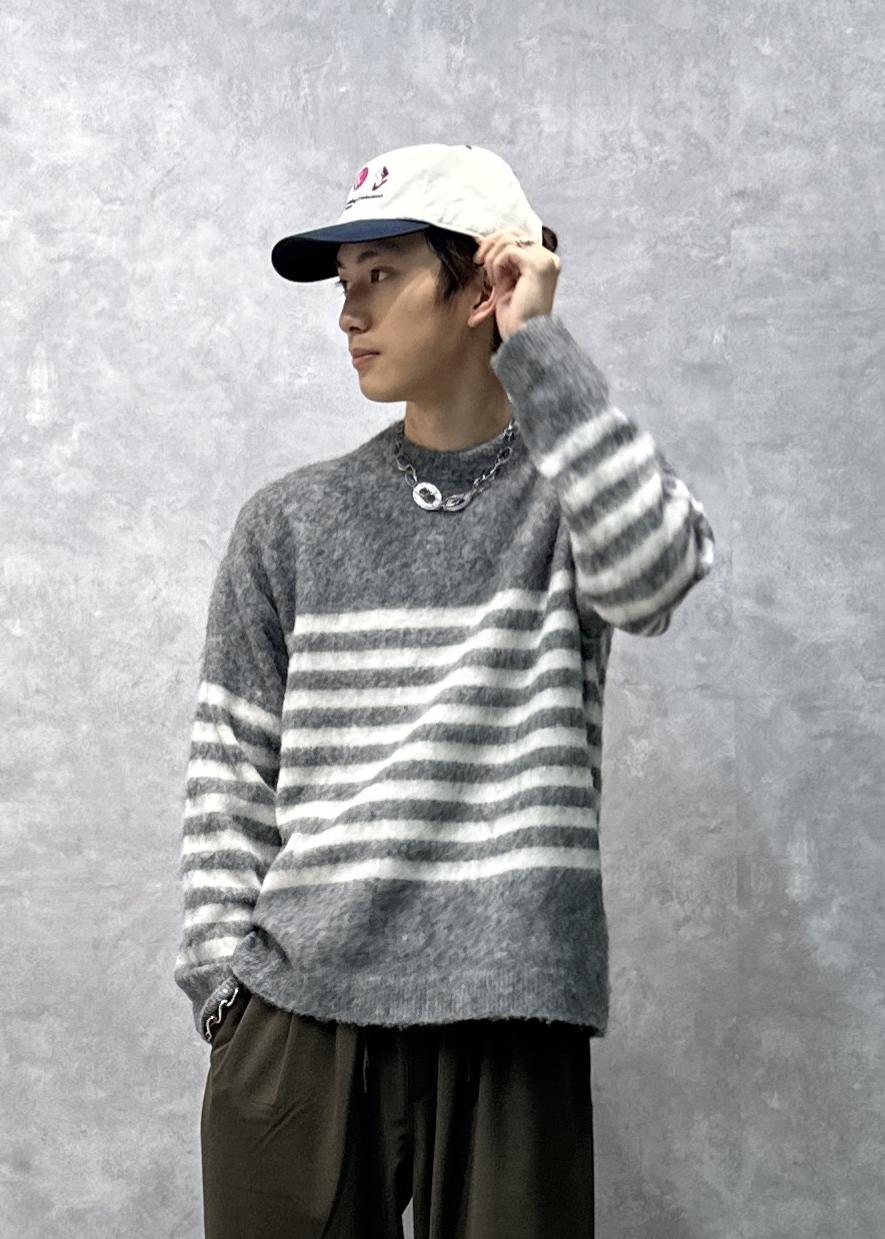 ボーダーニット。ハッキリというよりは優しい色合いをしていて合わせやすいです。暖かみのあるふわふわとした風合いです。ルーズなサイズ感で腕周りもやや広め。一枚で着ても様になるデザイン、シルエットです。