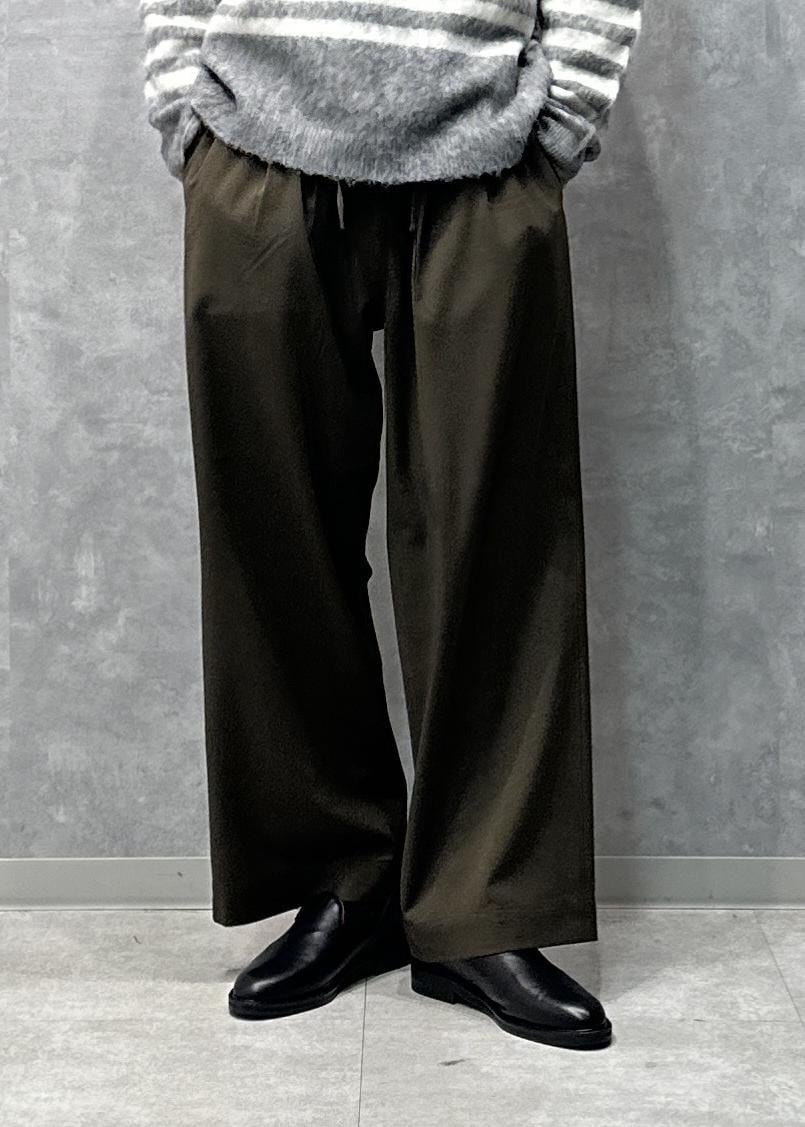 キレイなシルエットながらもドレッシーすぎずリラックス感のあるスラックスです。センタープレスがないのでちょっぴりカジュアル寄り。紐で調節するタイプなので程よいリラックス感があります。丈は少し長め。ダークトーンで合わせやすく、秋冬らしい風合いながらも通年履けるスラックスです。