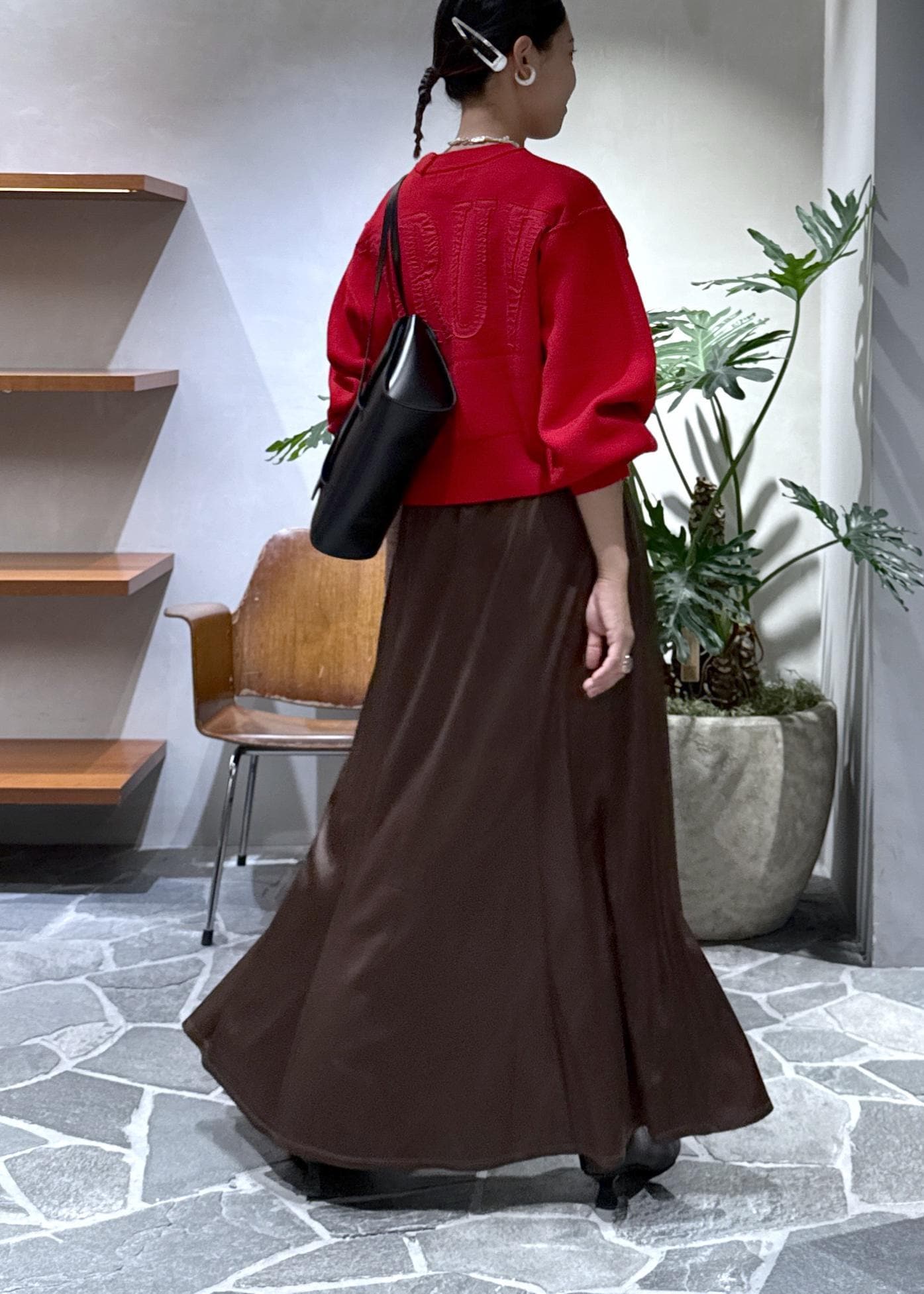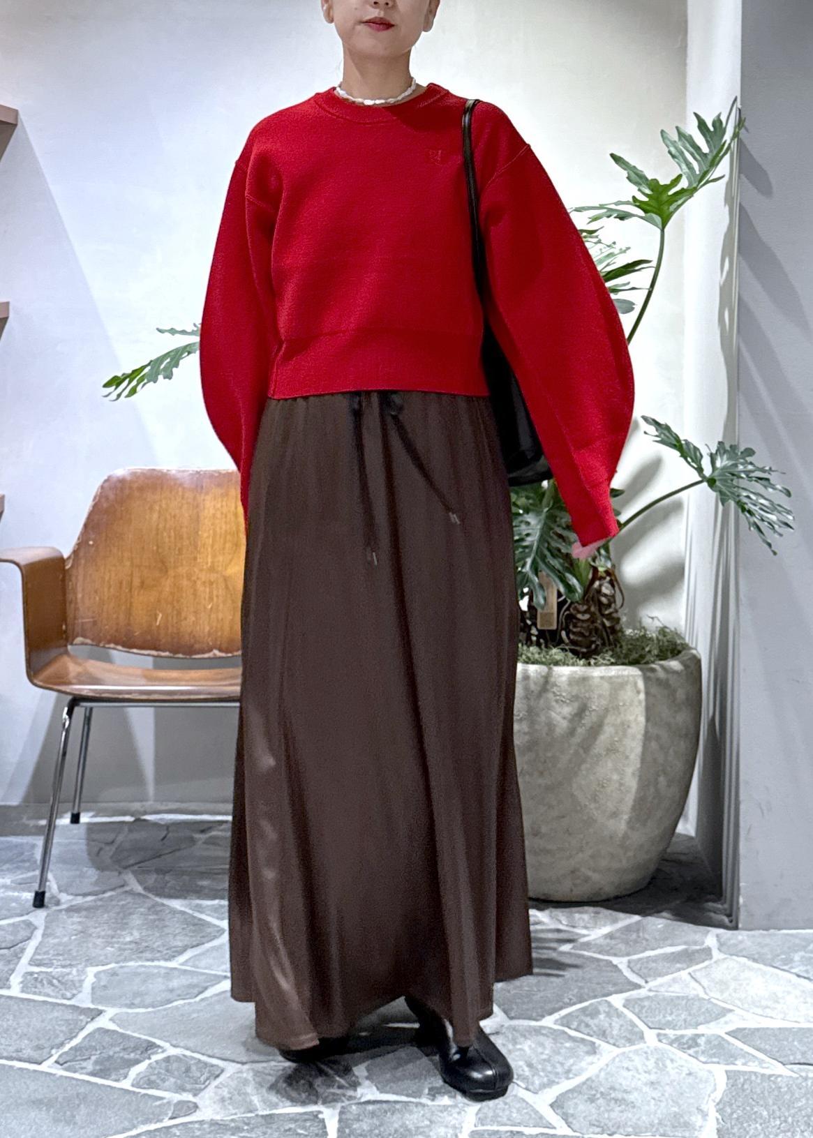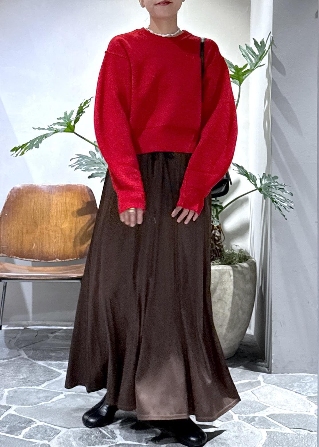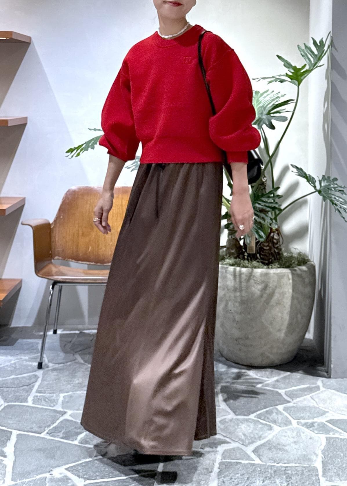 アームが丸くて、目線がきゅっと上がるのでロングスカートやワイドパンツのボリュームのあるボトムスと相性抜群です。