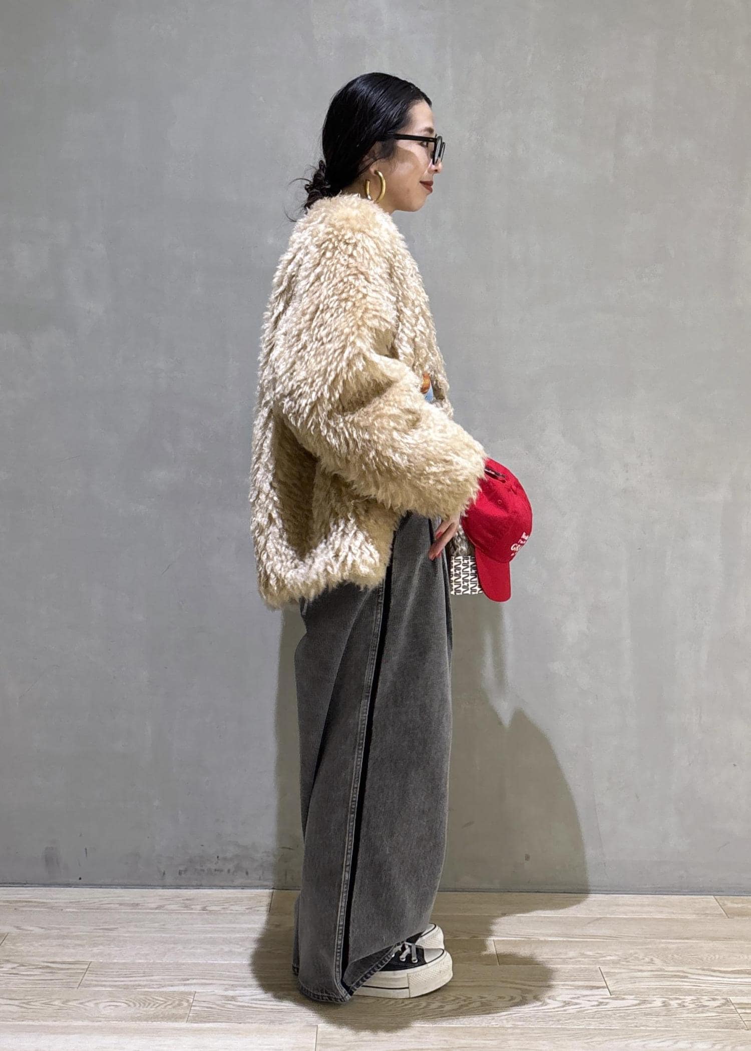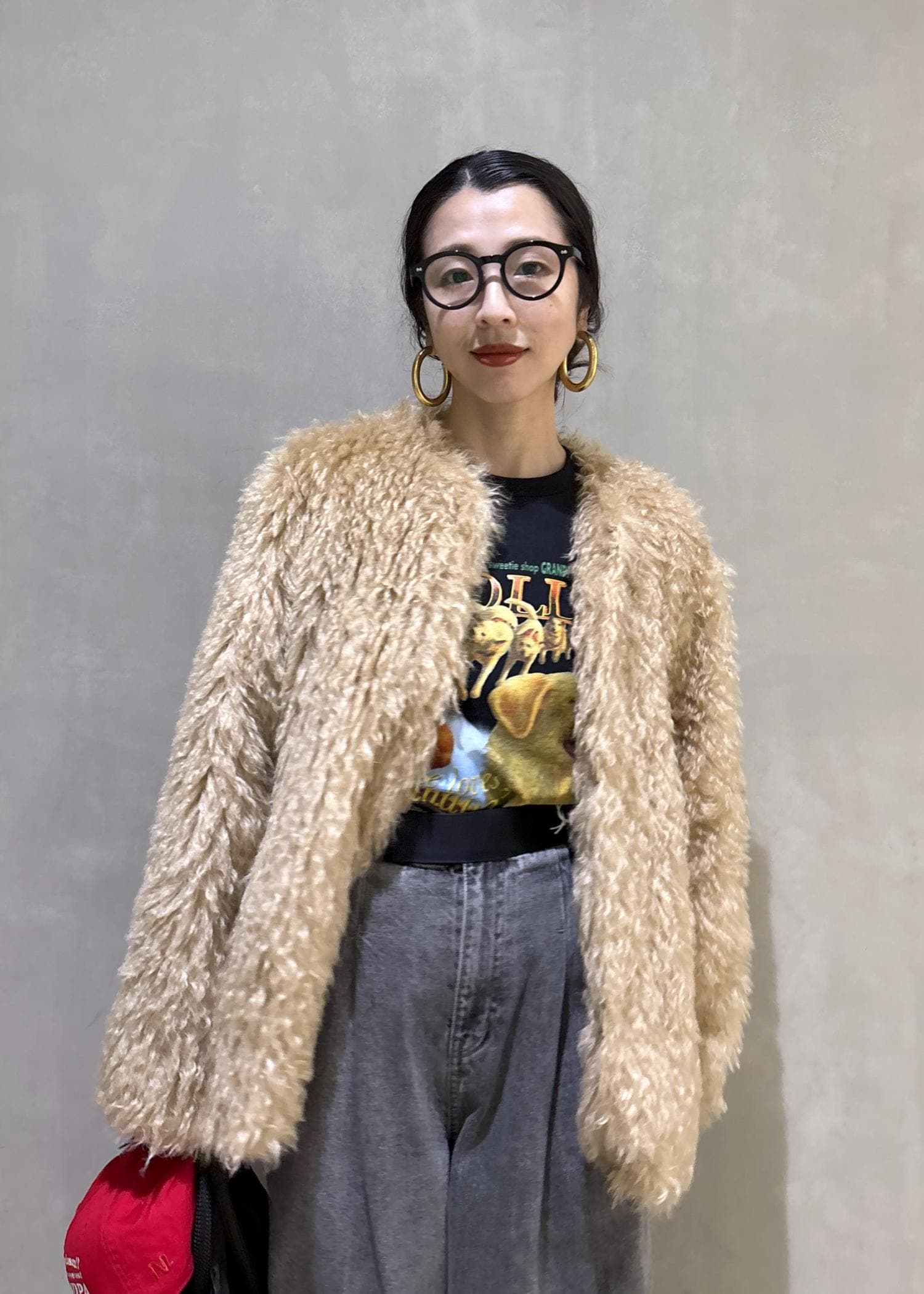 メンズライクで少し特徴的なわんちゃんのデザインのTシャツをグレーのデニムで少しメンズライクにカジュアルダウンしたスタイリングには、あえて毛足の長いファーのコートを合わせるのがおすすめ!