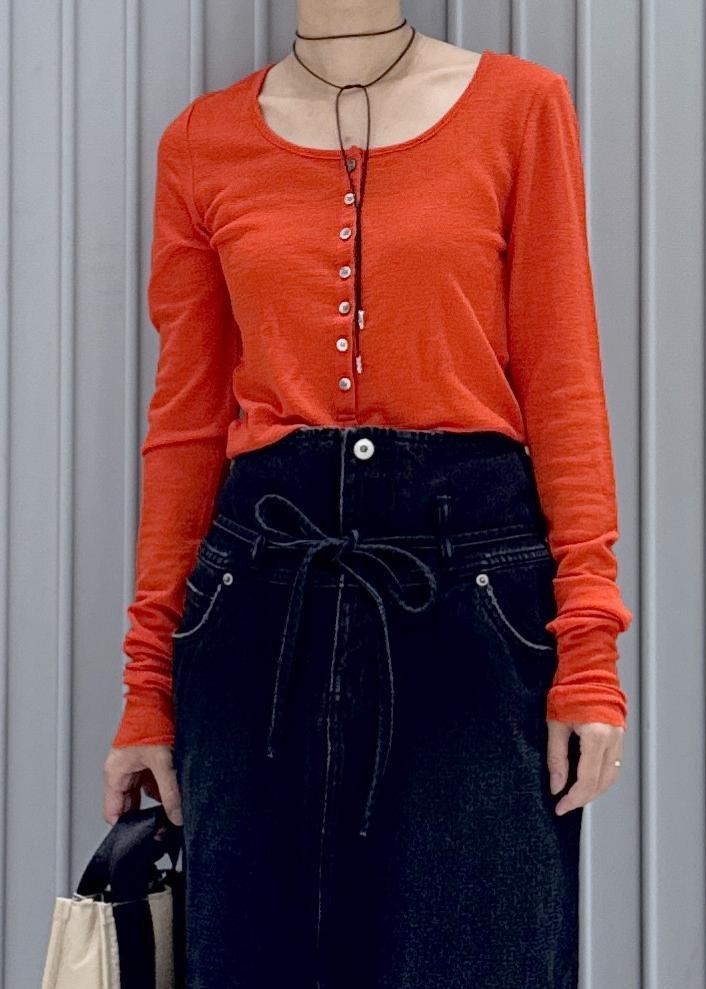 ADAM ET ROPÉ FEMMEヘンリーネックカットオフウールプルオーバーレッド / F¥14,300レビュー首の開きは広めです。インナーを入れてレイヤードしても、上からニットを重ねても、もちろんメインで着ても使い勝手の良いシンプルなカットソーです◎