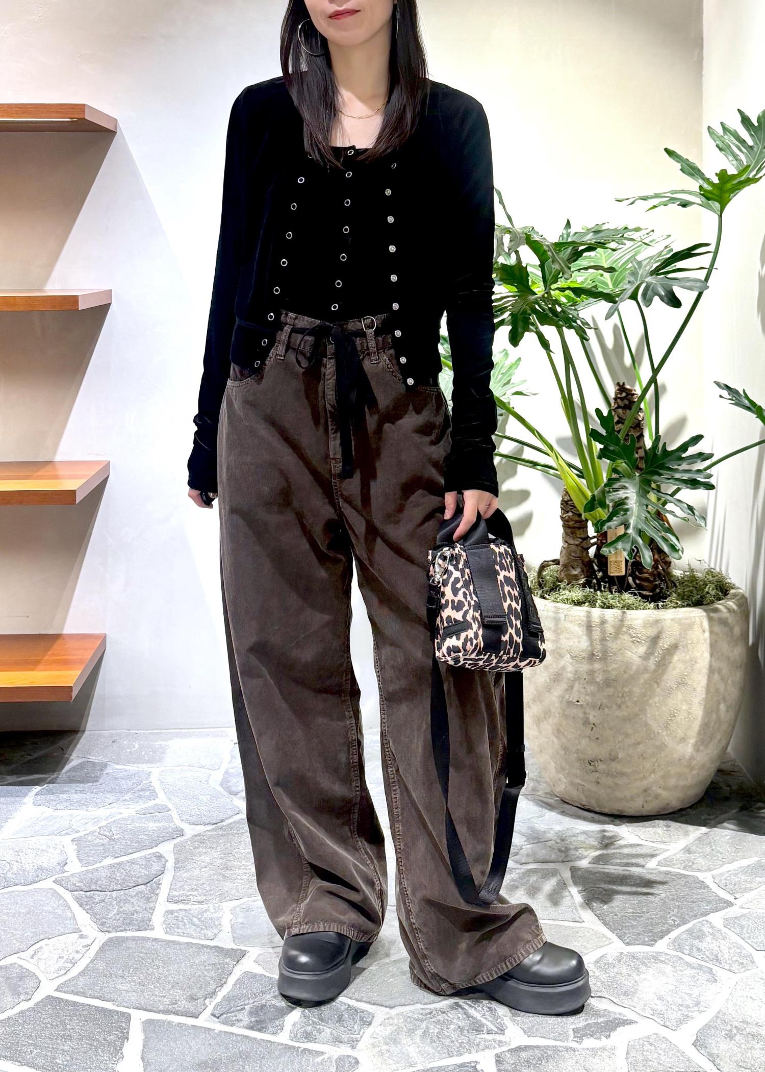 163センチで36サイズ着用。着丈はペタンコシューズでも擦らないくらいでしたが、ウエストはややゆとりがあるデザインなので、ハイウエストか腰履きか、ある程度は紐で調節可能です。