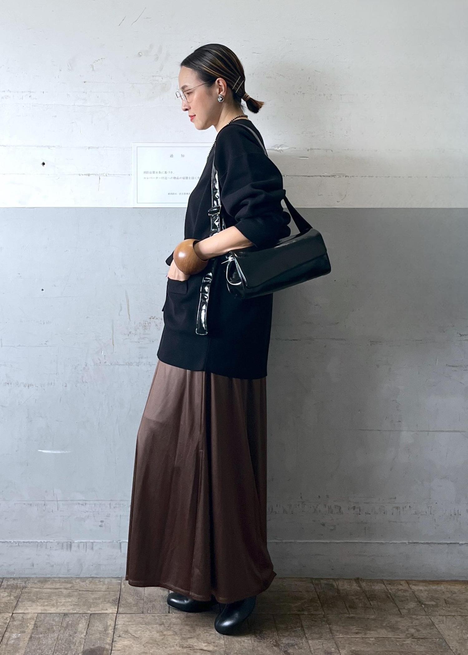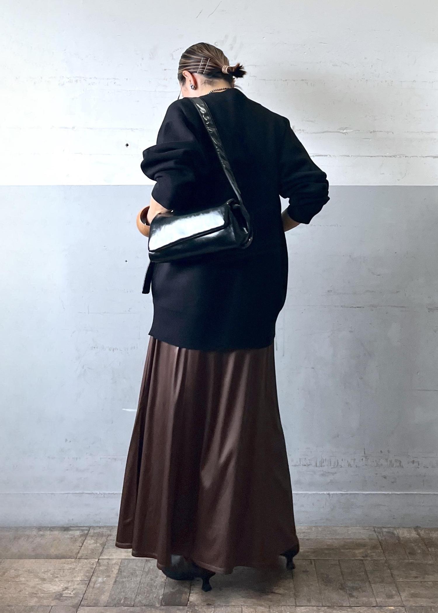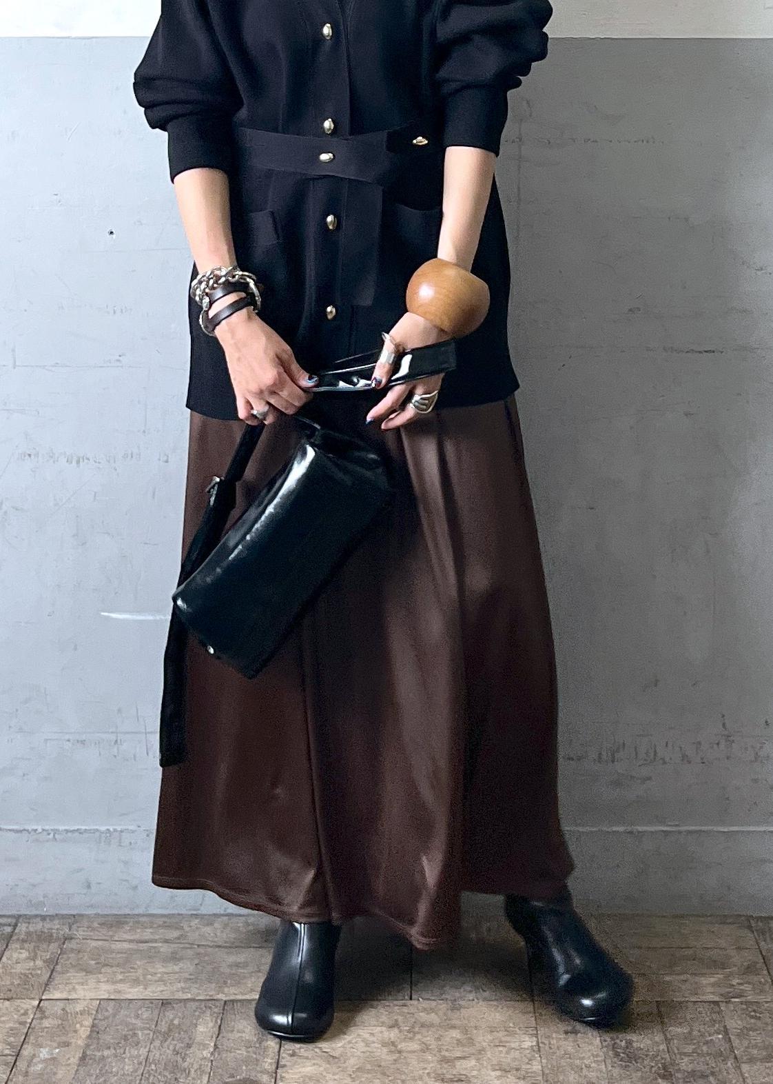 とにかく楽ちんスカート!素材は微光沢でレザーのような見え方です。程よい厚みでストンと落ち感があり大人っぽくスタイリングしていただけます。