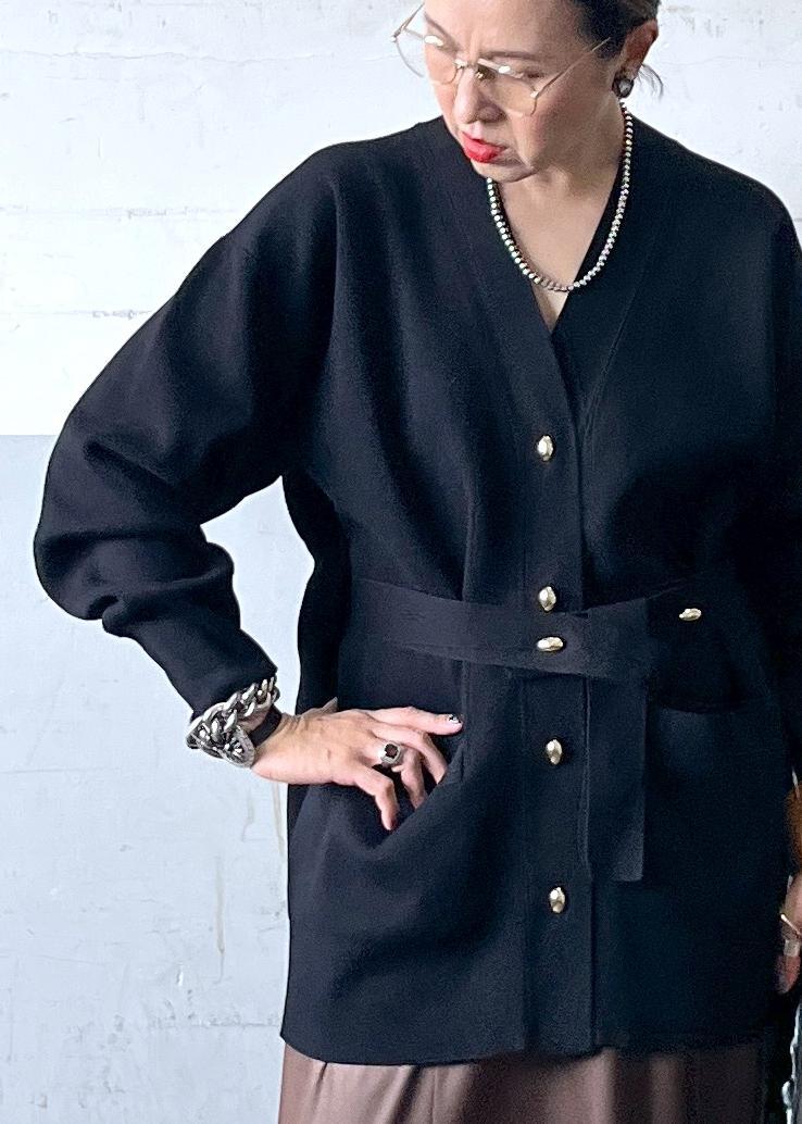 お尻が隠れる長さのベルテッドカーディガン。ウエストのベルトでスタイルアップも◎ ゴールドのボタンがポイントになって綺麗目な印象に。アームがゆったりしているのでインナー選びも簡単です。