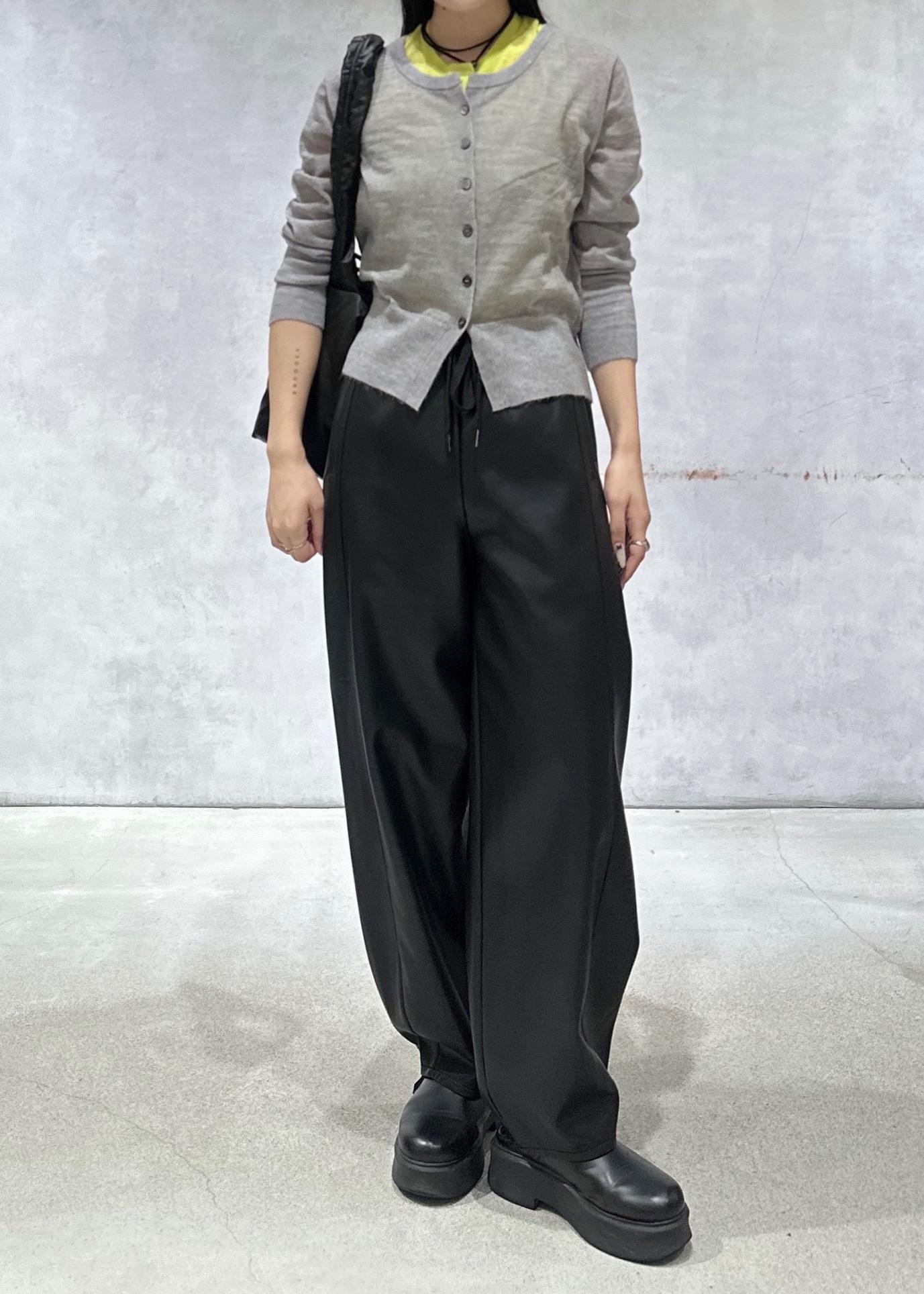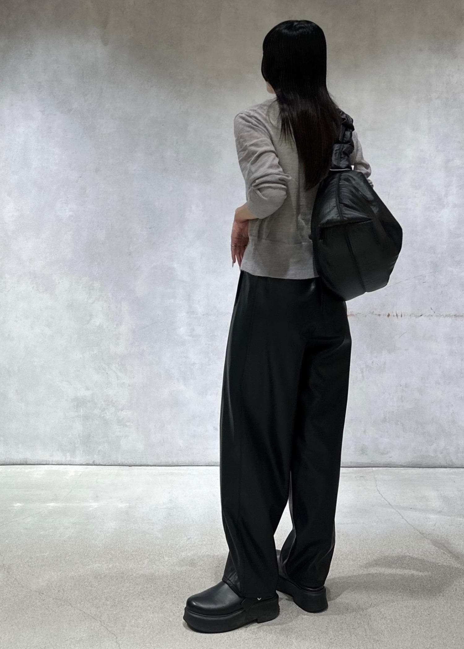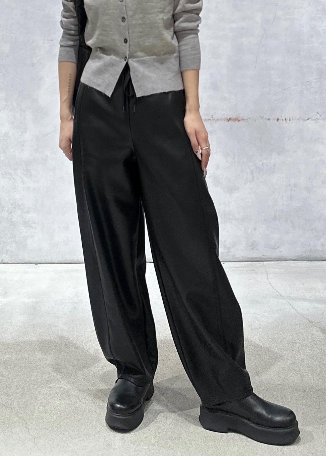 丸みのあるシルエットが特徴のシンセティックレザーパンツ。