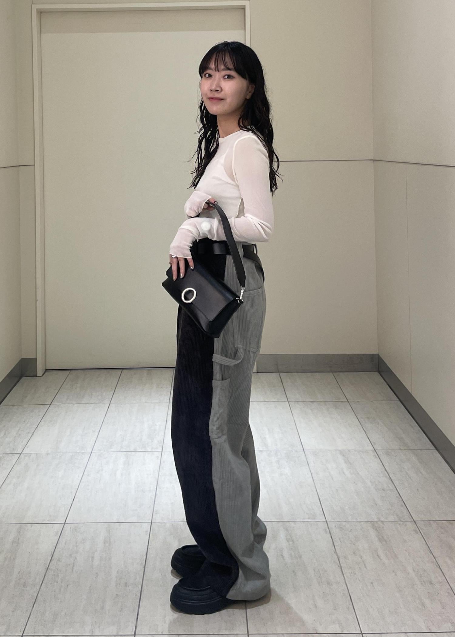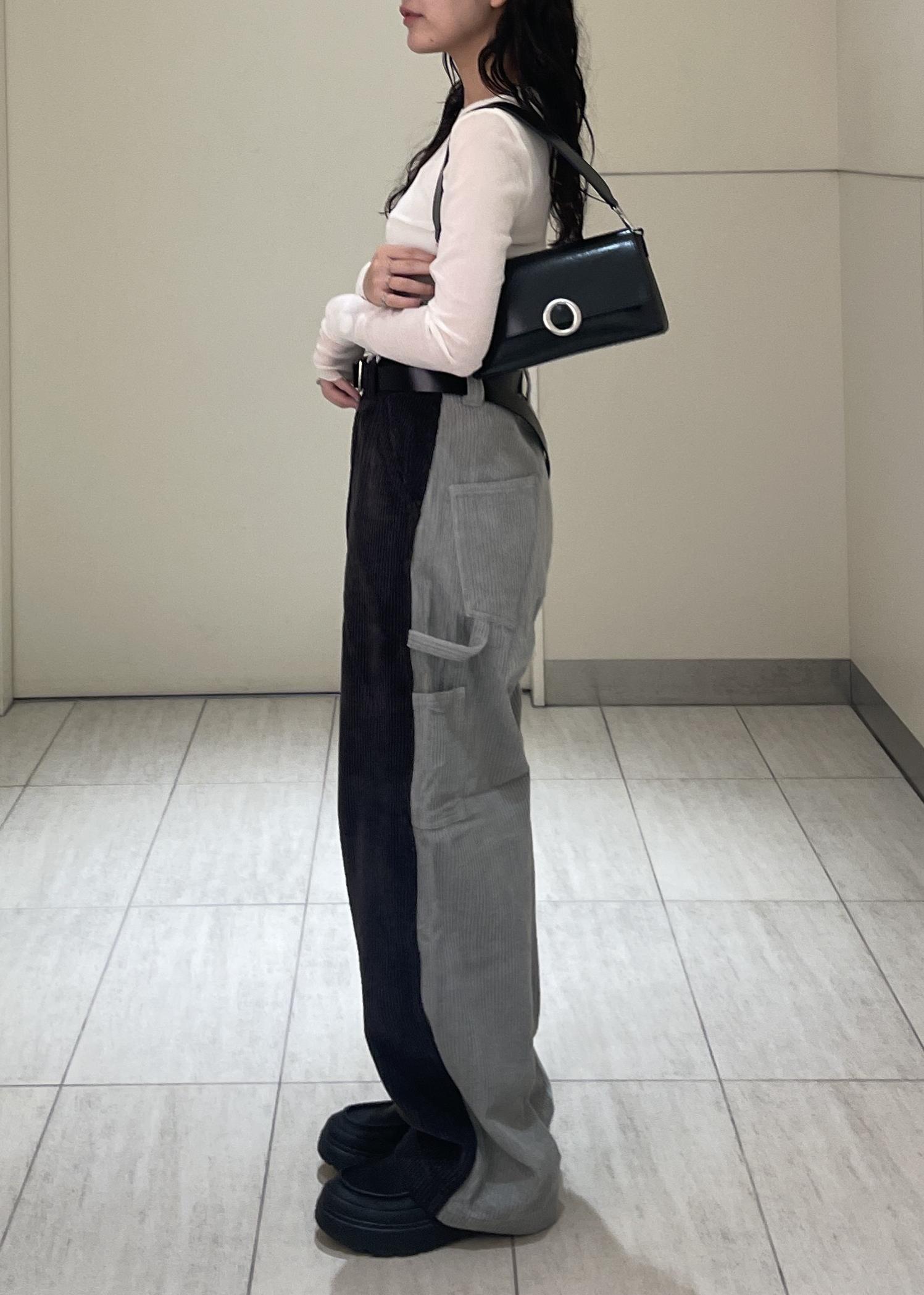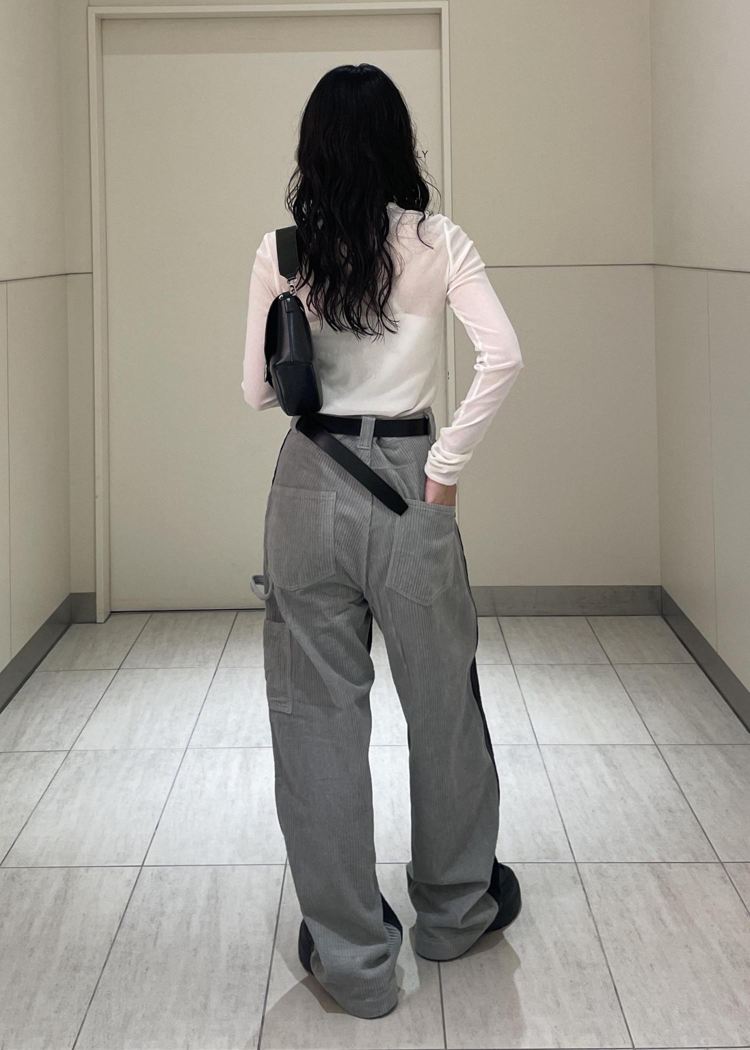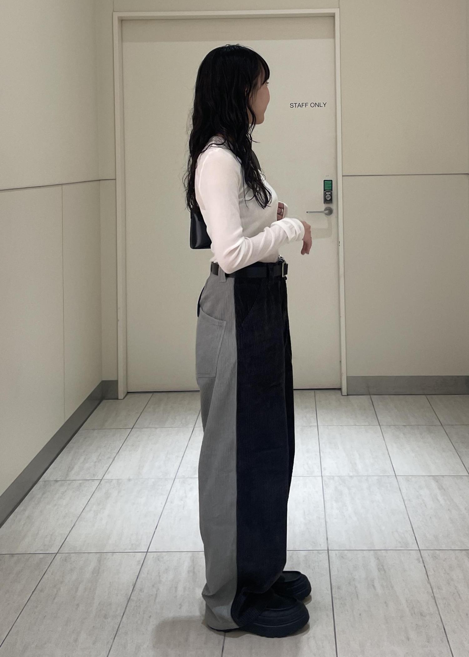 特にボトムスは前後バイカラーになっており特徴的なデザインがあるアイテムなのでシンプルになりがちな時に使っていただくだけで違った雰囲気を楽しめるのでおすすめです〜!
