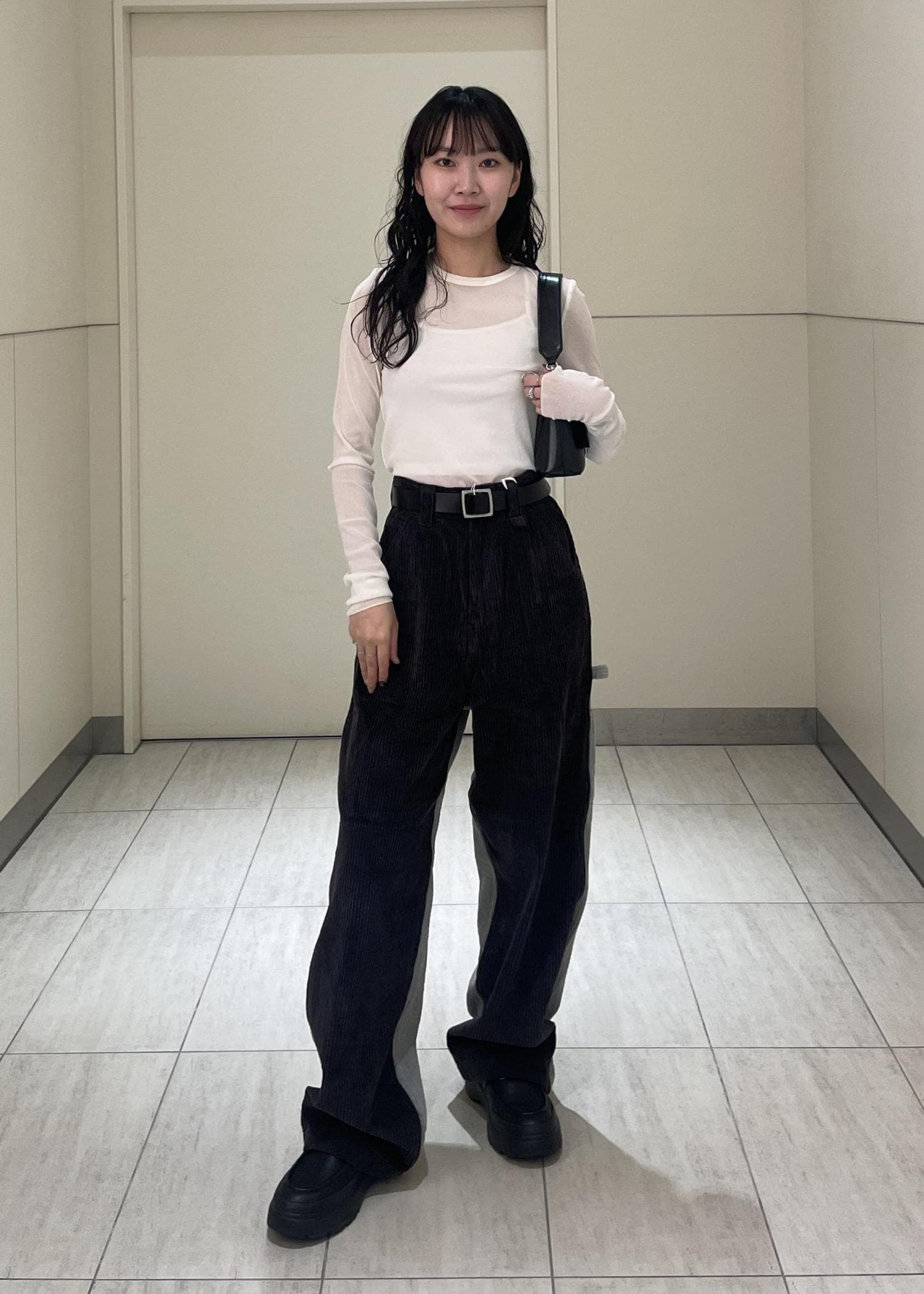 トップスはベロア調のトップスにボトムスはコーデュロイのパンツを合わせて季節感を感じられる素材でシンプルなコーデにしています。