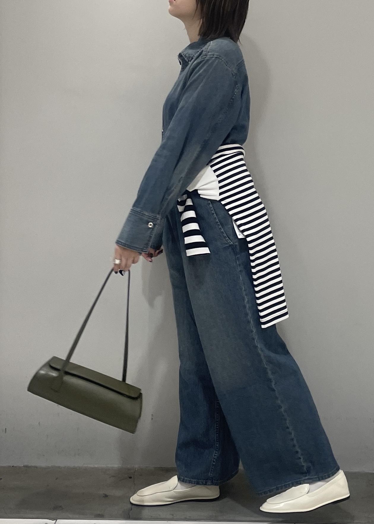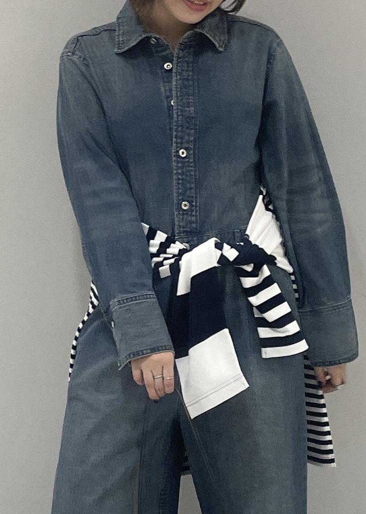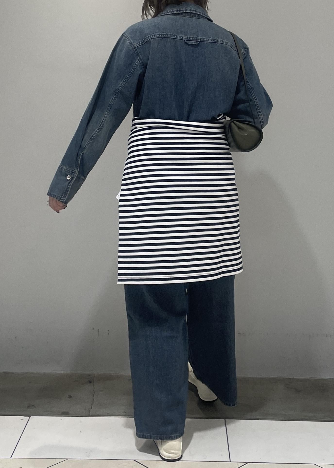 ウエストマークとして、ボーダー柄が可愛いTシャツを巻いて個性的かつおしゃれに仕上げています☺︎