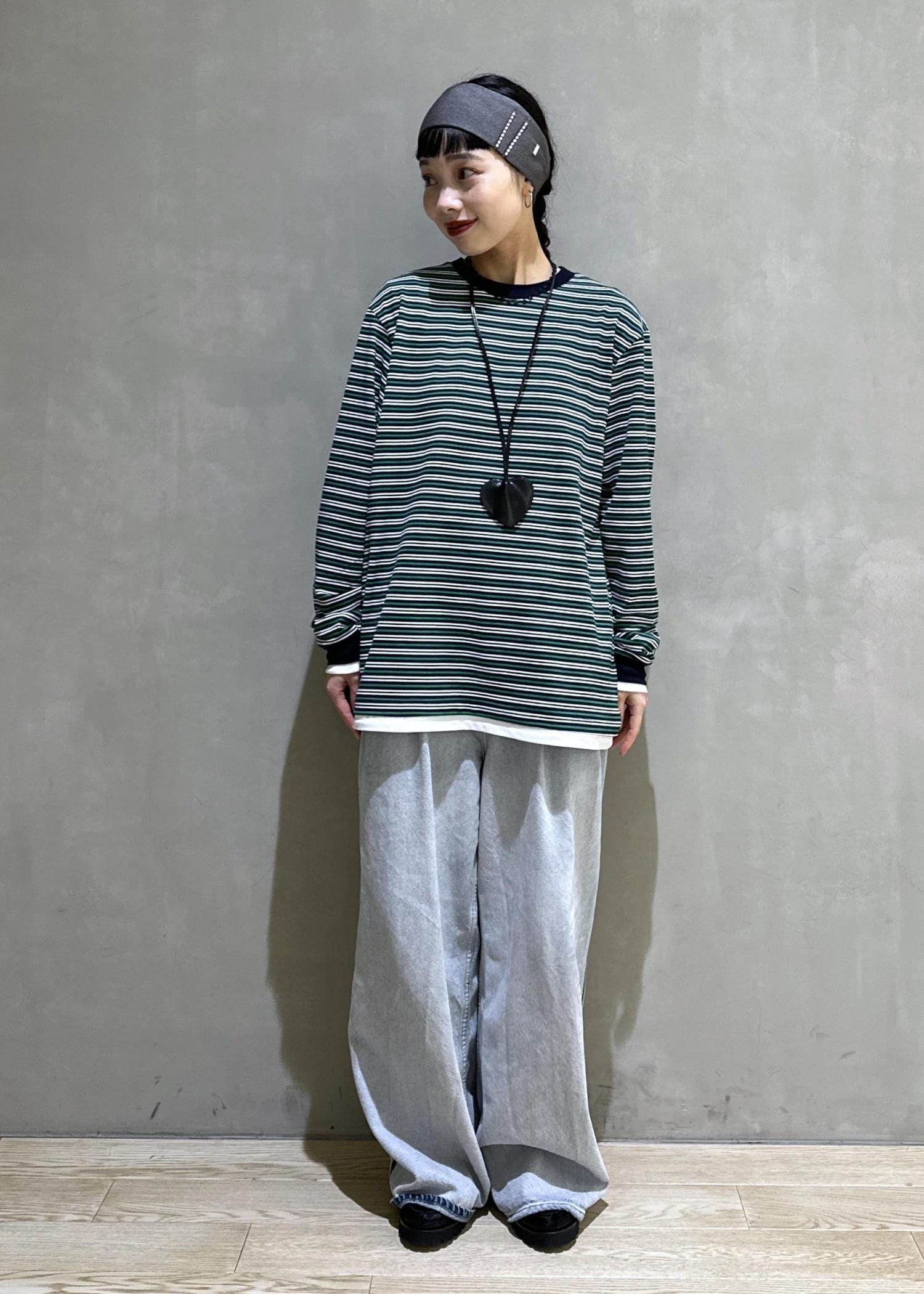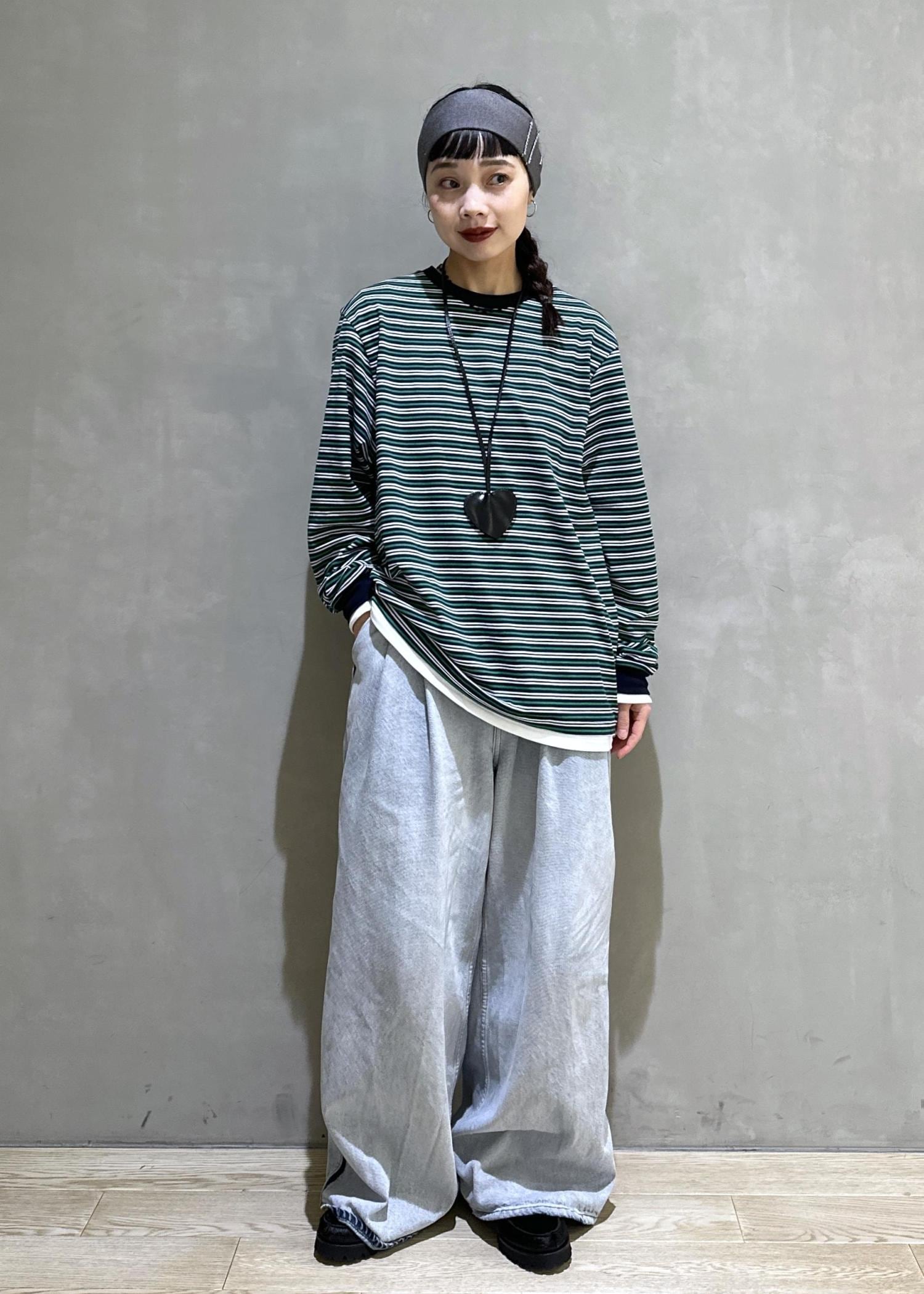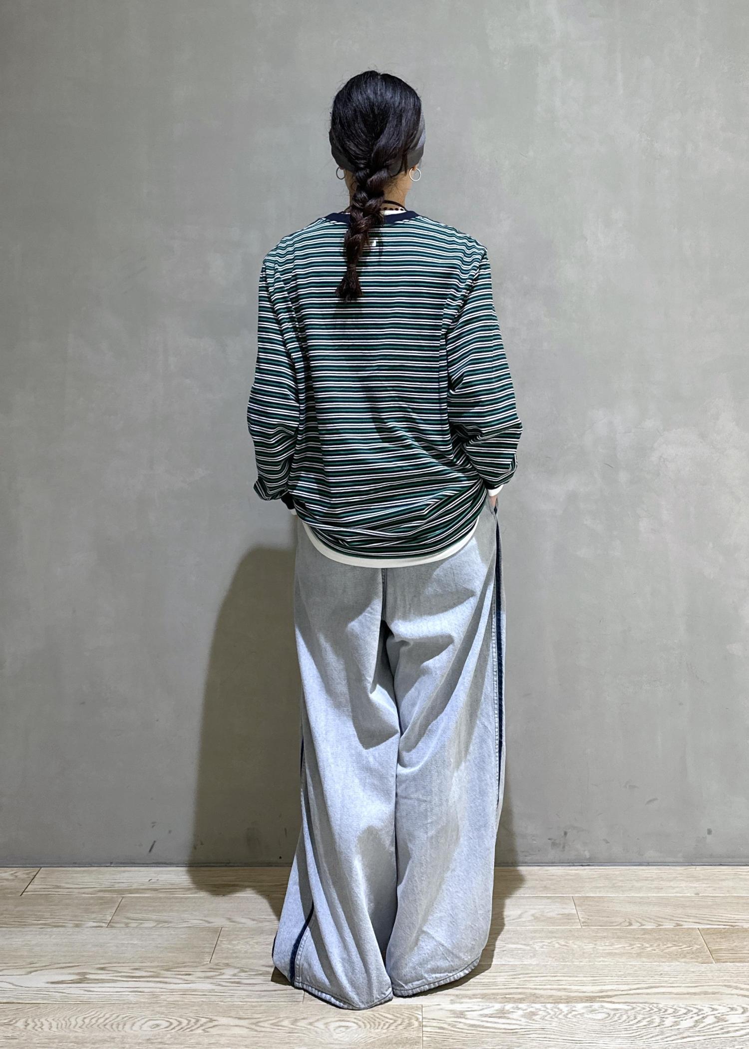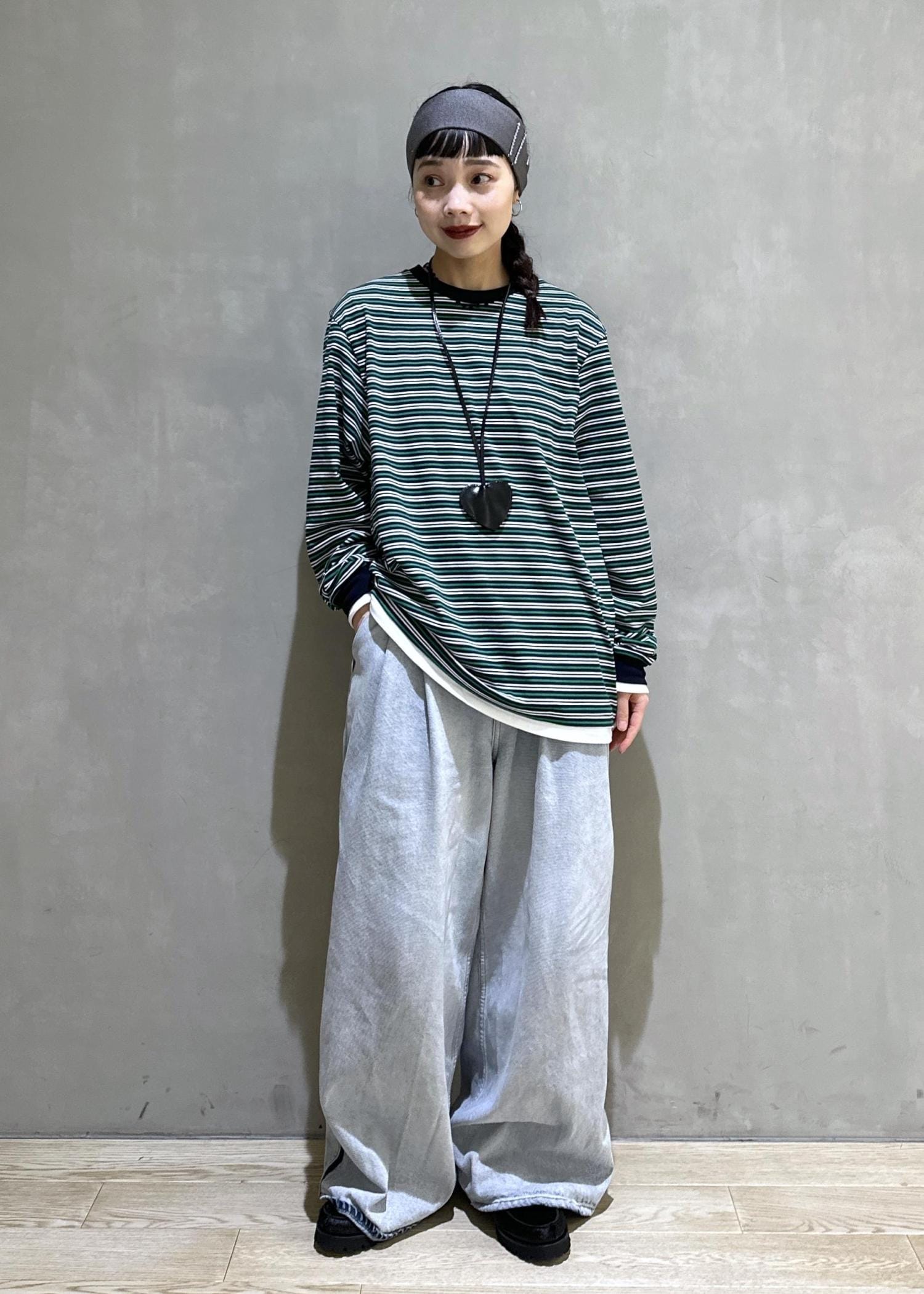 ゆるっと履きたかったため、36サイズを着用しています。裾丈短めに作っているため、小柄な方も34サイズであればちょうど良い丈間で履いて頂けます。